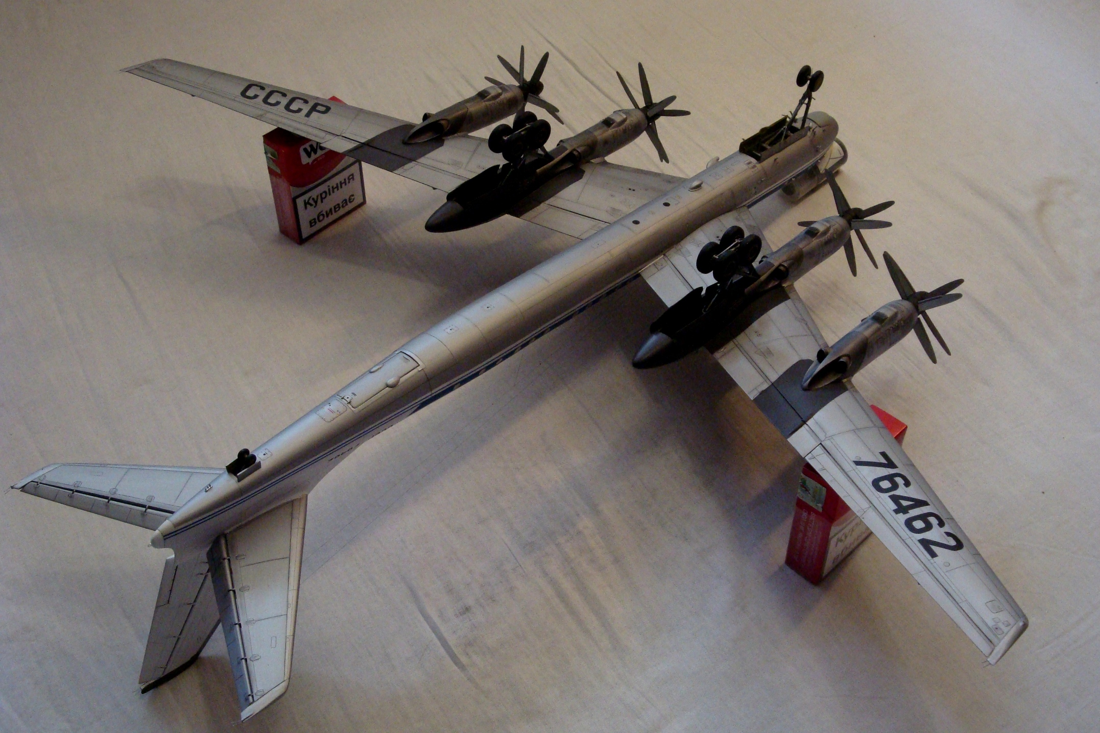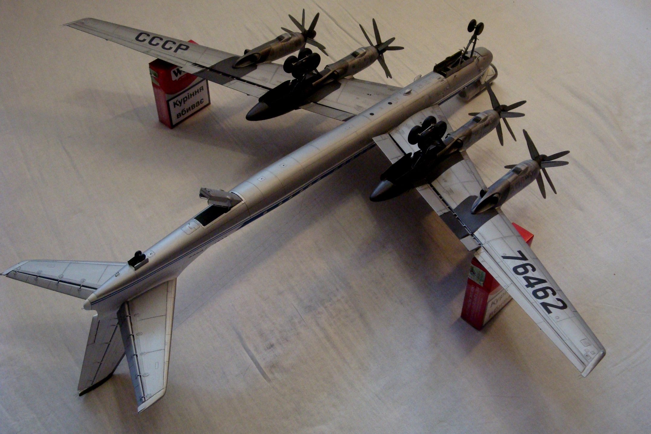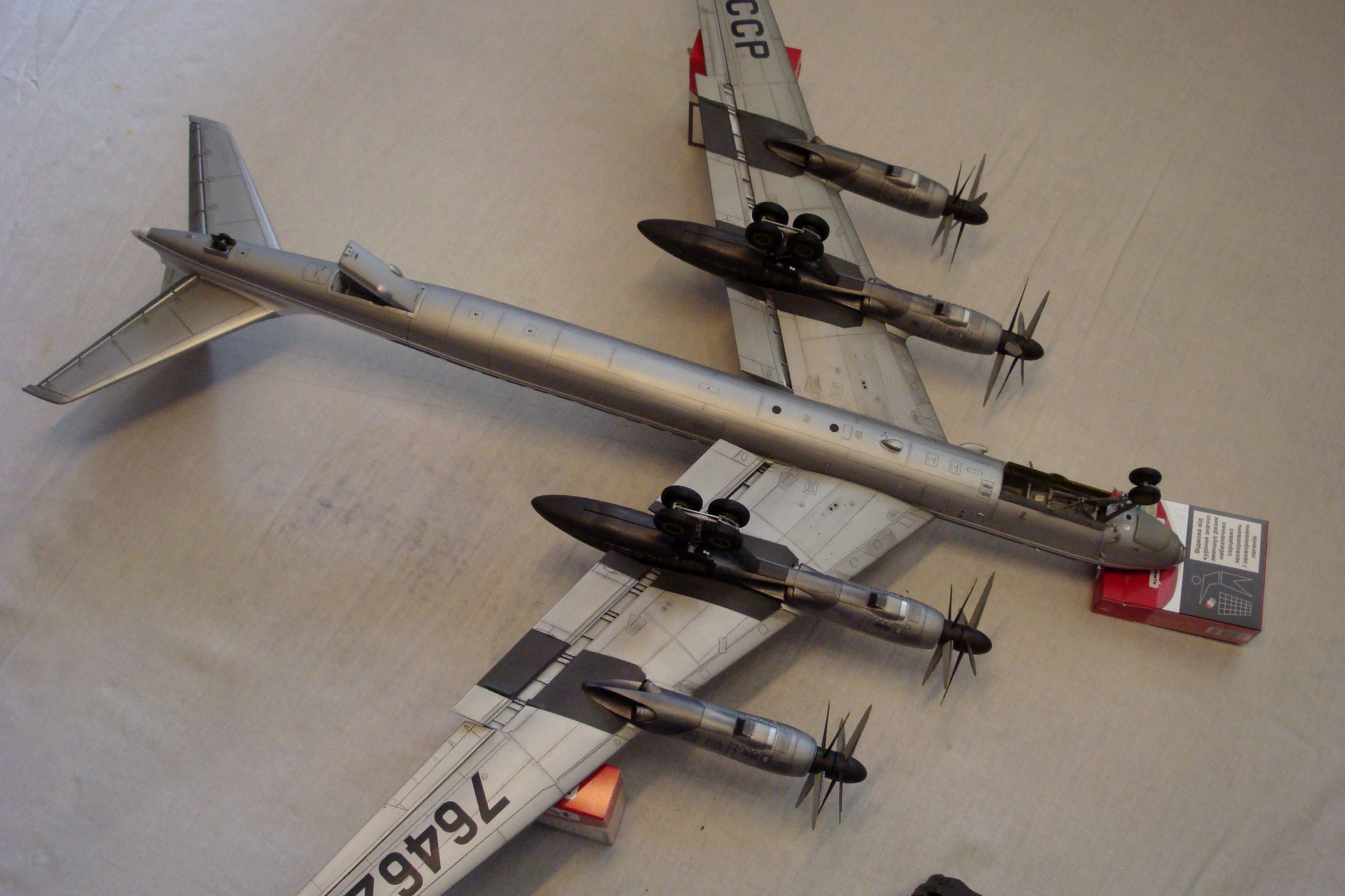 Дружище, я не любитель писанины. Что касается модели, она собрана из трёх составляющих, Амодел и двух (трумпов). Носовая часть,( пластик Амодел). Кормовая, (смола.) (стабилизатор) рули высоты, пластик. Фюзеляж, Ту-95 пластик - переточенный ( снято всё лишние и запаяно всё не нужное,промерен и проточен под иллюминаторы, выточены пазы и ниша под изготовленный трап, добавлен интерьер, и подсветка) А так-же расширенный под Амодел ( разбежности с Амодел внушительны порядка 5 мм. Плоскости, мотогруппа, (трумп).Шасси,( пластик) Амодел. И куча доработок.