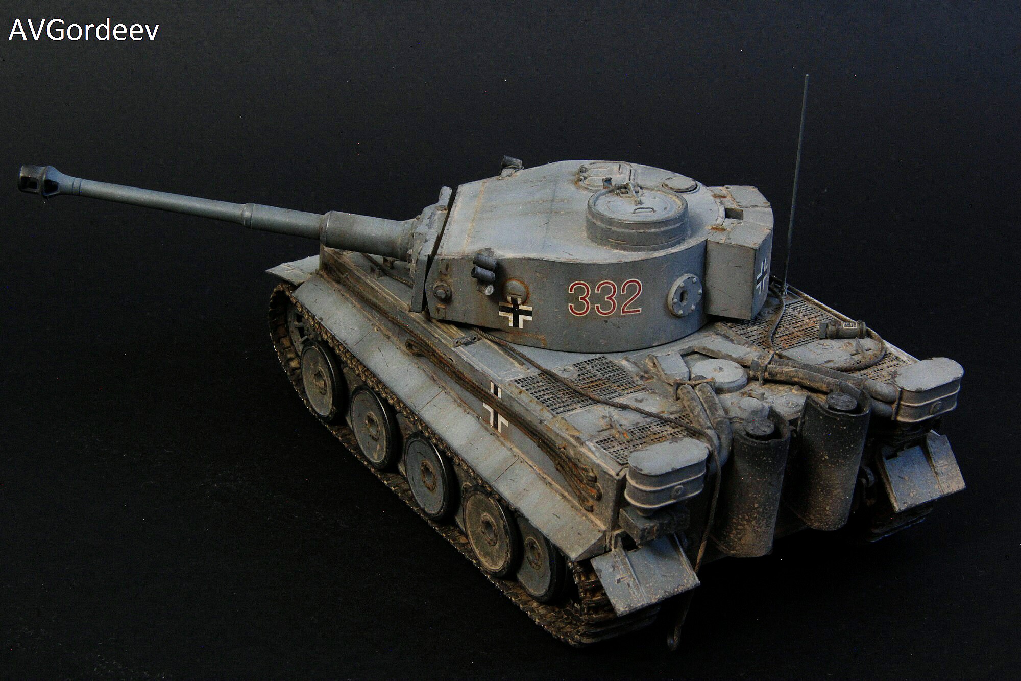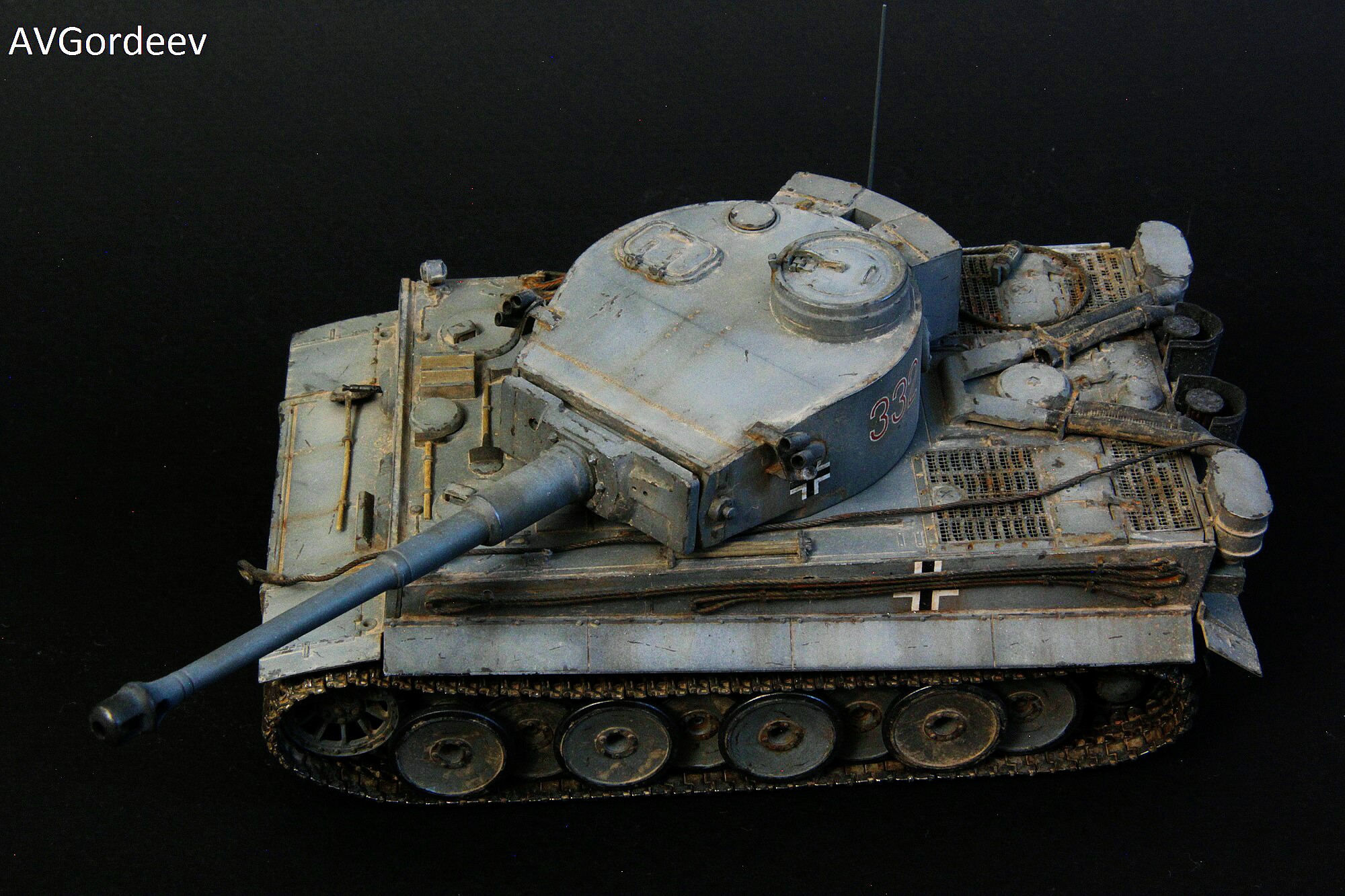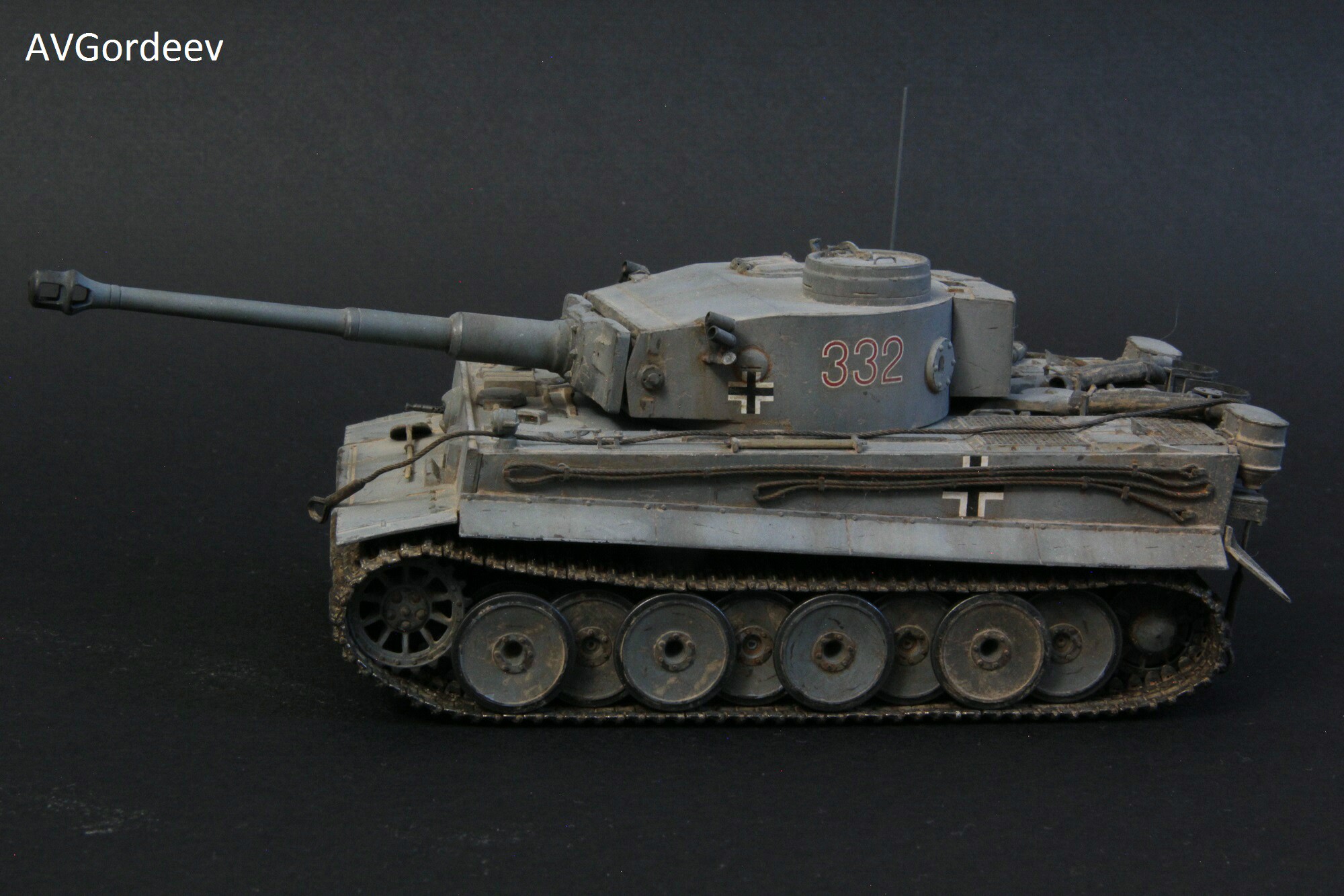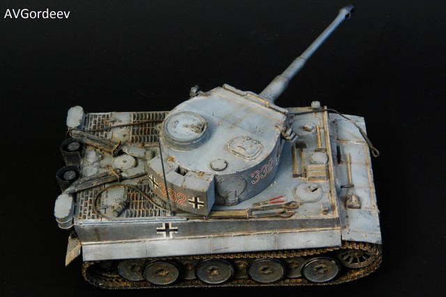 Хороший кошак! Масштаб не "слепой", но основательно "прищуренный". Из того что бросилось в глаза,- нет установок S-мин по периметру и ограничителя вертикального хода орудия. Установки производитель совсем не дает? Схема окраски и обозначений из инструкции взята? 332 борт из sPzAbt 503 привычнее видеть в дункельгельб. Но как сошлись во мнении коллеги на танковом углу, 332 борт был перекрашен в дункель из панцерграу в полевых условиях, так что в какой-то из периодов своего существования он был и серым.