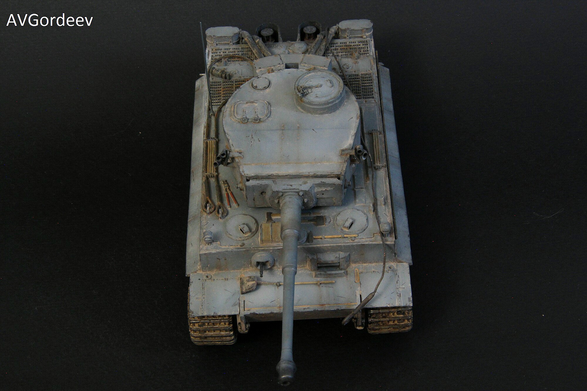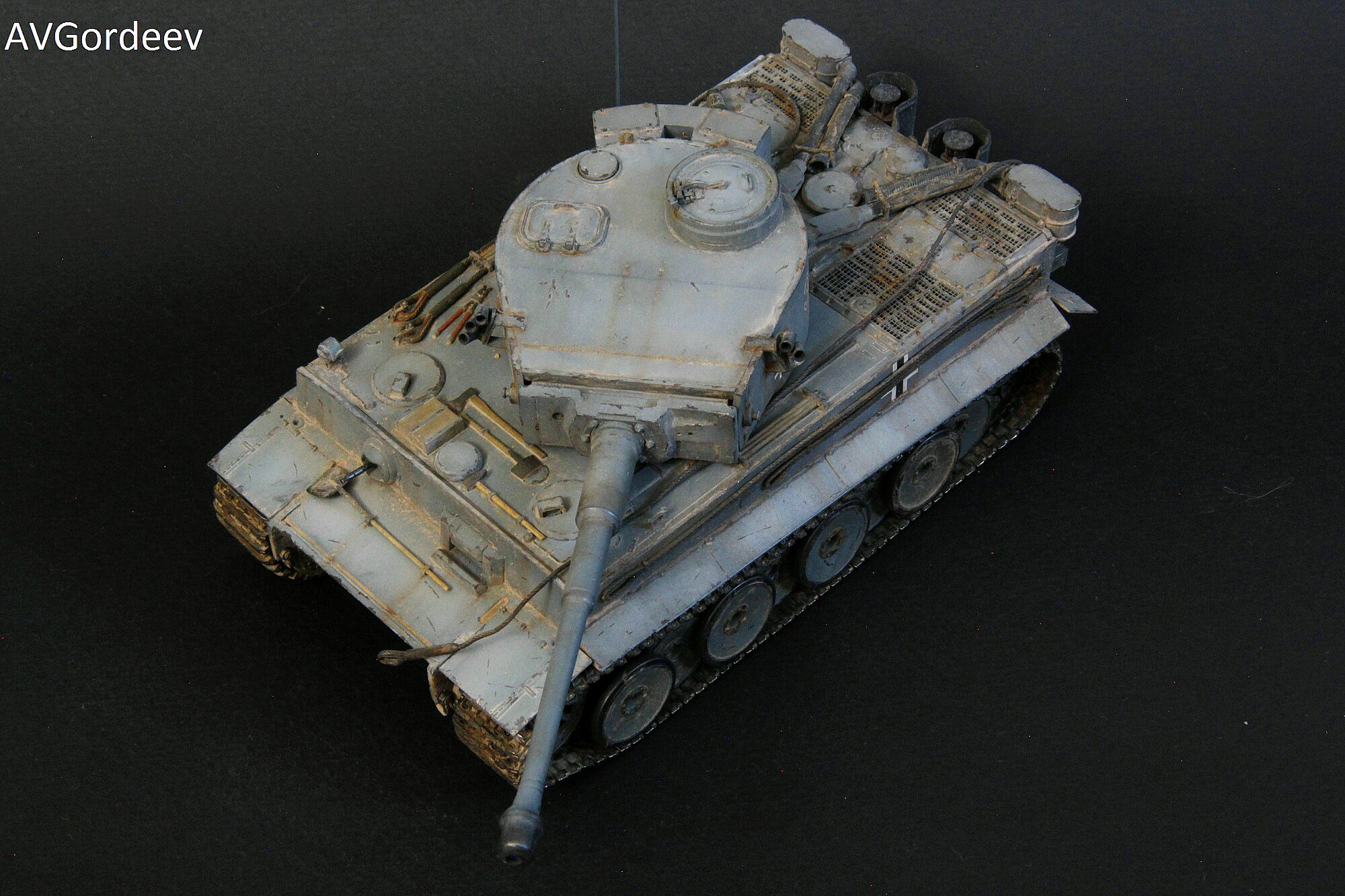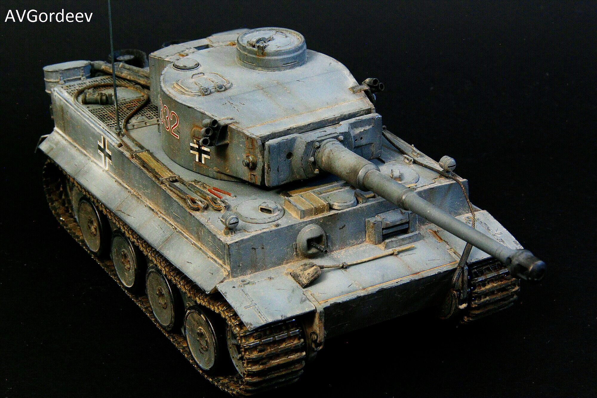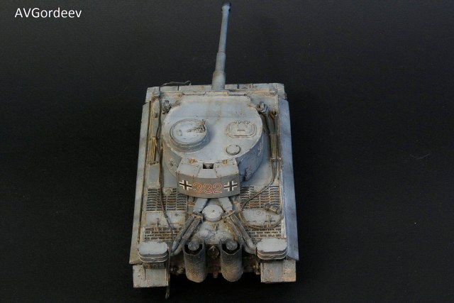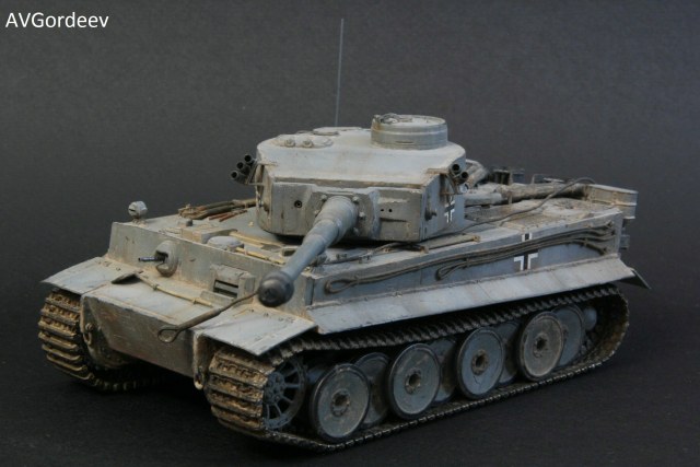 Хороший кошак! Масштаб не "слепой", но основательно "прищуренный". Из того что бросилось в глаза,- нет установок S-мин по периметру и ограничителя вертикального хода орудия. Установки производитель совсем не дает? Схема окраски и обозначений из инструкции взята? 332 борт из sPzAbt 503 привычнее видеть в дункельгельб. Но как сошлись во мнении коллеги на танковом углу, 332 борт был перекрашен в дункель из панцерграу в полевых условиях, так что в какой-то из периодов своего существования он был и серым.