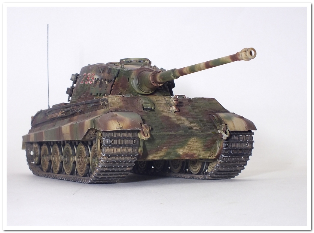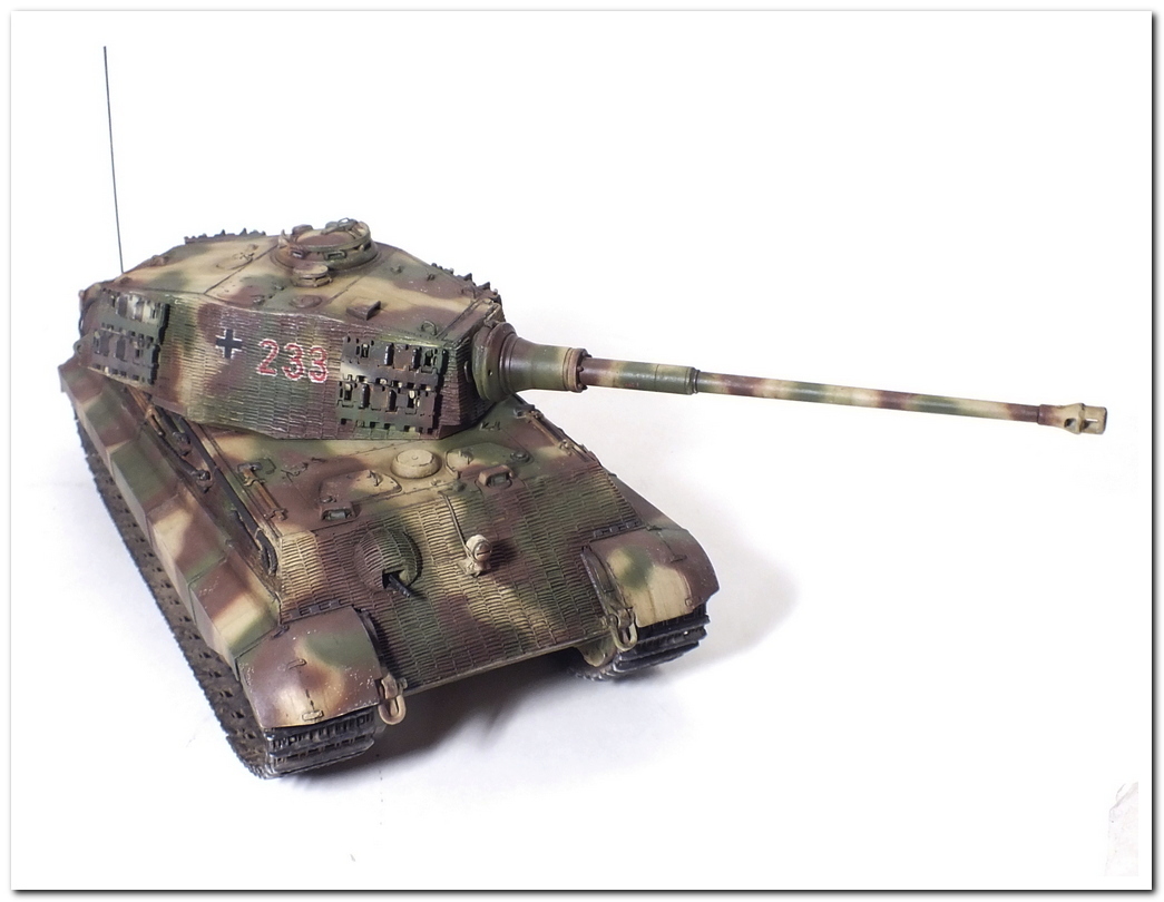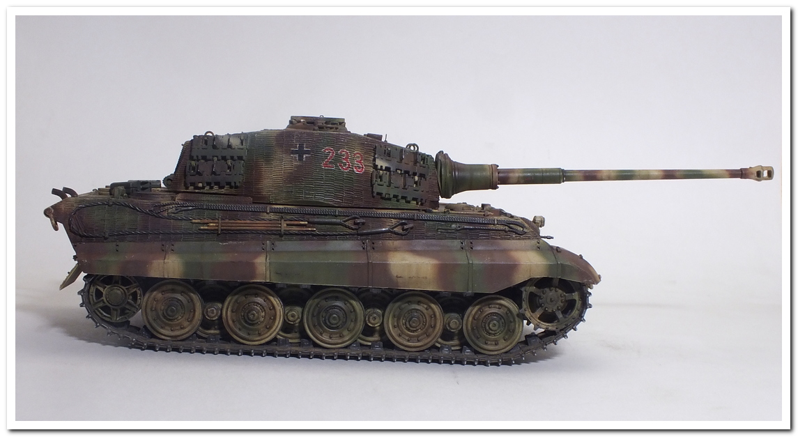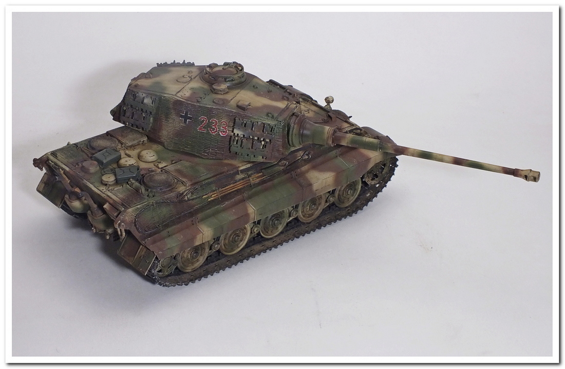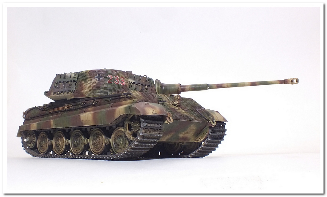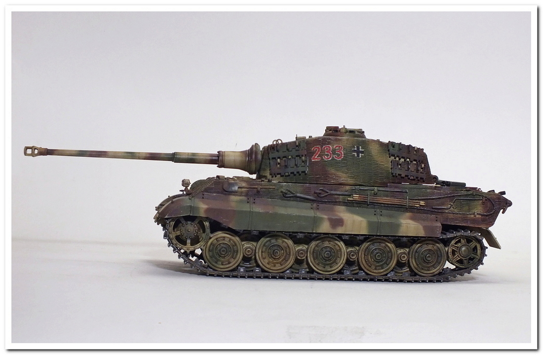 Приветствую всех каропчан.Представляю свою первую работу в новом году-модель немецкого тяжелого танка Тигр II.Модель вполне самодостаточная,есть металлический ствол,тросы,снаряды и все необходимое травление.В сборке не плохая,единственное плохо стыковались ванна с верхней частью корпуса,пришлось впереди немного подрезать,чтобы верх встал на место. Доработок не делал никаких,все из коробки.В наборе крестов и номеров подходящего размера не нашлось,поэтому рисовал все от руки.В мат.часть также не вдавался,единственное только посматривал на архивные фото машины 233 из 503 ТТБ,участвовавшей в операции "Панцерфауст" в Будапеште,в октябре 1944-го года,проводившейся немецкими войсками с целью недопущения выхода Венгрии из войны.