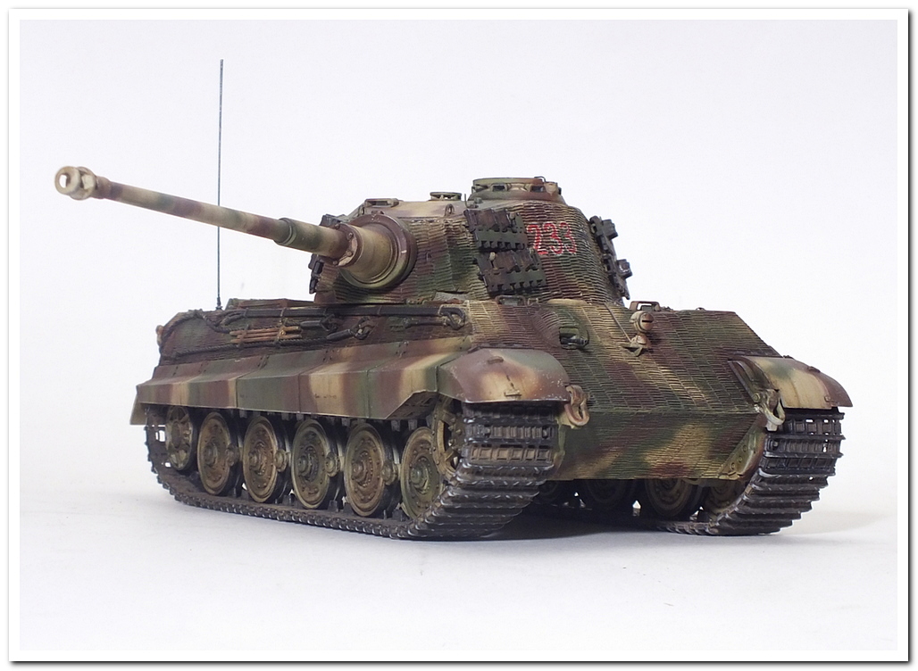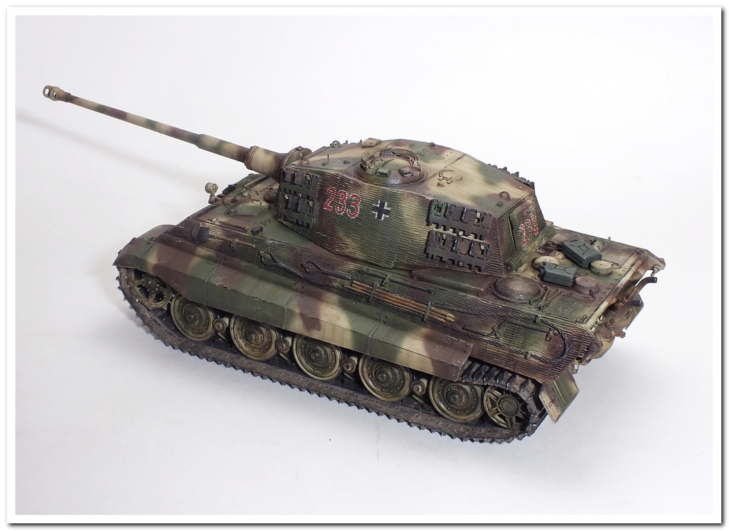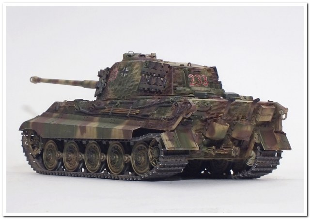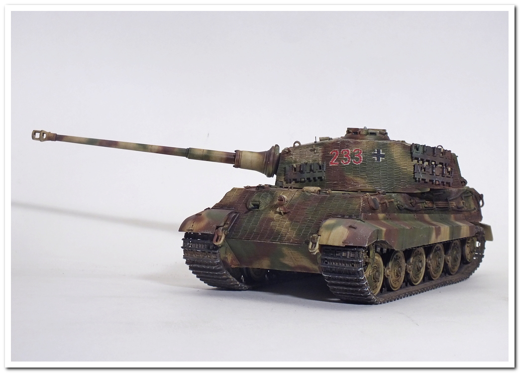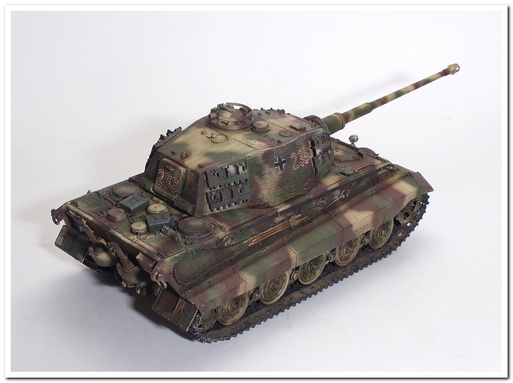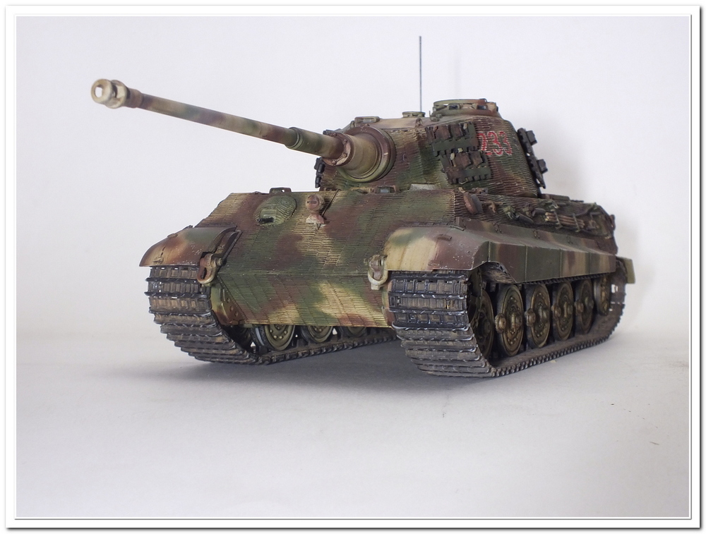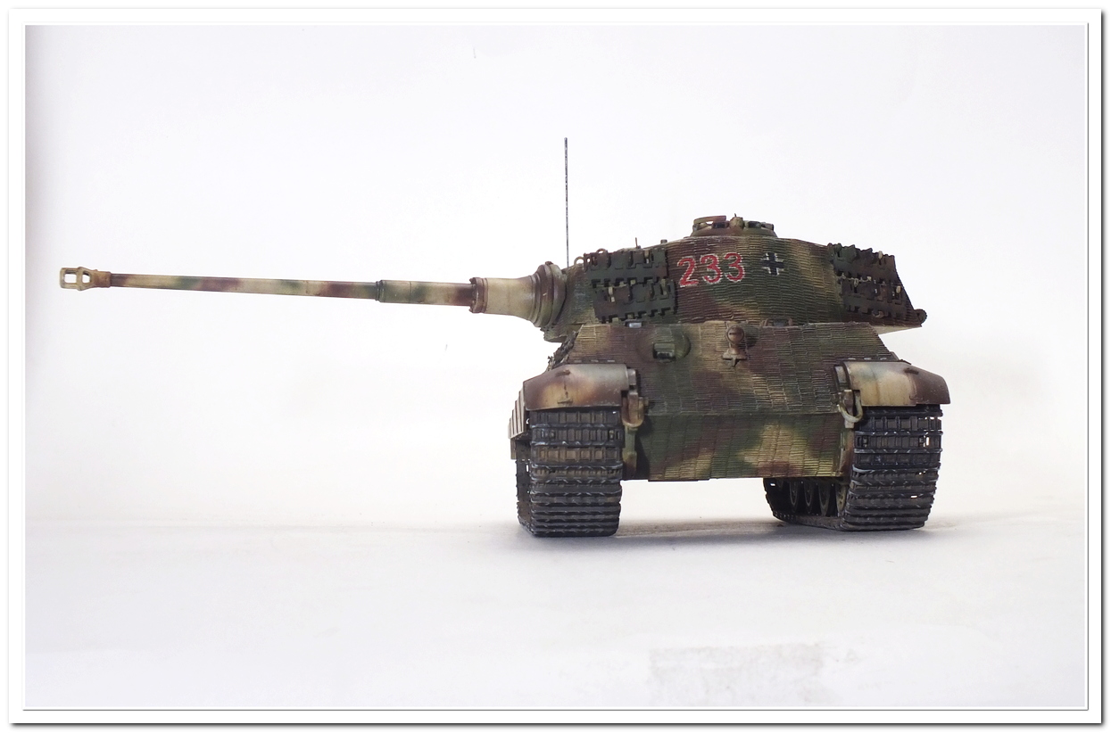 Приветствую всех каропчан.Представляю свою первую работу в новом году-модель немецкого тяжелого танка Тигр II.Модель вполне самодостаточная,есть металлический ствол,тросы,снаряды и все необходимое травление.В сборке не плохая,единственное плохо стыковались ванна с верхней частью корпуса,пришлось впереди немного подрезать,чтобы верх встал на место. Доработок не делал никаких,все из коробки.В наборе крестов и номеров подходящего размера не нашлось,поэтому рисовал все от руки.В мат.часть также не вдавался,единственное только посматривал на архивные фото машины 233 из 503 ТТБ,участвовавшей в операции "Панцерфауст" в Будапеште,в октябре 1944-го года,проводившейся немецкими войсками с целью недопущения выхода Венгрии из войны.
