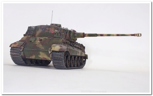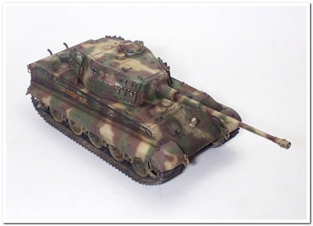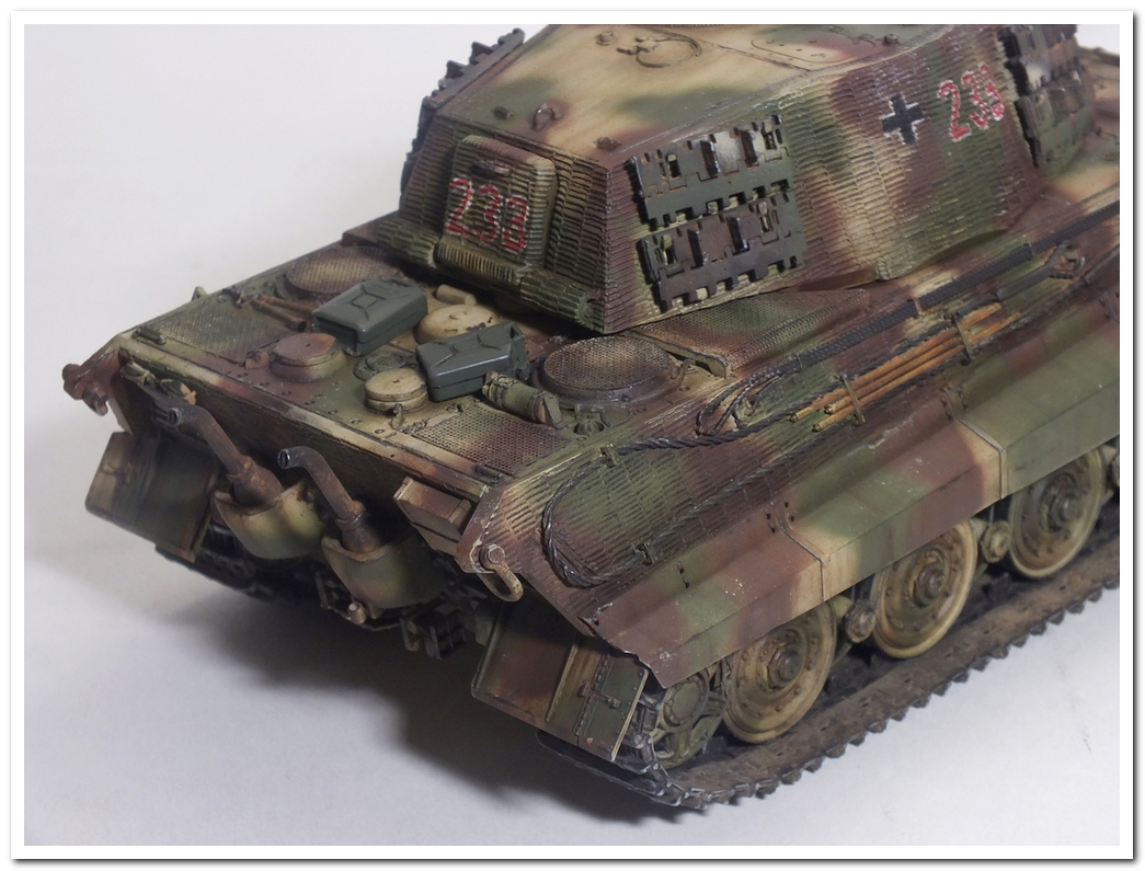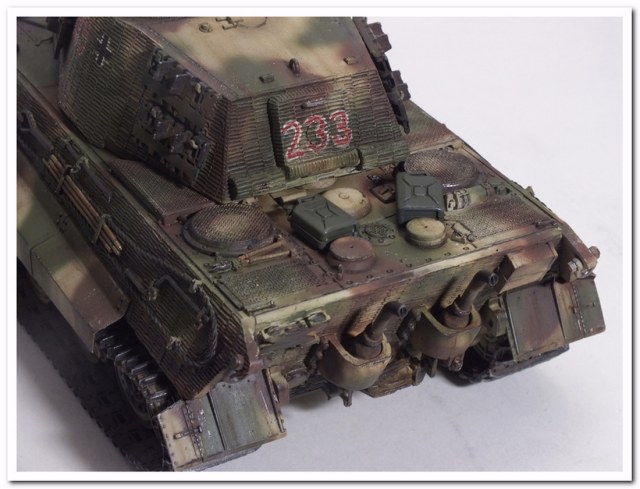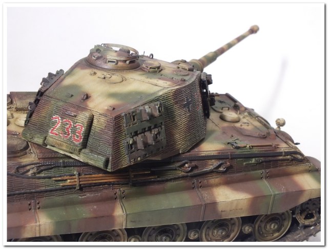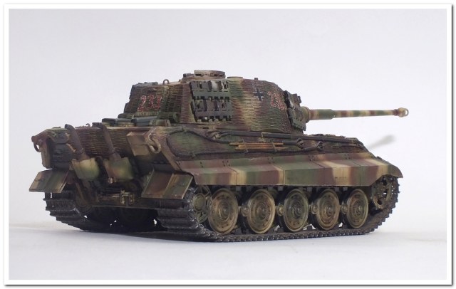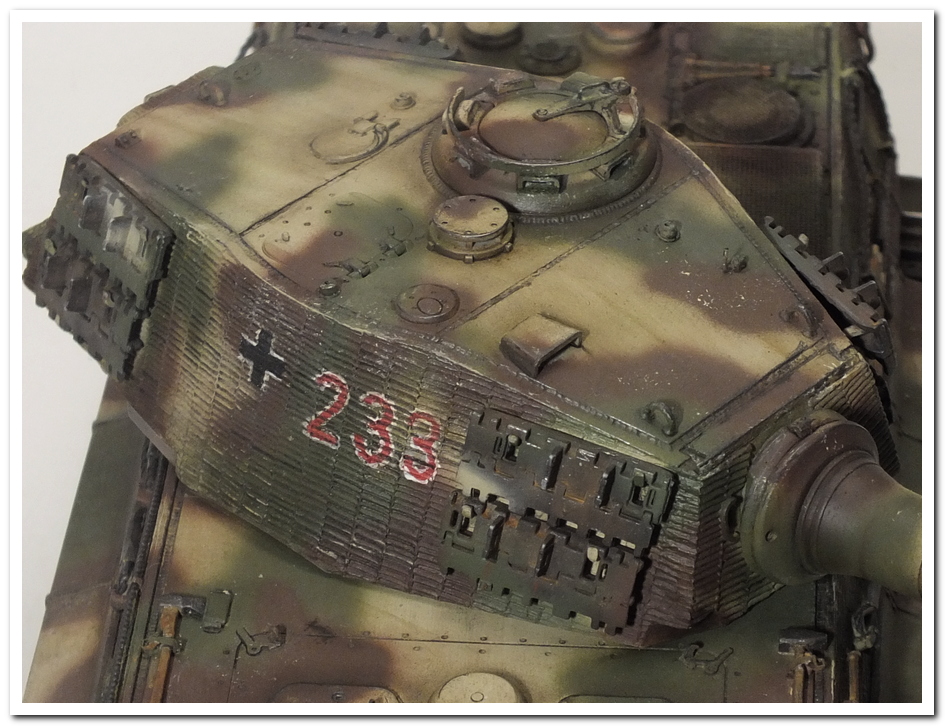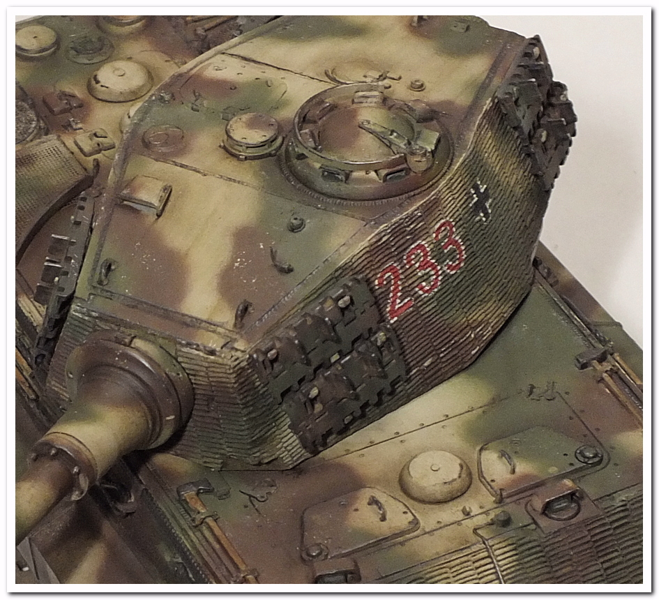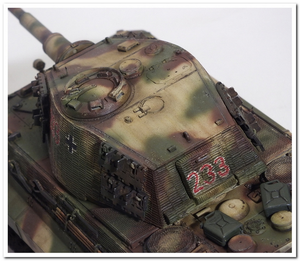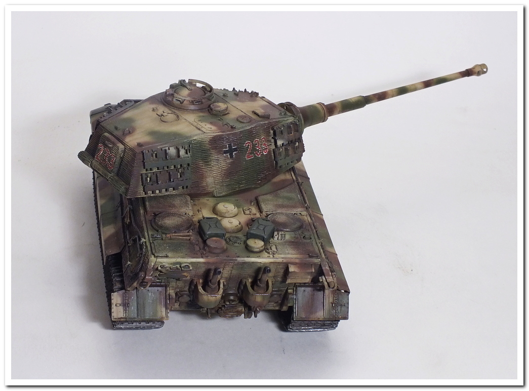 Приветствую всех каропчан.Представляю свою первую работу в новом году-модель немецкого тяжелого танка Тигр II.Модель вполне самодостаточная,есть металлический ствол,тросы,снаряды и все необходимое травление.В сборке не плохая,единственное плохо стыковались ванна с верхней частью корпуса,пришлось впереди немного подрезать,чтобы верх встал на место. Доработок не делал никаких,все из коробки.В наборе крестов и номеров подходящего размера не нашлось,поэтому рисовал все от руки.В мат.часть также не вдавался,единственное только посматривал на архивные фото машины 233 из 503 ТТБ,участвовавшей в операции "Панцерфауст" в Будапеште,в октябре 1944-го года,проводившейся немецкими войсками с целью недопущения выхода Венгрии из войны.