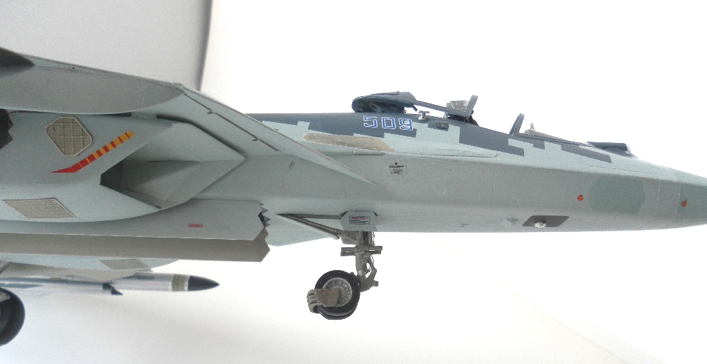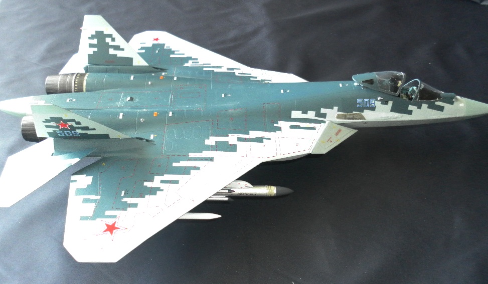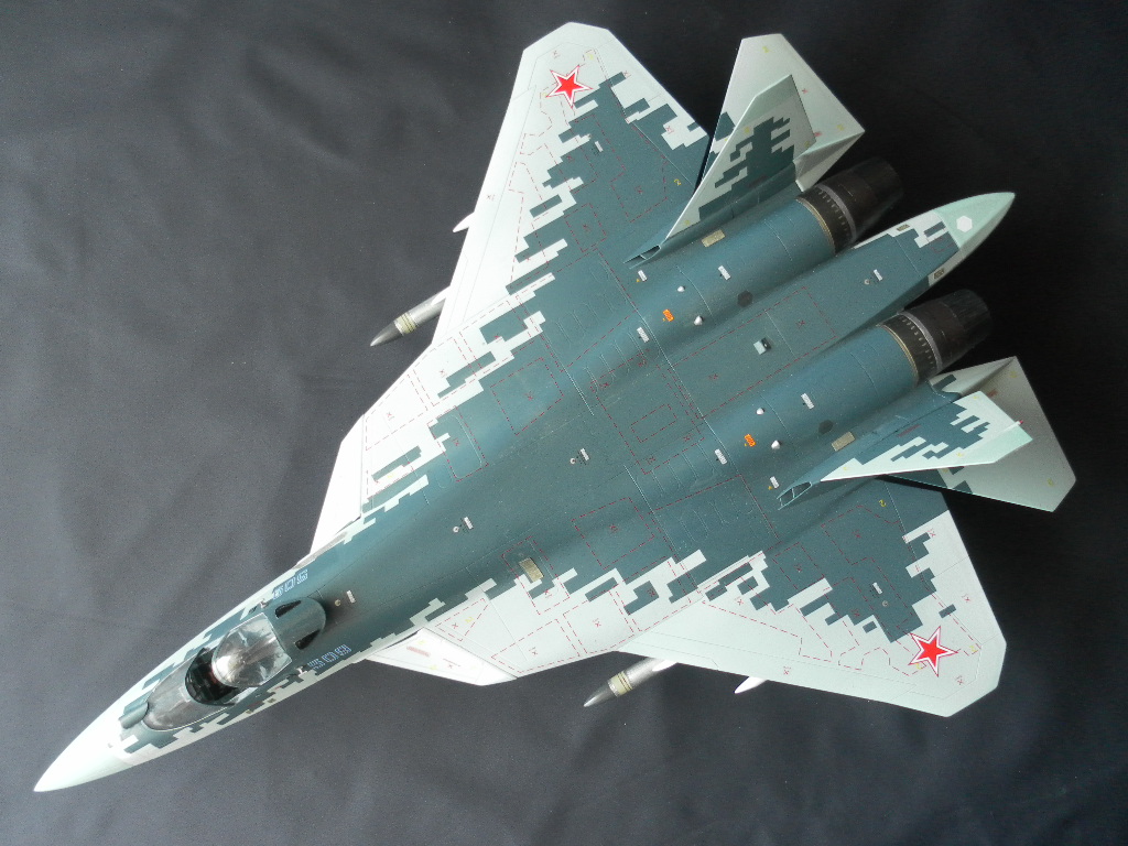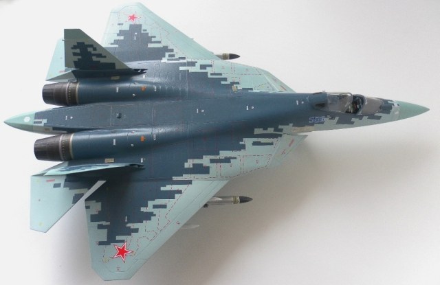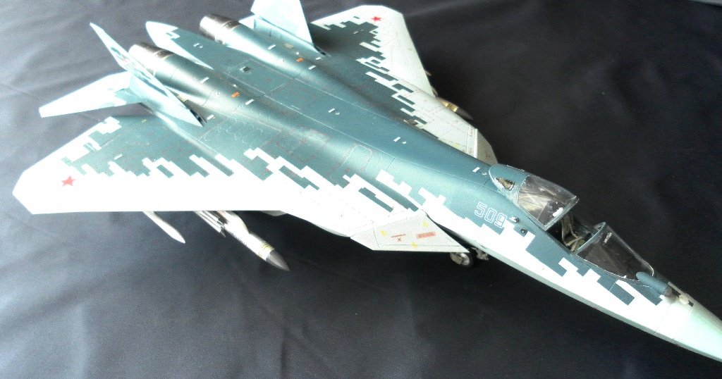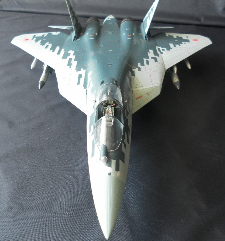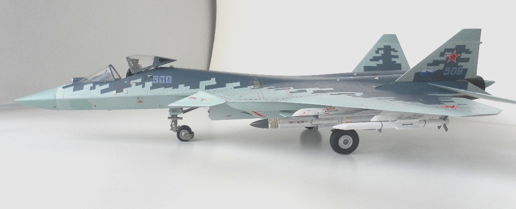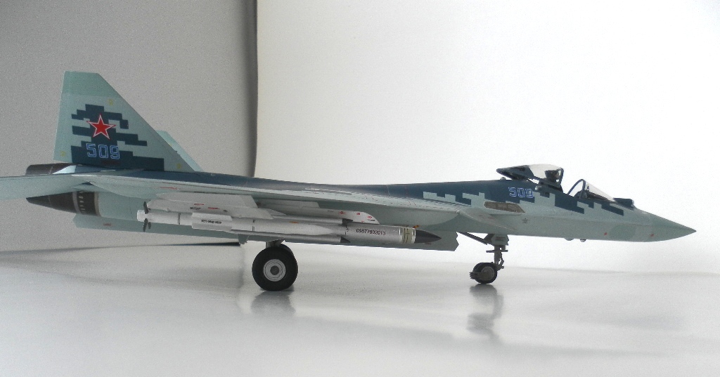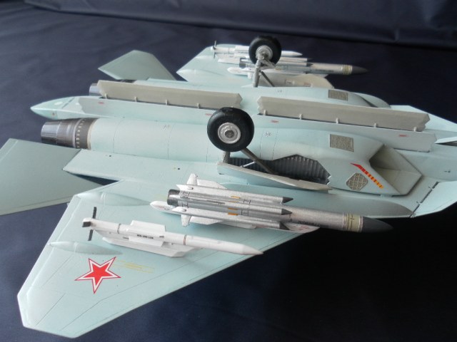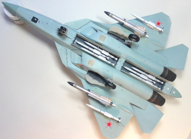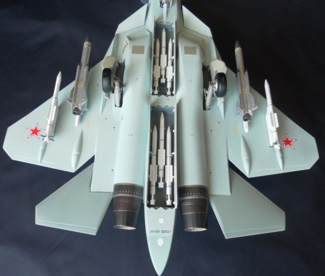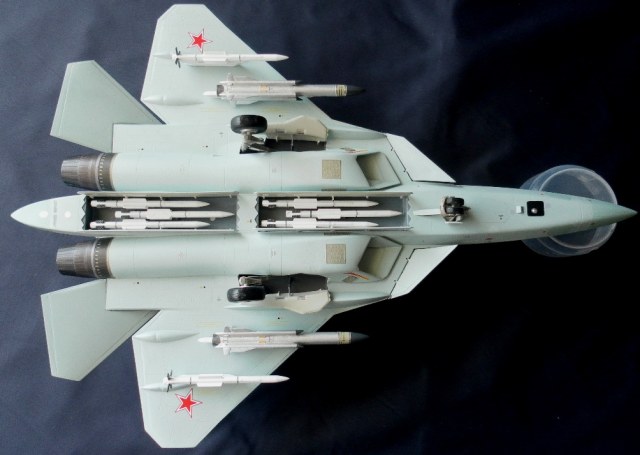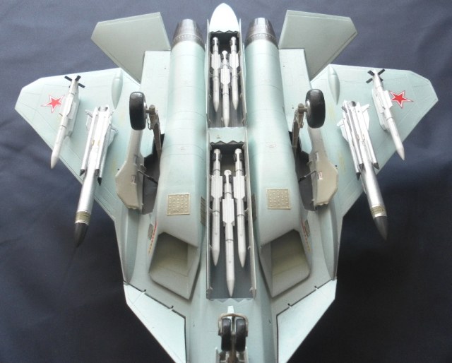 Вооружение нацеплял все, что было в коробке, Х-31 и К-77 (или Р-77). Насколько известно из источников, на СУ-57 как раз стали ставить К-77, доработанная Р-77. Ну вообщем в полной боевой выкладке.