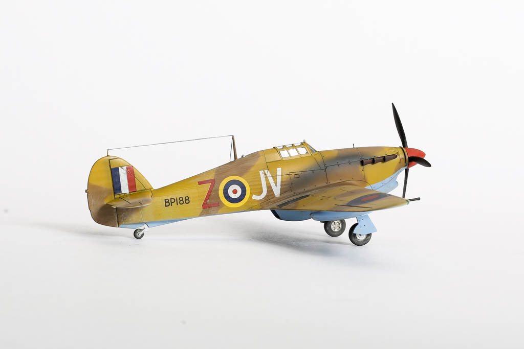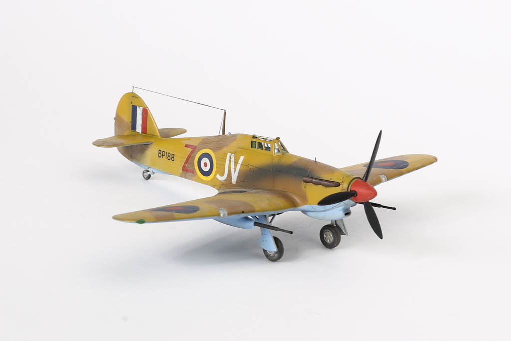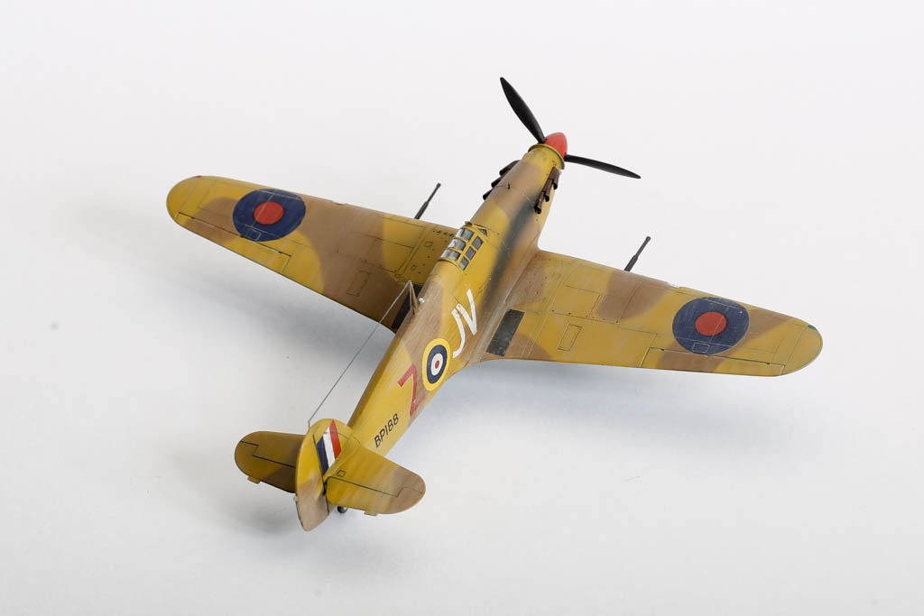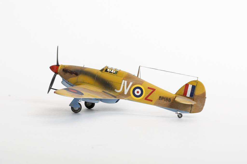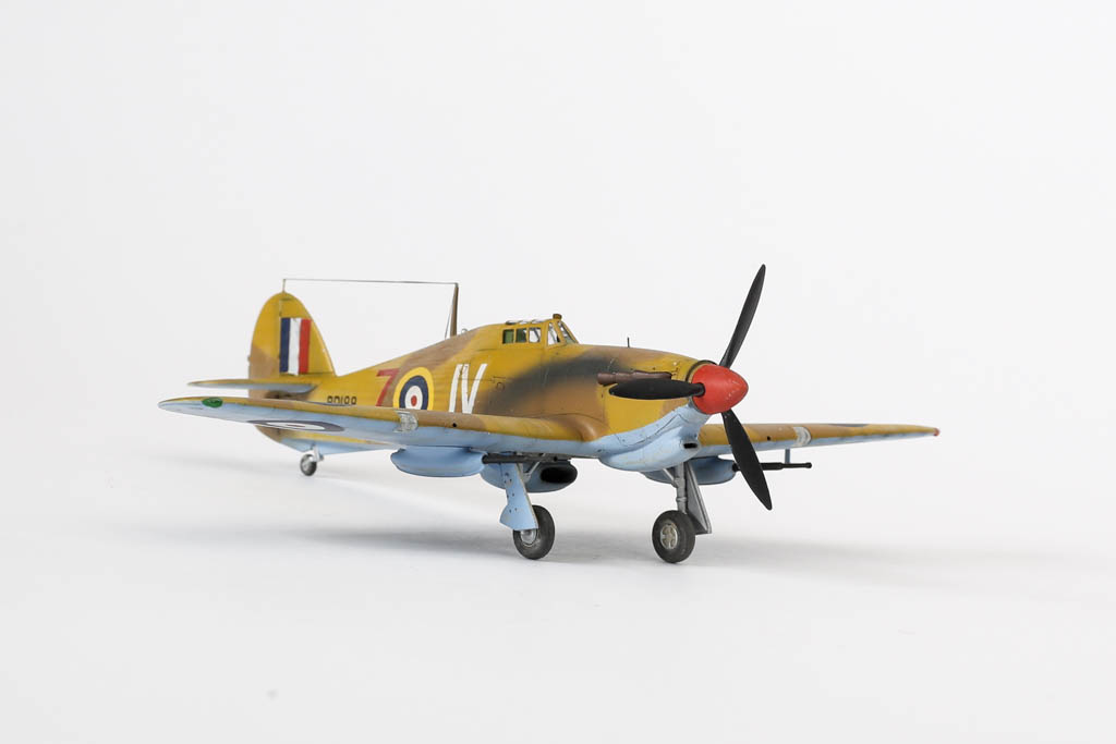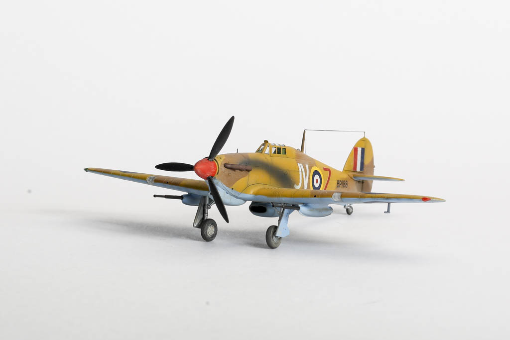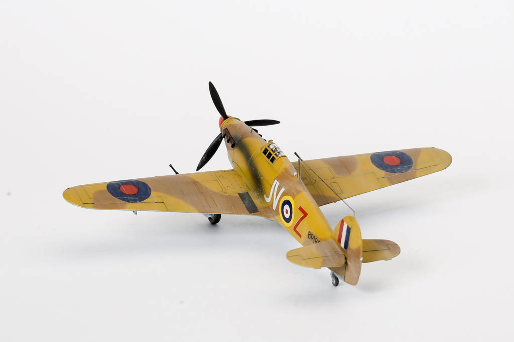 Большая часть выпущенных "Харрикейнов" IID , вооруженных пушками 40мм, отправилась за рубеж, в основном на Ближний Восток, и была оснащена тропическими фильтрами. Первые серии имели такую же бронезащиту, как истребитель "Харрикейн" IIС, но в частях ее снимали полностью или частично, чтобы улучшить летные данные.Впервые IID применили в боях у Бир-Хакейма летом 1942 г. Пушки эффективно поражали с малых высот немецкие и итальянские танки и бронеавтомобили. Однако из-за отсутствия брони или ее недостаточности IID оказался очень уязвим и со стороны огня с земли, и от истребителей противника. За основу взята уже старенькая, но недорогая модель Acdemy на нее были установлены подкрыльевые пушки от фирмы AML. Зашпаклевал лишние линии расшивки. Декаль из коробки Мачбокса.Красил специальным набором африканских RAF от AK
