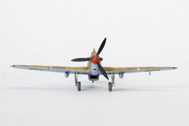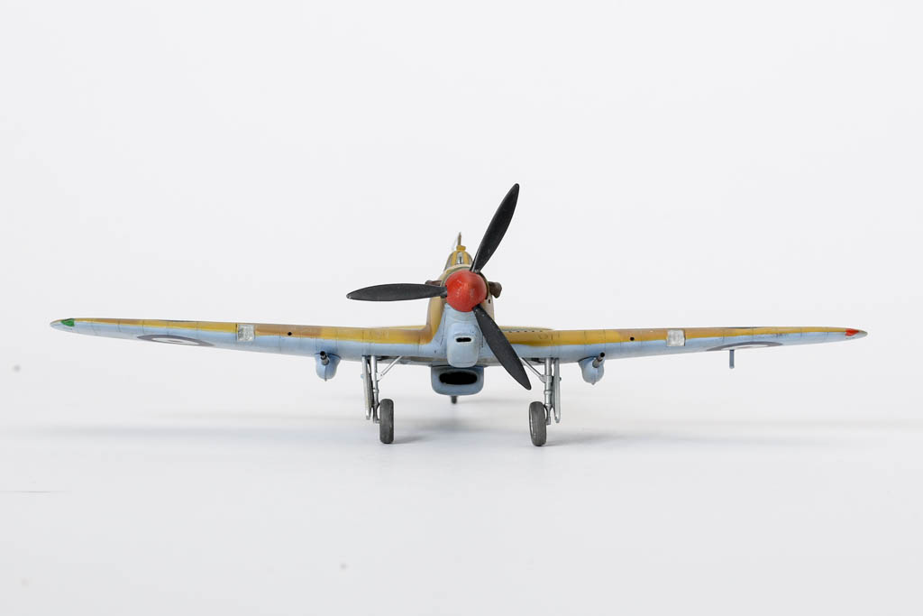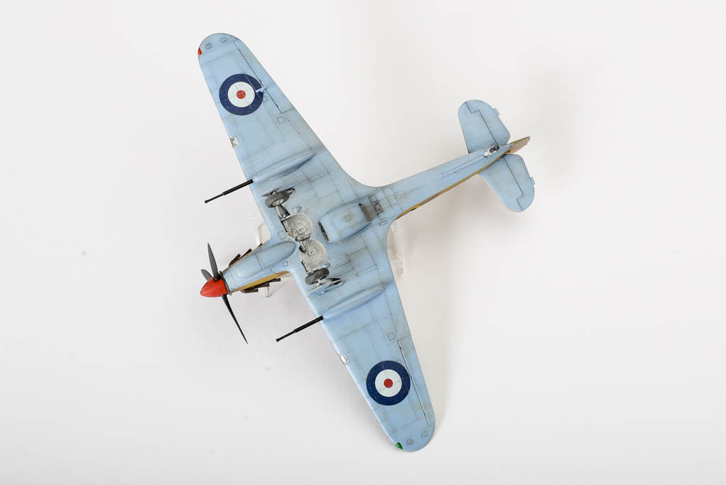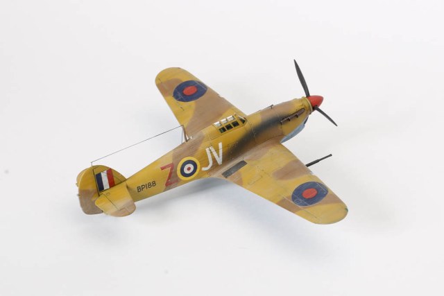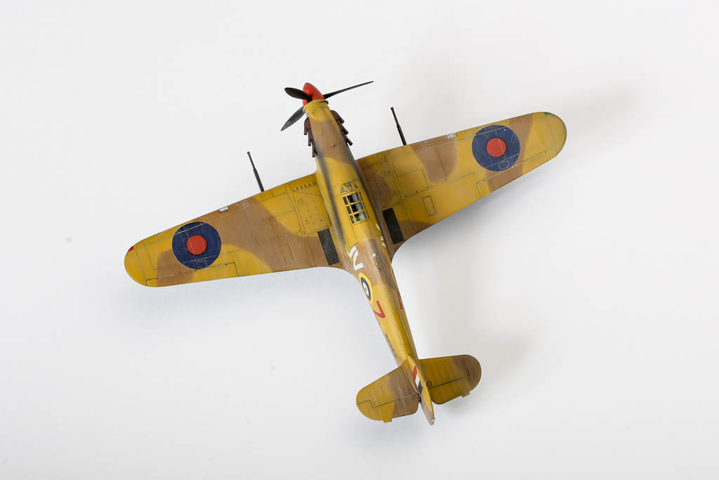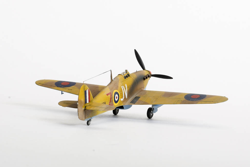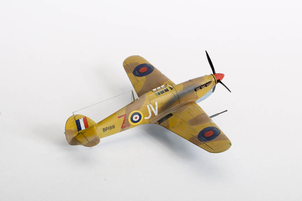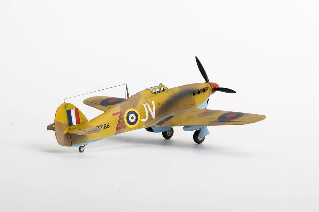 Большая часть выпущенных "Харрикейнов" IID , вооруженных пушками 40мм, отправилась за рубеж, в основном на Ближний Восток, и была оснащена тропическими фильтрами. Первые серии имели такую же бронезащиту, как истребитель "Харрикейн" IIС, но в частях ее снимали полностью или частично, чтобы улучшить летные данные.Впервые IID применили в боях у Бир-Хакейма летом 1942 г. Пушки эффективно поражали с малых высот немецкие и итальянские танки и бронеавтомобили. Однако из-за отсутствия брони или ее недостаточности IID оказался очень уязвим и со стороны огня с земли, и от истребителей противника. За основу взята уже старенькая, но недорогая модель Acdemy на нее были установлены подкрыльевые пушки от фирмы AML. Зашпаклевал лишние линии расшивки. Декаль из коробки Мачбокса.Красил специальным набором африканских RAF от AK