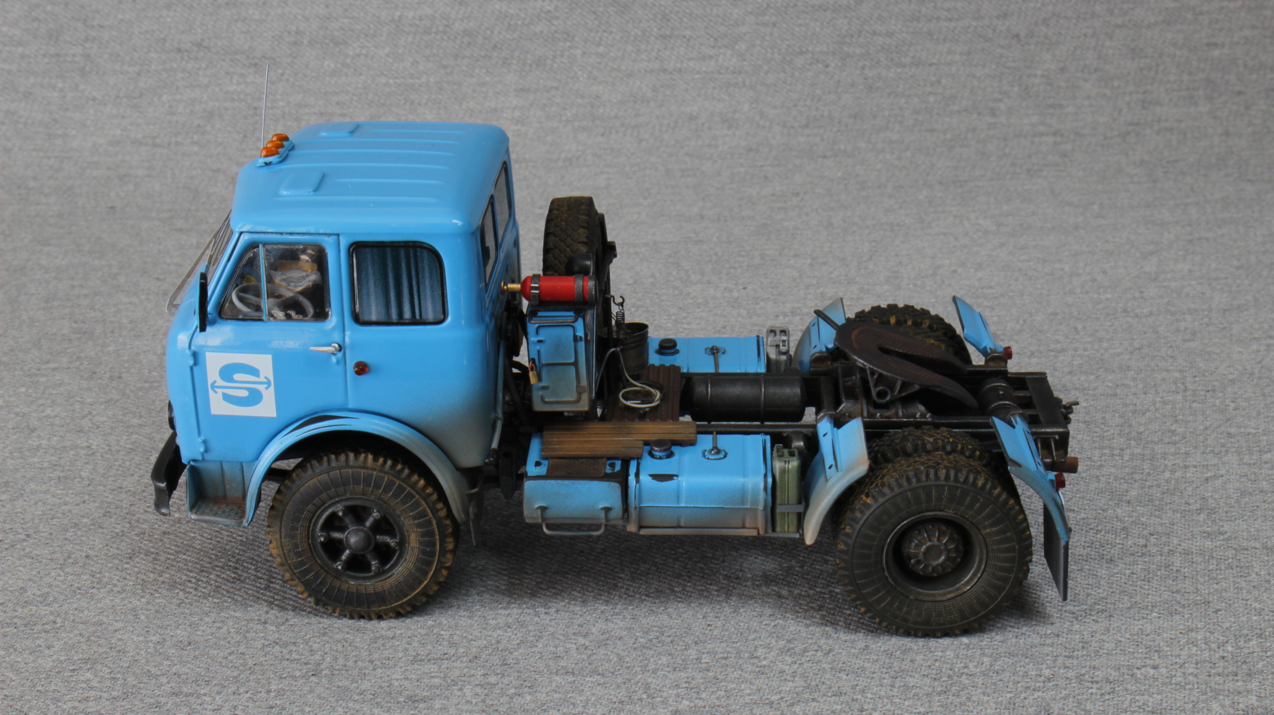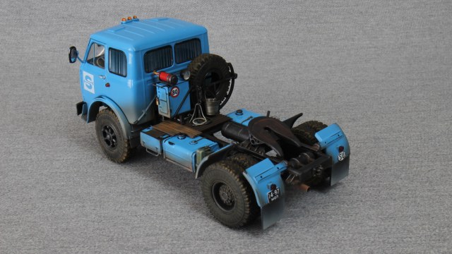 Оформил в позднем варианте, белая решетка, знак качества-ФТ (был присвоен всему семейству МАЗ) ФТ дворники, антенна радиоприёмника (некоторые комплектовались с завода, но подготовка под радио была на всех, т.е. отверстие под антенну-заглушка и выштамповка под приёмник на панели-правда так и не нашел фото с установленным приёмником. На крылья установил брызговики, на левом ручку для подъема и опускания кабины, так же под тоннель над двигателем тепло-шумо изоляцию. Ну и соответствующие декали.