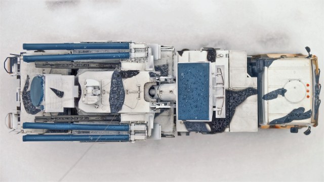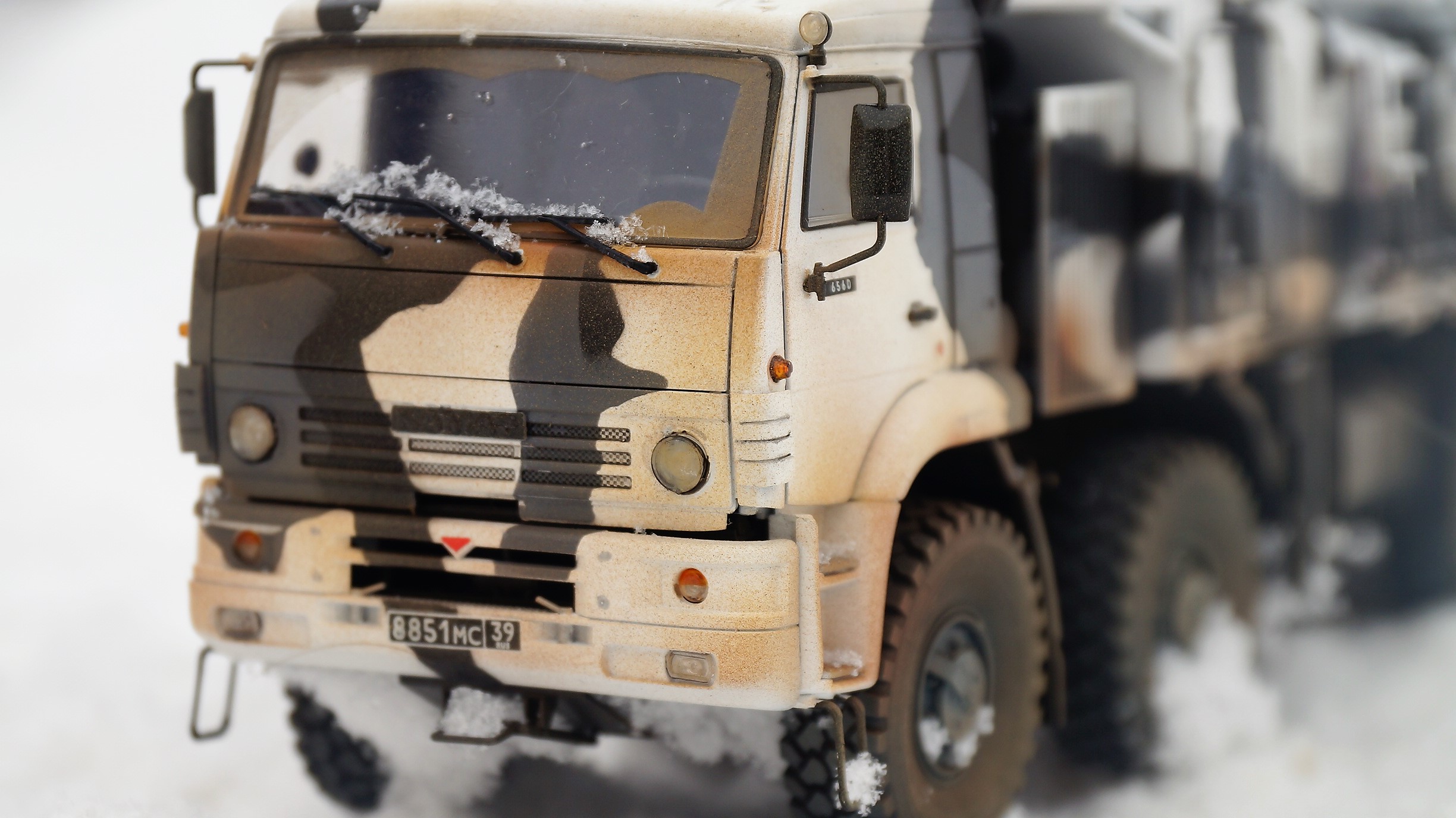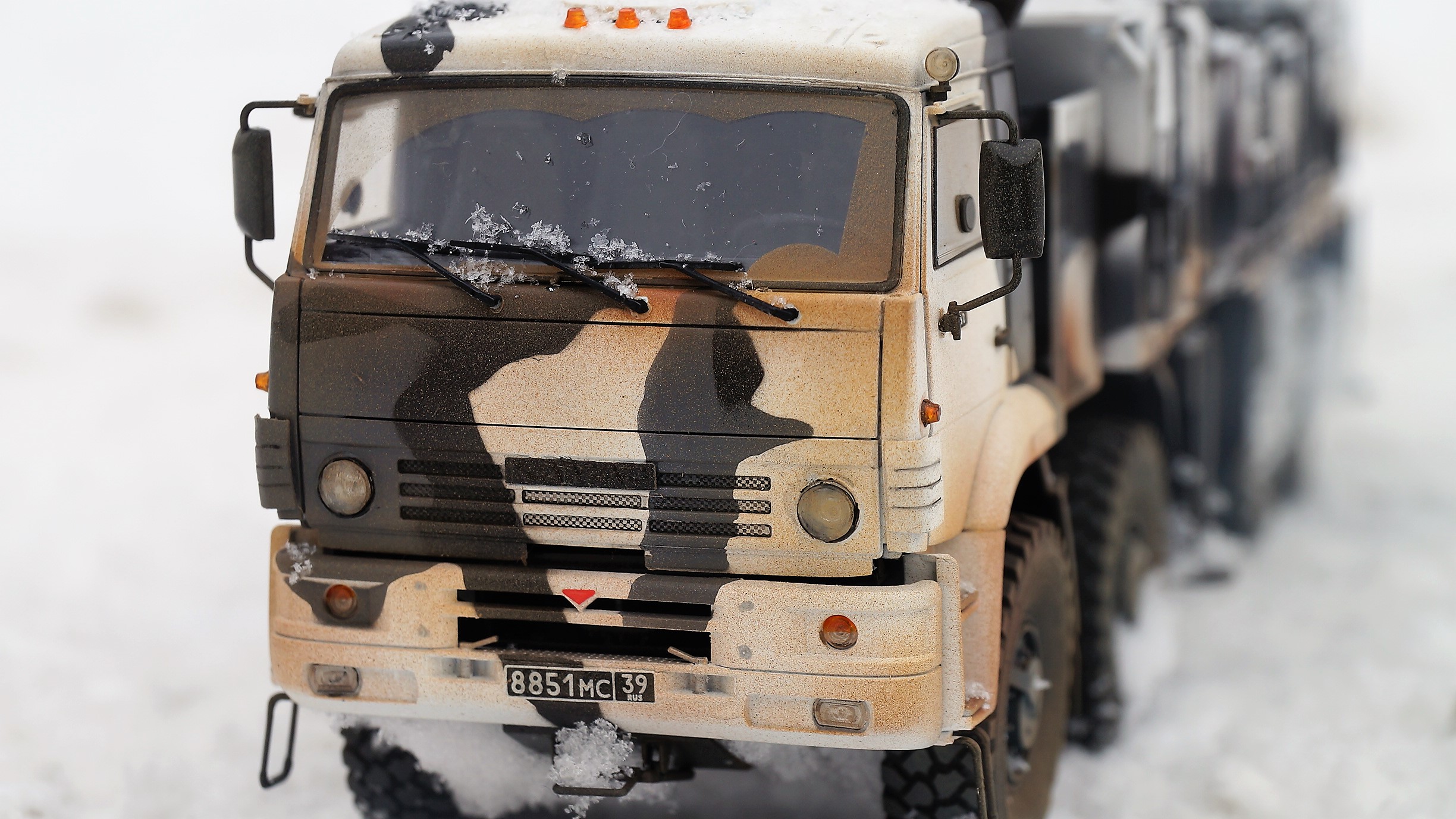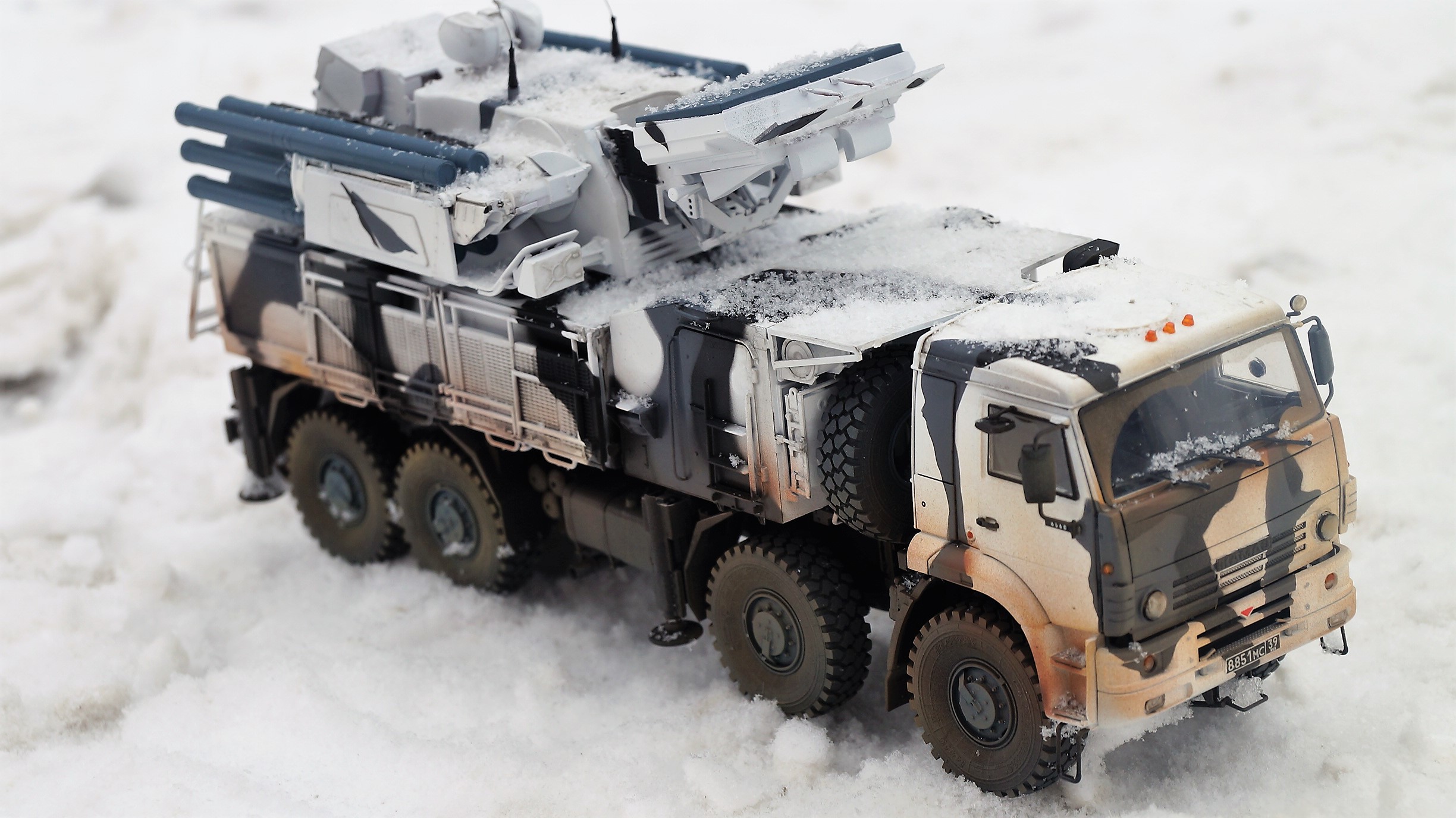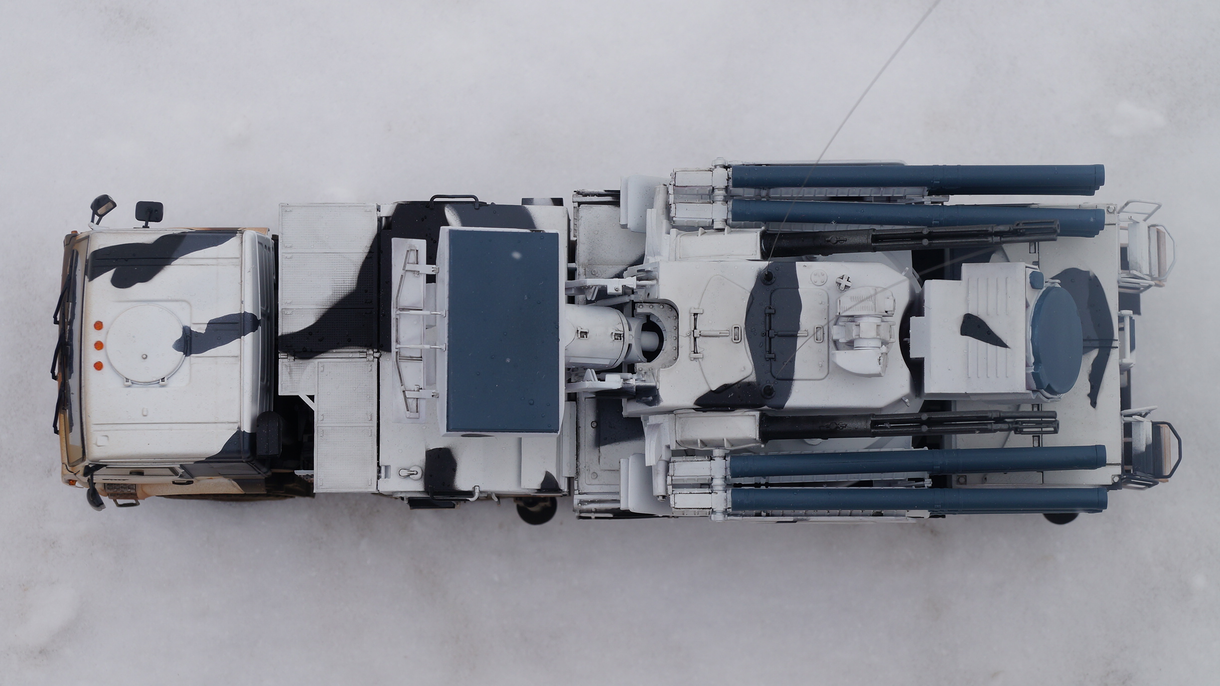 Красить решил в черно-белом арктическом камуфляже (песочные и зеленые однотонные уже всем надоели), и очень об этом пожалел — с помощью привычного патафикса имитировать резкие ломанные границы очень сложно, а любые подпылы на белой базе очень заметно. В итоге получилось очень сильно «По мотивам». Краски Тамия. На всякий случай, х-24, который Звезда рекомендует, для серых пятен подходит не совсем — на всех фото-видео они значительно светлее. Теперь про везеринг). Он здесь должен быть минимальным (если вообще должен) — все комплексы на вооружении российском армии получены недавно, базируются на стационарных площадках и, судя по-всему, беспощадно выдраиваются в период ХПД). Но я уже при сборке той самой деформированной рамке выравнивал ее, приклеивая по кусочкам к крыше. И, при попытке на уже полностью окрашенной модели вставить на место лобовое стекло с ужасом убедился, что оно на место не встает! Щели удалось избежать, но между передней панелью и рамкой лобового стекла прекрасно просматривалась бела полоса окрашенного кузова! Поэтому предположим, что ….