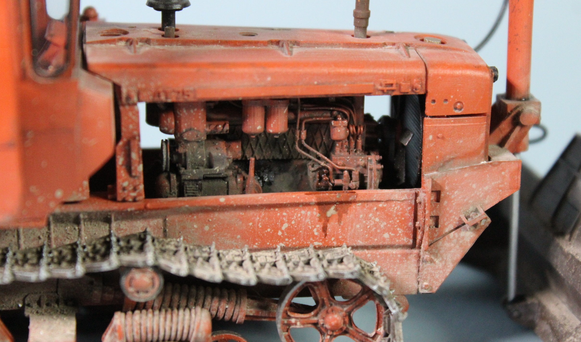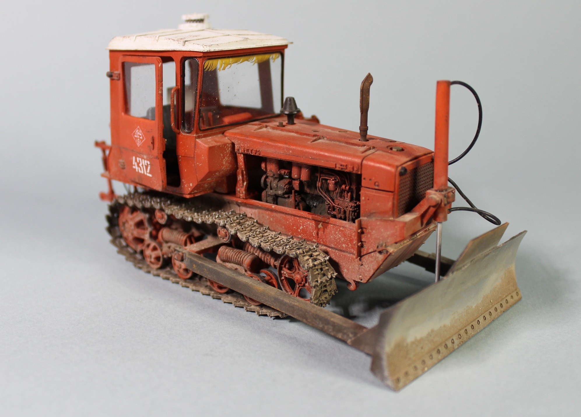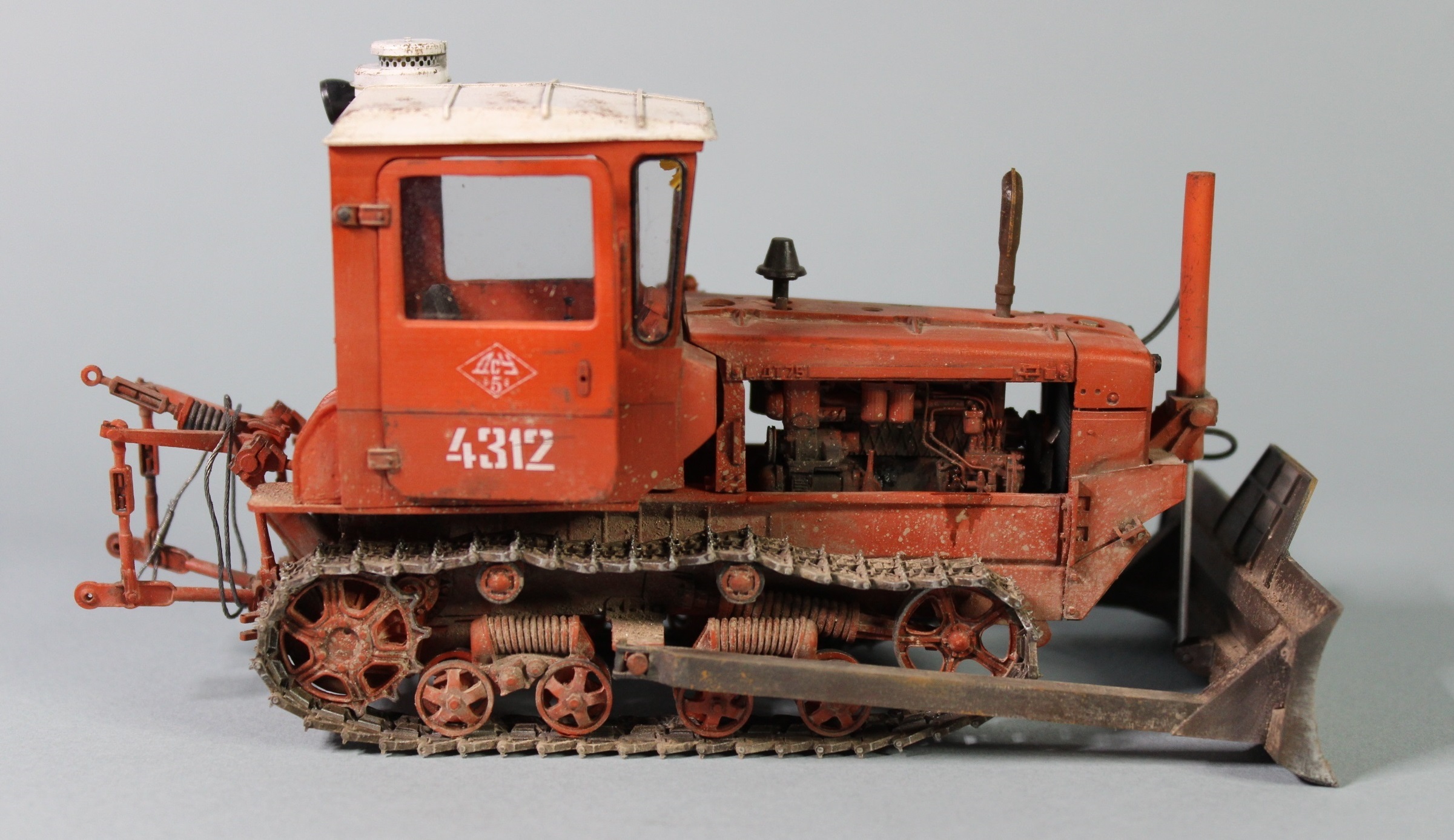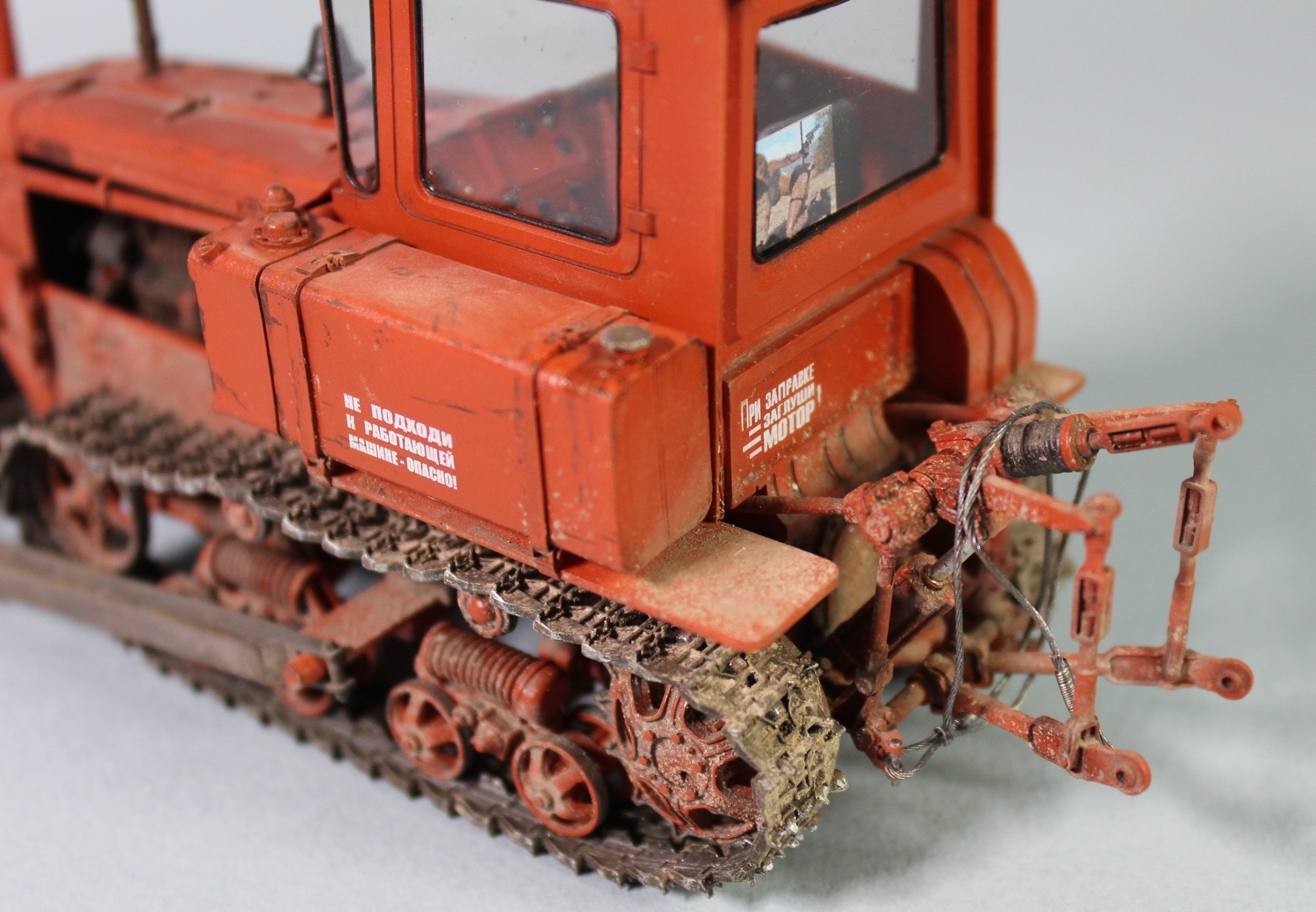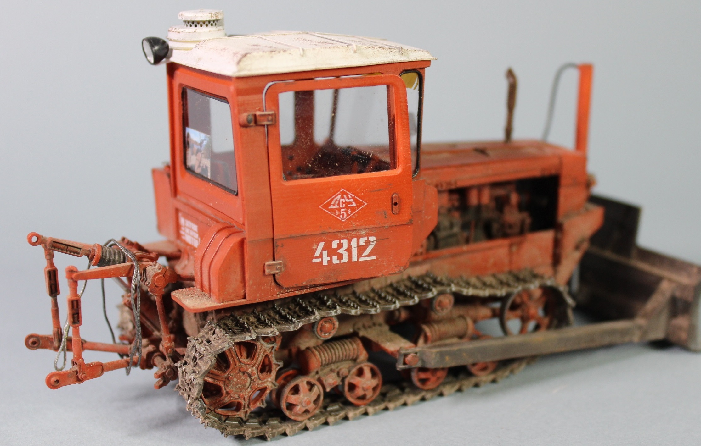 В процессе сборки добавил на модель трубки гидравлики подъема отвала, самодельный трос, фару от Эльф, гидравлику на двигатель и "сусликов" в салон. Пытался получше сфотографировать последних, поэтому прошу прощения за некоторые фото с размытым общим фоном, фотоаппарат не дотягивается до внутрянки салона иначе.