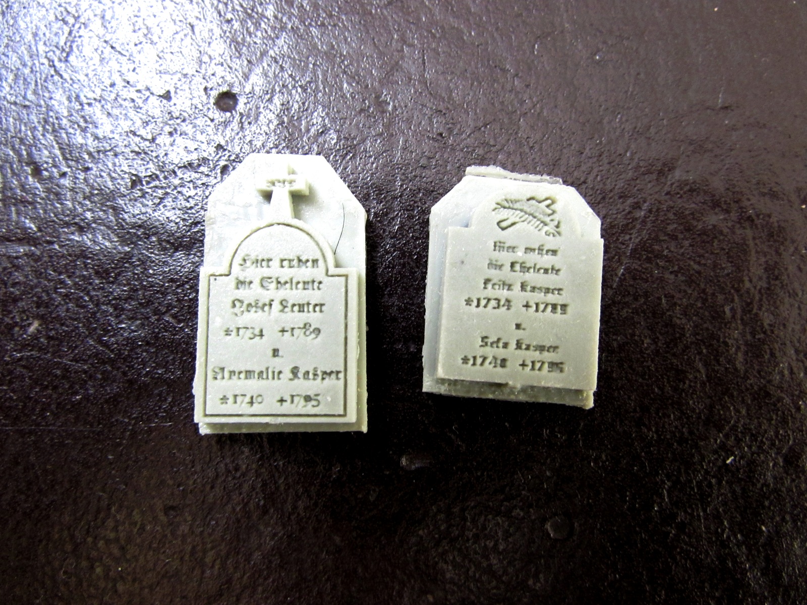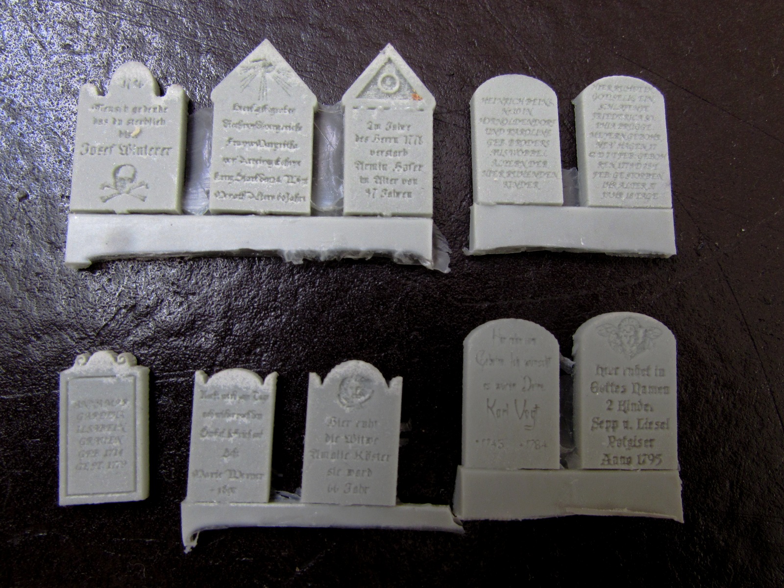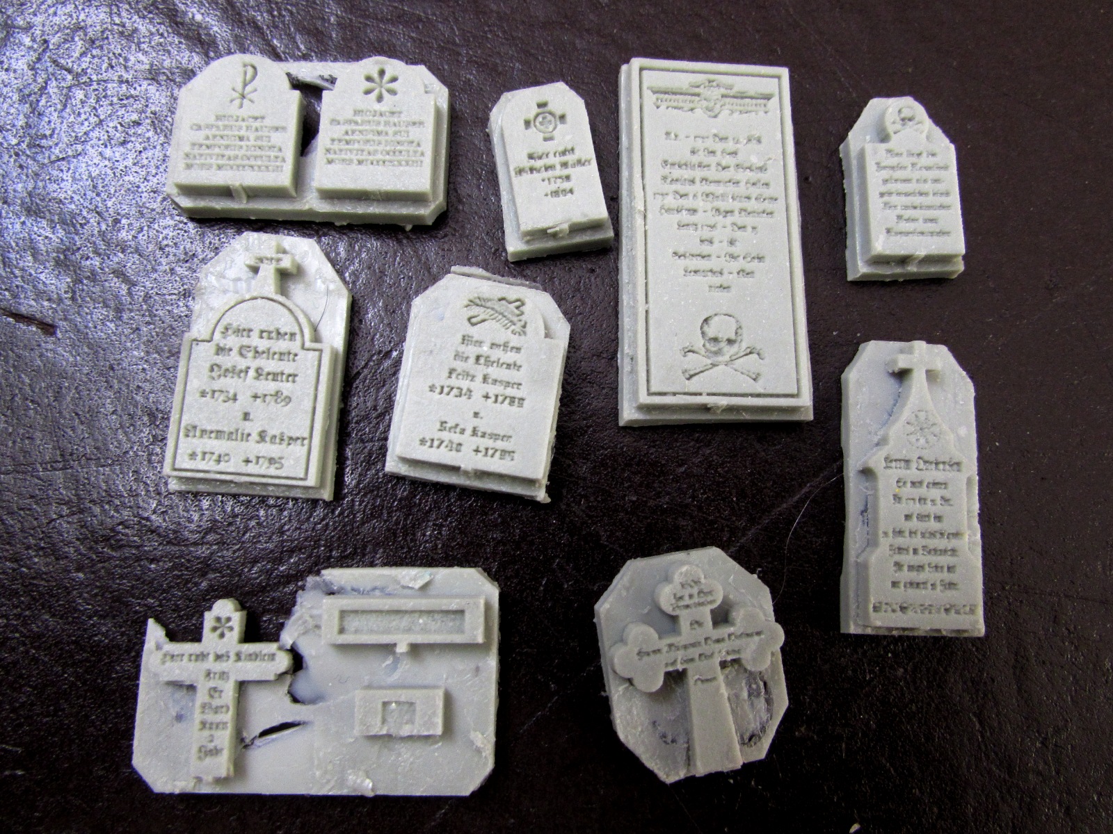 Если к вертикальным памятникам не придраться в плане качества и удобства обработки при снятии с питателя, то горизонтальные плиты напоминают Modelkrak, поскольку отлиты на сплошных "постаментах", и срезать-зачищать все это будет не так уж и просто. Это печально, поскольку некоторые из этих плит смотрелись бы и в вертикальном положении.