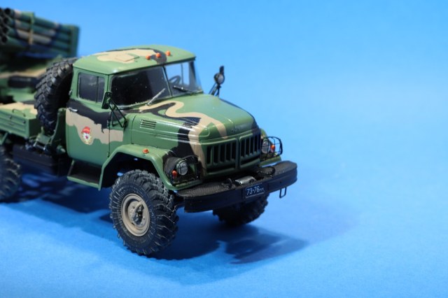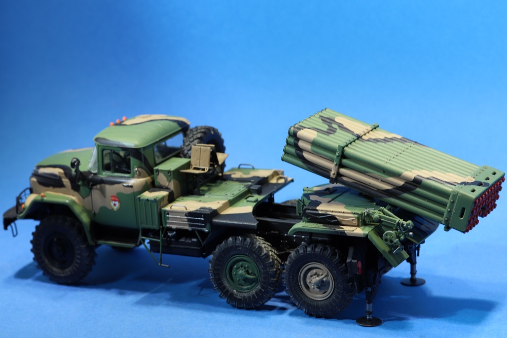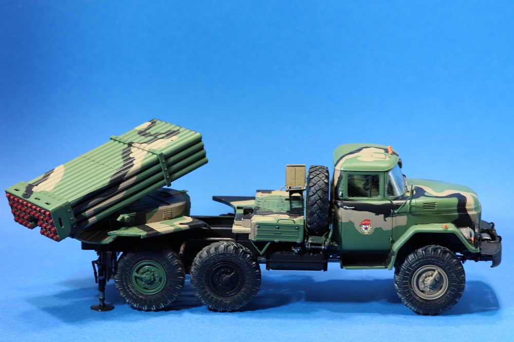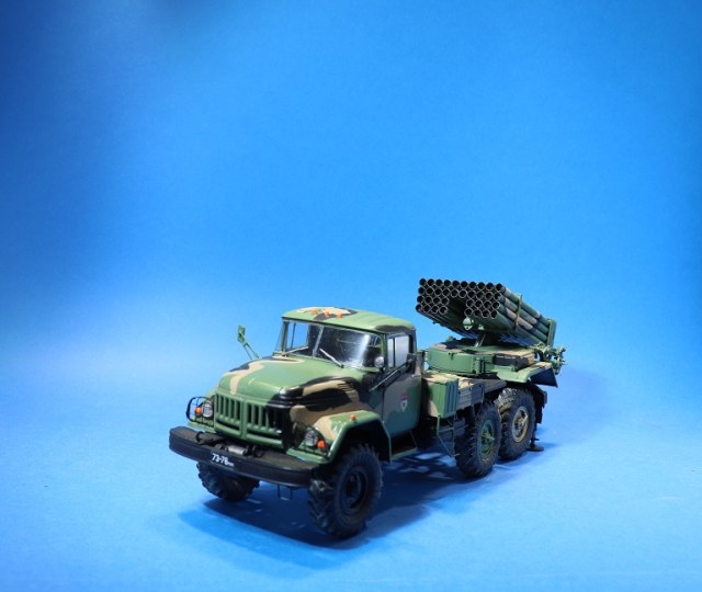 Представляю модель "Града", на базе Зила. Хороший набор, все собирается с удовольствием. Даже кабина села без особых проблем. Модель собрана в боевом варианте, так как задние упоры даны в выдвинутом положений. Хорошо в галерее есть одна модель Mongola. Спасибо за своевремменное пожелание относительно крепежа установки к основанию. Что я и сделал, установка свободно вращается и хорошо держится на основании. В комлекте дано травление, покапаться пришлось с защитой фар. Комуфляж чисто выдумка, без привязки к конкретной машине. Нужно сказать пару слов относительно переднего стекла. Стекло немного не догнуто, хотя при усилий садится хорошо. Поэтому пришлось устанавливать на супер клей. Немного отразилось, но все же осталось терпимо чистое. Краски Tamyia , hobby color, немного смывки и лак. Слегка припудрил колеса и раму.