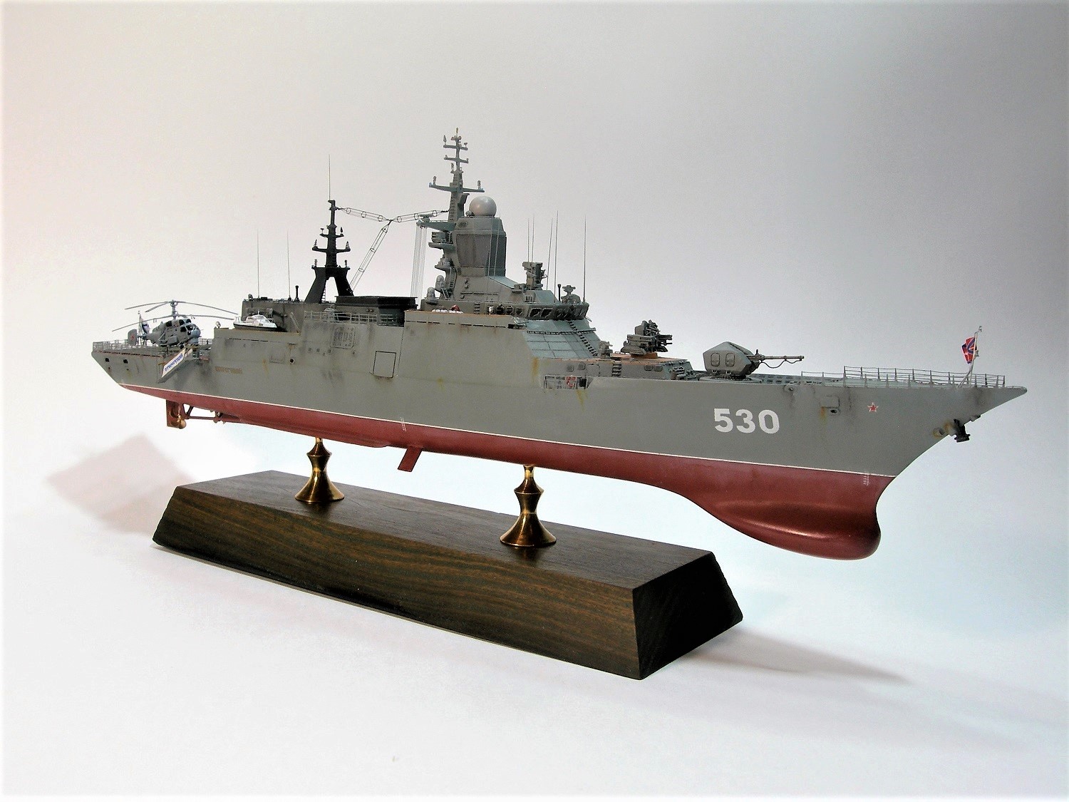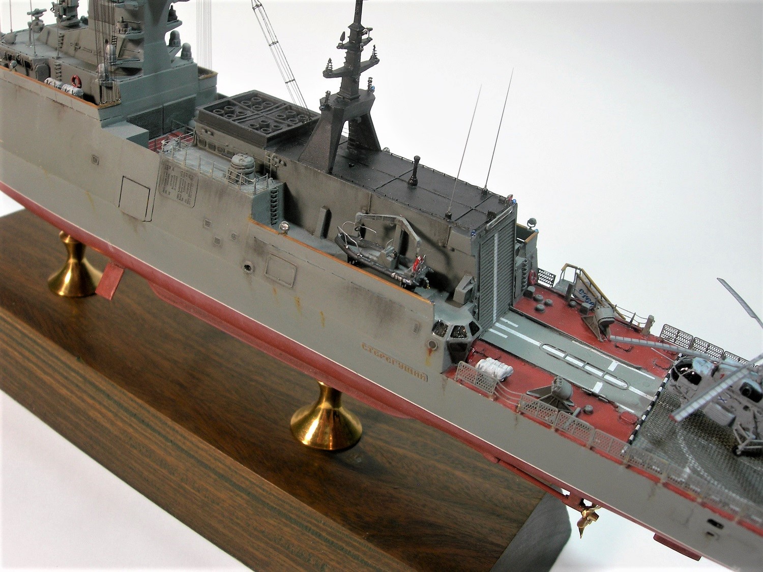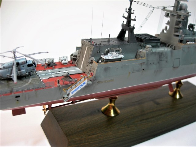 Декали в основном "родные". Качество хорошее, но много нервов стоила борьба со ступенькой. Из дополнений- надпись на обвесе забортного трапа (спасибо Алексею Бацких за безупречную работу), звезда на носу (Бегемот "ВМФ СССР/Россия),на катер, дежурную шлюпку и Ка-27 - сборная солянка из старых запасов.