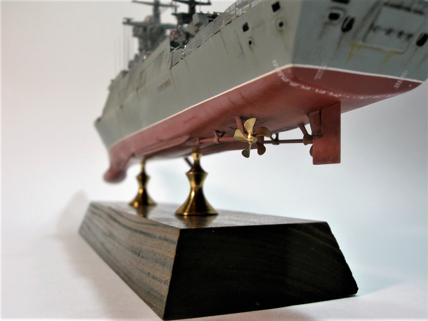 Окраска выполнена акрилом от TAMIYA. Оригинальных оттенков подобрать не смог, поэтому смешивал полагаясь на цвета кораблей, находящихся в пределах видимости. Ну и с оглядкой на фотографии, конечно. Окраска винтов- аэрозоль от KUDO, цвет- золото.