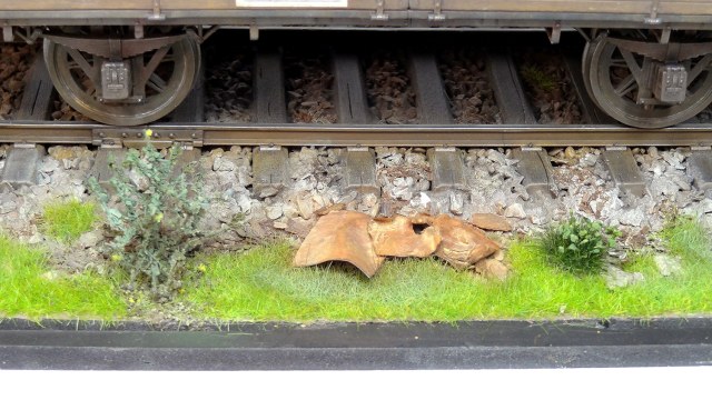 Здравствуйте, уважаемые коллеги! Наконец закончил виньетку! В постройке принимали участие наборы от Miniart 39004 1/35 и CSM35003 1/35, и немного самодельщины: километровый столб, тормозные башмаки, кошка, ржавые листы. Зелень, тоже все самодел. Сверху все закрывается акриловым колпаком.