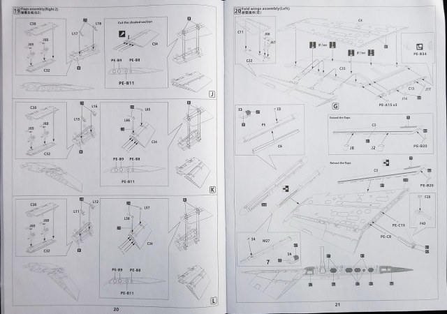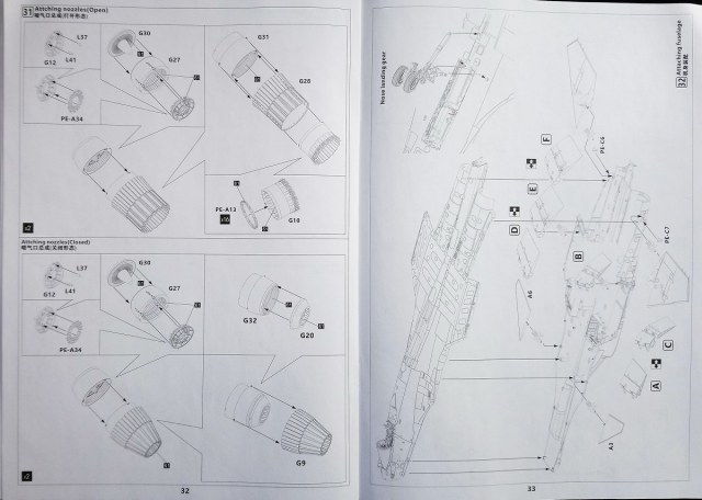 Сборка модели как обычно начинается с кабины. И первым собирается кресло пилота. Так вот, оно настолько деталировано, что его монтаж занимает аж две страницы инструкции по сборке. И далее все остальные узлы самолета отлично детализированы. Отсюда такое количество деталей. Даже обжатые пневматики даны с маркировкой. И плюсом ко всему, присутствуют подробные декали всех технадписей на всех агрегатах и узлах этого истребителя. То есть, стопроцентное сходство с прототипом. Теперь остановлюсь на прозрачных деталях модели данного самолета. Прозрачность остекления кабины потрясающая! И что интересно, на обеих деталях присутствуют слабозаметные линии разъема. Которые всё равно потребуется убрать и заполировать. Остальные детали такого же замечательного качества. А их количество совпадает с данным прототипом. ФТД детали расположены на трёх латунных пластинах разных размеров. И отлично дополнят законченность модели. Этот набор предполагает два варианта – с разложенными крыльями и с палубной стоянкой со сложенными крыльями и рулями высоты. Следовательно, кто решит делать второй вариант пусть приготовится к применению большего количества деталей из-за сложных механизмов складывания крыльев. Деталировка двигателей также потребует внимательности и усидчивости. Ввиду такого же немалого количества различных деталей. Даже есть закрытые сопла в варианте полёта.