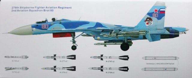 Вооружение этого палубного истребителя включает применение ракет средней и малой дальности таких как: Р-27Р, Р-27ЕР, Р-27Т, Р-27ЕТ, Р-73Е и Р-73Л. Копийность данных ракет высокого качества и полностью повторяют образцы данного вооружения. Всё это наглядно видно на снимках.