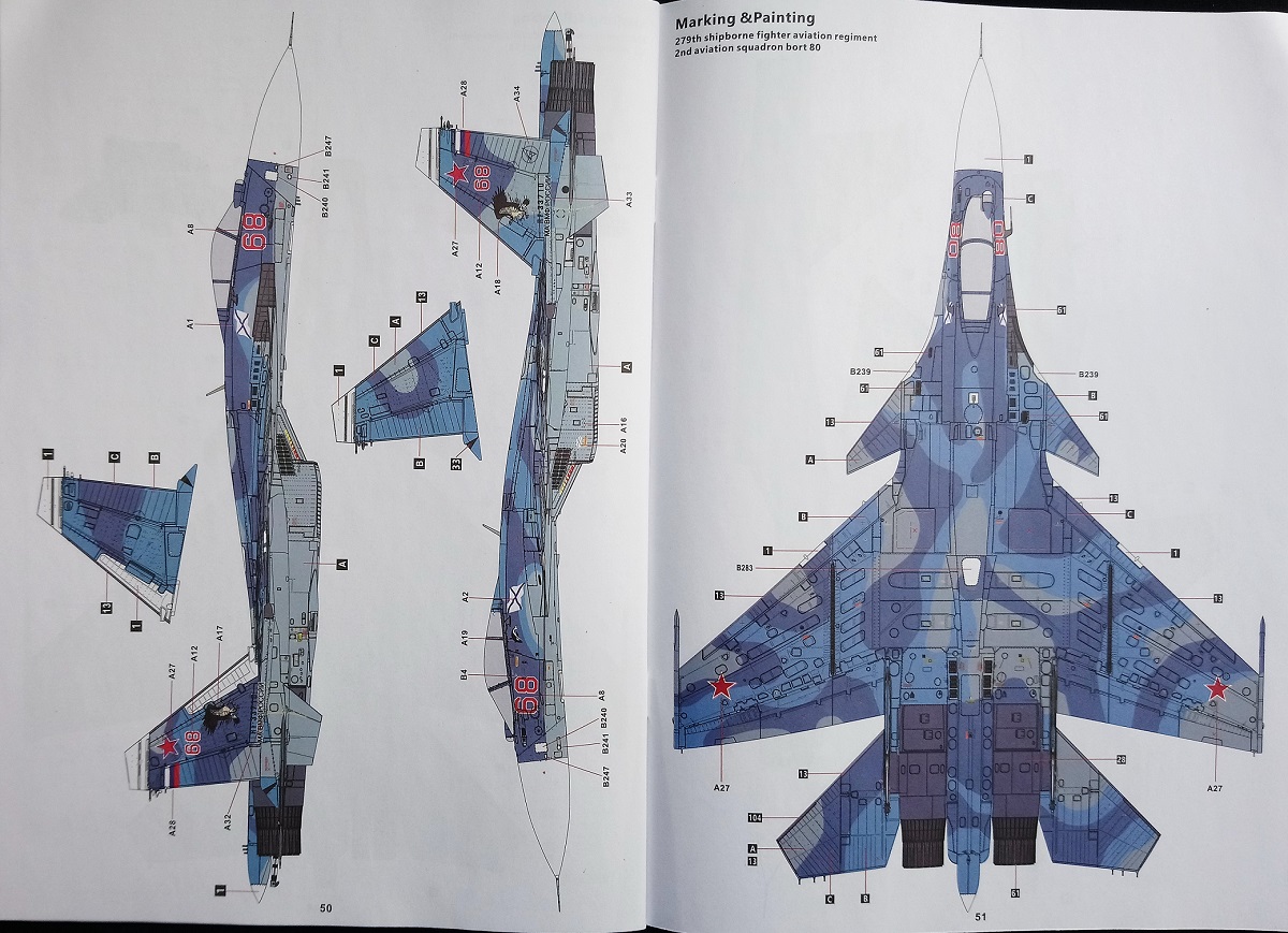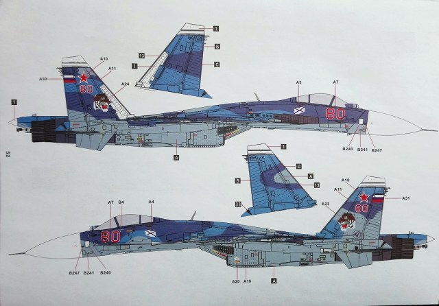 Пару слов о декалях. Они разработаны компанией GALAXYDECALSи отпечатаны в Китае. Включают в себя четыре листа (один маленький) И тоже превосходного качества. Печать без сдвигов и явных ошибок. Очень подробная как для самолета, так и для вооружения, пилонов и ОЗ трёх бортов ВМФ России 86, 80 и 68 с ТАКР «Адмирал Кузнецов».