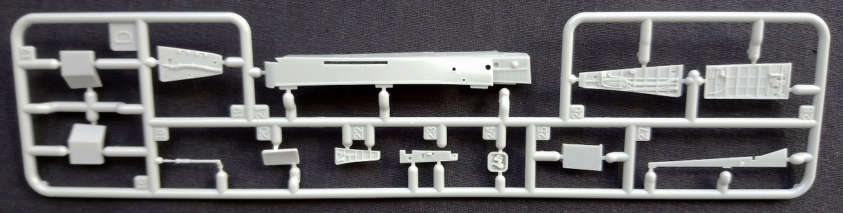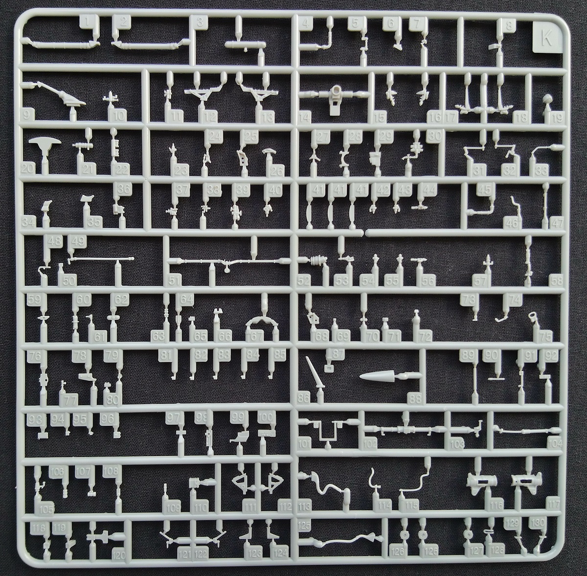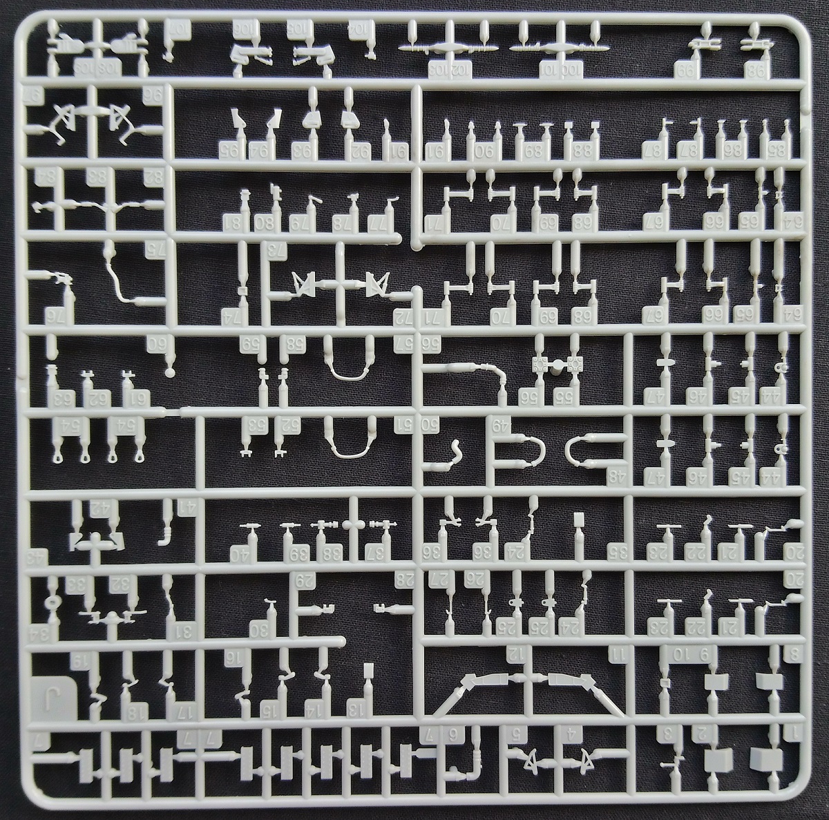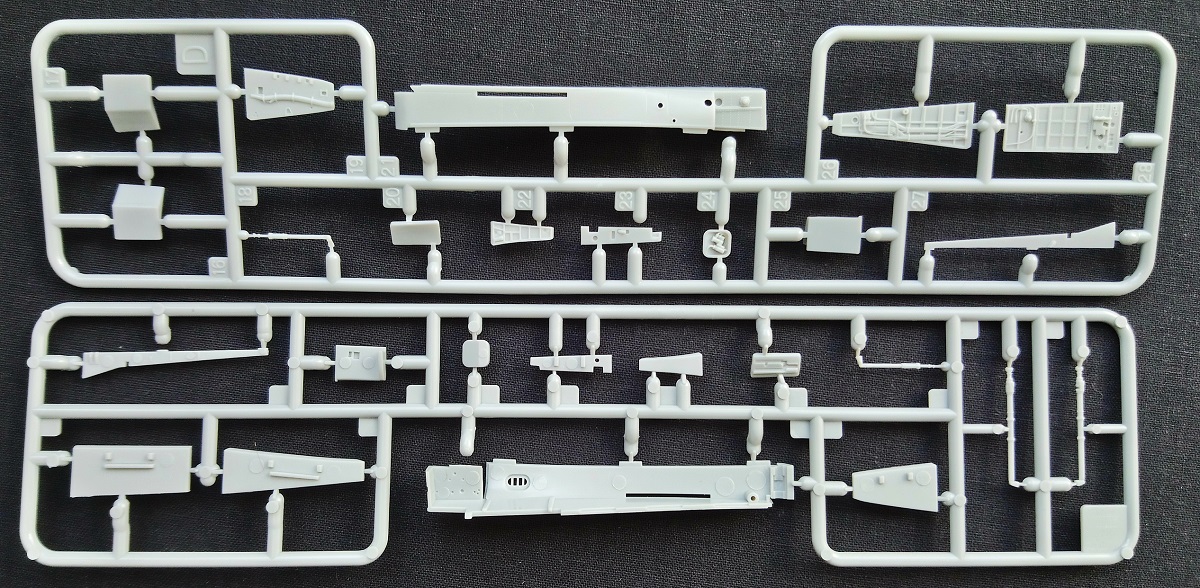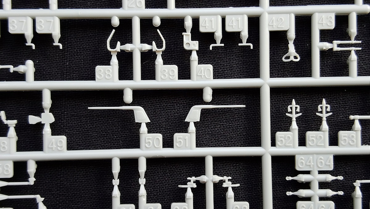 Минуя лирическое отступление, начнем повествование. В картонной коробке размером 460 х 300 х 100 мм находится огромное количество деталей (670) из полистирола серого цвета в различных упаковках (полиэтиленовых (которые удобно открываются) и картонных), вероятно для лучшей логистики потребителю. Если конкретно, то их всего 14 больших и 12 мелких рамок вооружения, рамка с прозрачными деталями, три пластины с ФТ деталями + буклет по сборке, декалированию и окраске данного самолета Конечно же есть рамки с парными деталями. Как и в предыдущей (моей обзорной) модели производитель даёт бонусом центральный ПВД из латуни