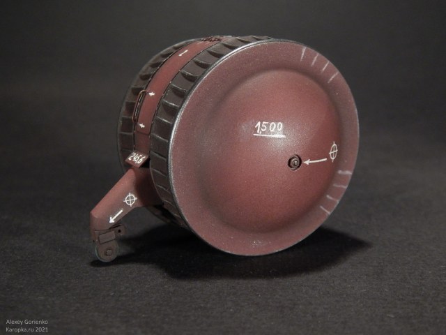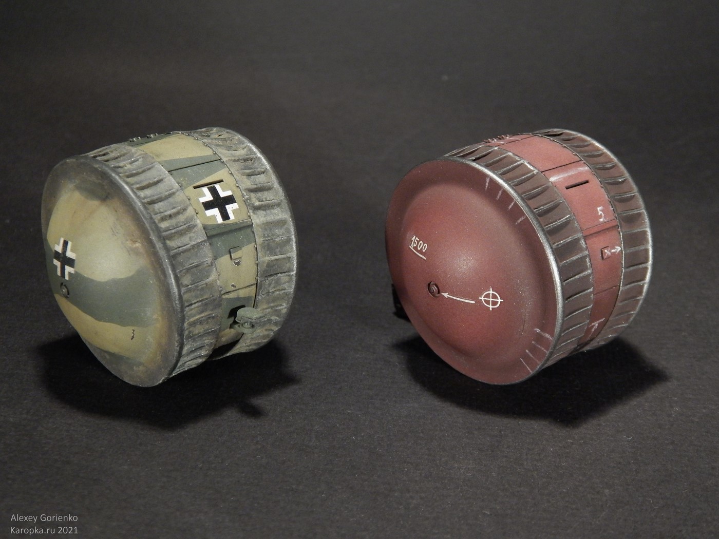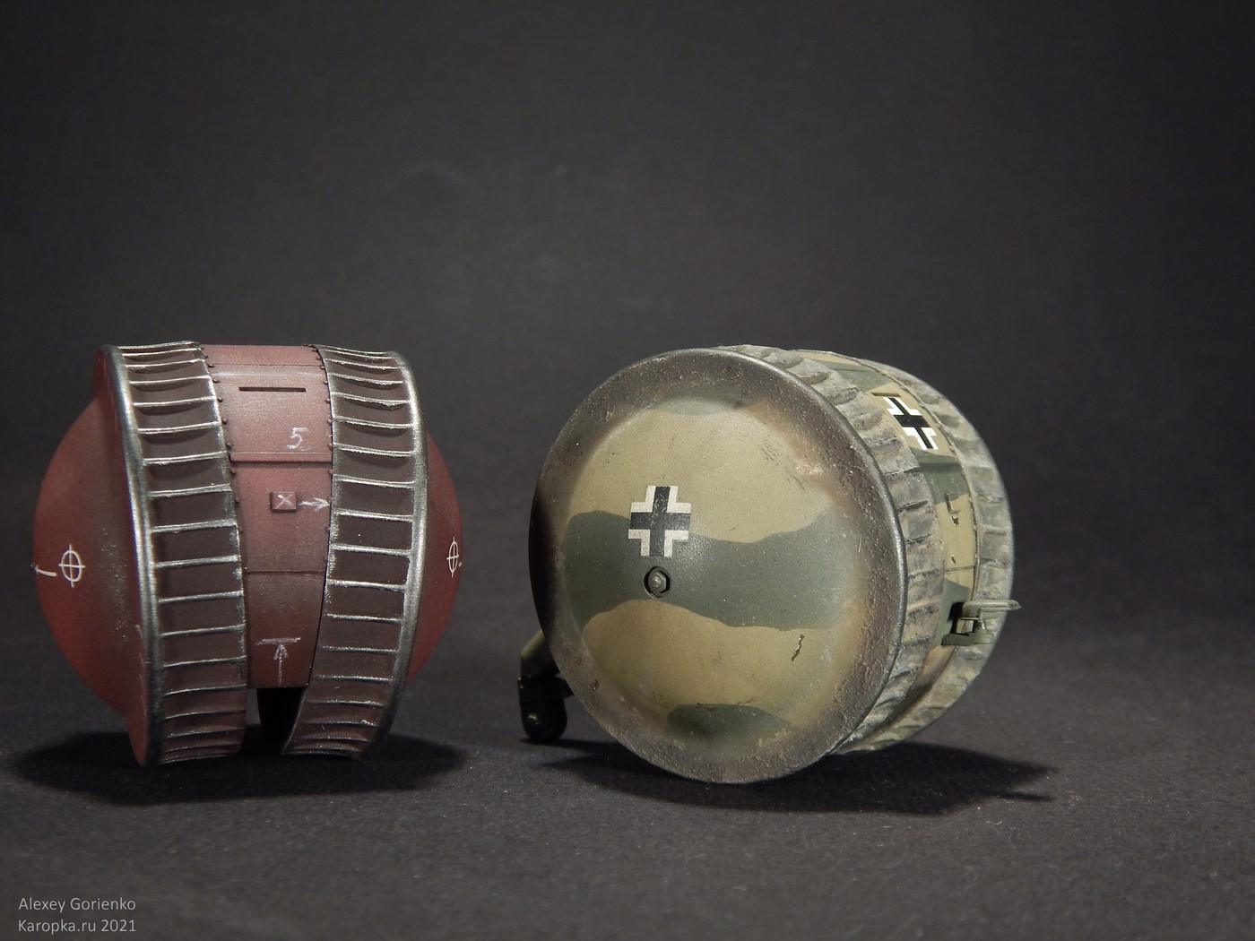 Делать "музейный" вариант не было никакого желания, т.к. сейчас это грустный, залитый насмерть серой краской шар. Поэтому я обратился к предложенным производителем вариантам. Красный шар - вариант прототипа, который окрашен только в грунтовку и имеет различные технические надписи. Грязи на нем нет, поскольку я решил, что если он и катался где-то, то разве что по цеху. На прототипном варианте я срезал фару, чтобы внести хоть минимальное отличие со второй моделью. Вторая модель - это вариант "Что если" - если бы это изделие приняли на вооружение. Тут все без изысков - выдуманный камуфляж и грязь.