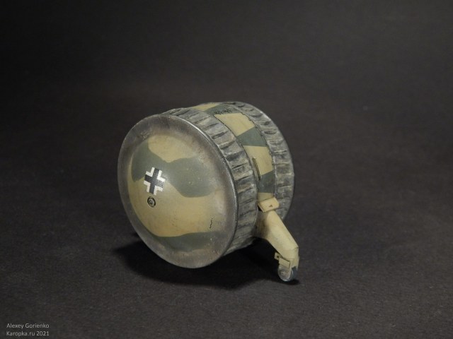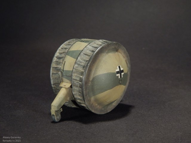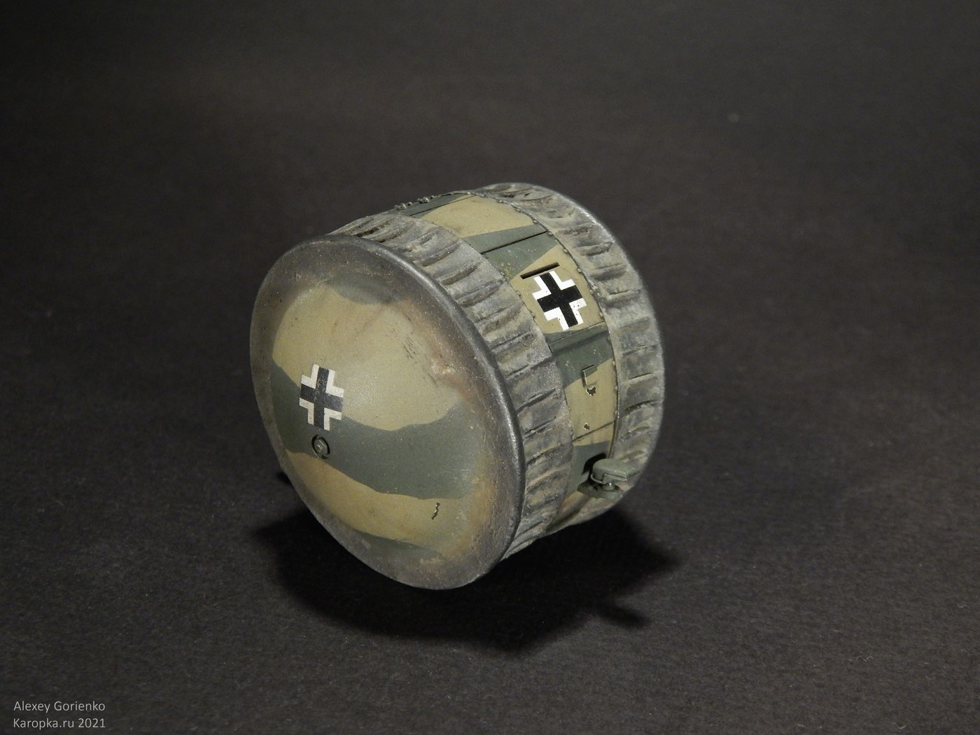 Das Werk известен тем, что это фирма-перепак, т.е. своих наборов у них нет или почти нет, в свои коробки они пакуют наборы, разработанные, или, как минимум отлитые другими производителями. Amusing Hobby же, это фирма-косяк. Не считая первых трех моделей, разработанных еще когда Амьюзинг был японским, каждая последующая модель имеет какие-то косяки, будь то косяки мат.части, косяки, вызванные упрощениями, или просто косяки литья, или, попросту - брак. И косяк конкретно этой модели в абсолютно на 100% неудачном членении деталей. Колеса разбиты на две части и стыковой шов проходит ровно посредине колеса по жутко неудобному рельефу. Я провел три или четыре сессии шпаклевания и последующего сошкуривания по этому шву, чтобы вывести ровную поверхность. В целом, придраться больше не к чему, не считая проблемы со швом, модель элементарно простая. Если сравнивать ее с музейным прототипом, производитель доработал модель, приведя ее к более законченному виду - они добавили фару нотек, козырек от грязи над опорной "ногой" и более внятно обозначили дверцу, через которую "пилот" попадал внутрь танка.