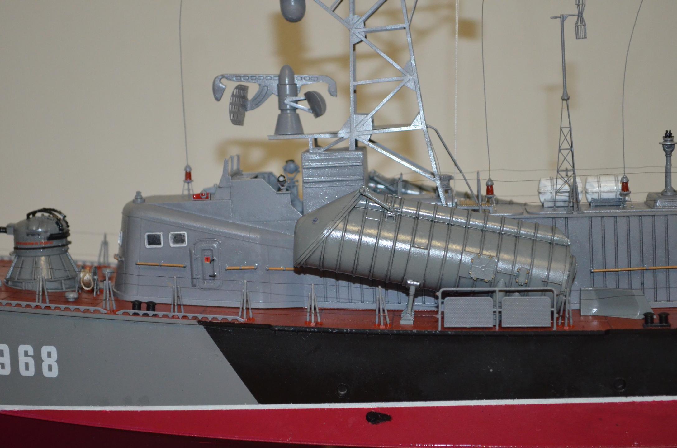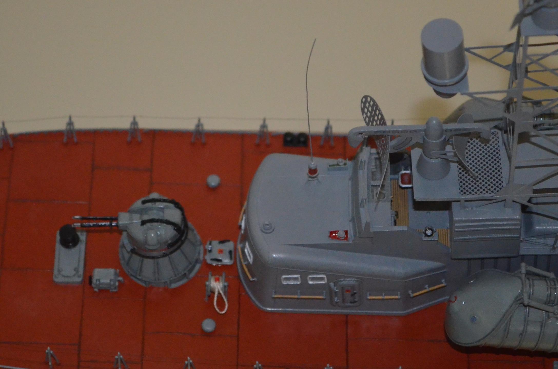 Приветствую! Модель понравилась, а особенно крупные планы! Удивительно, но это так, что в близи модель смотрится интересней чем с расстояния . Порадовала хорошая проработка артиллерии и ракетных аппаратов, надстройка и расшивка палубы. Очень понравилось леерное ограждение. Мачта и РТВ расположенное на ней, выглядит, не в пример, другим деталям несколько упрощенно. Я за галерею!