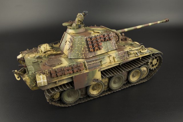 На мой взгляд, камуфляж этот один из самых сложных в плане исполнения, касательно "Пантер" так уж точно. Надо отметить что видимо действительно были варианты его исполнения, т.к. на фото обычно больше "перехлёста" зелёных и коричневых дисков, и командирская башенка также явно "в горошек". В общем случае и экраны бортовые тоже камуфлировались именно "в горошек", но тем наверное интересней выбранный Автором вариант.
