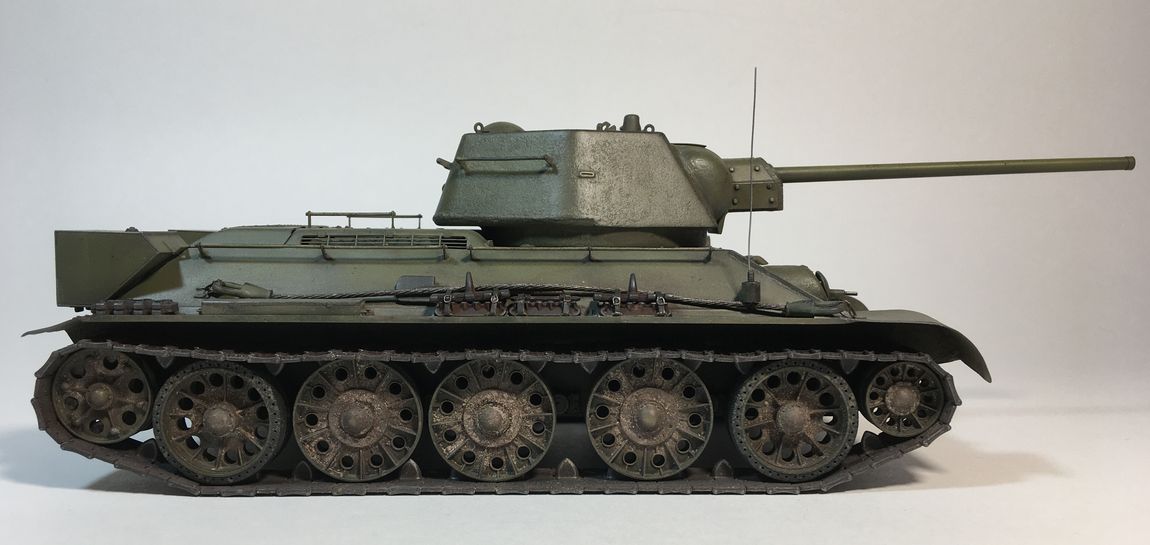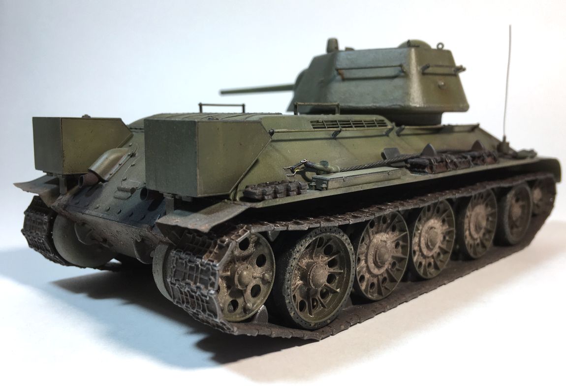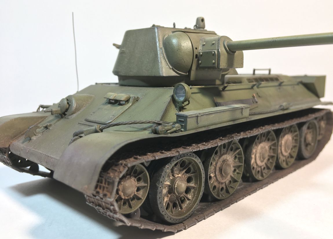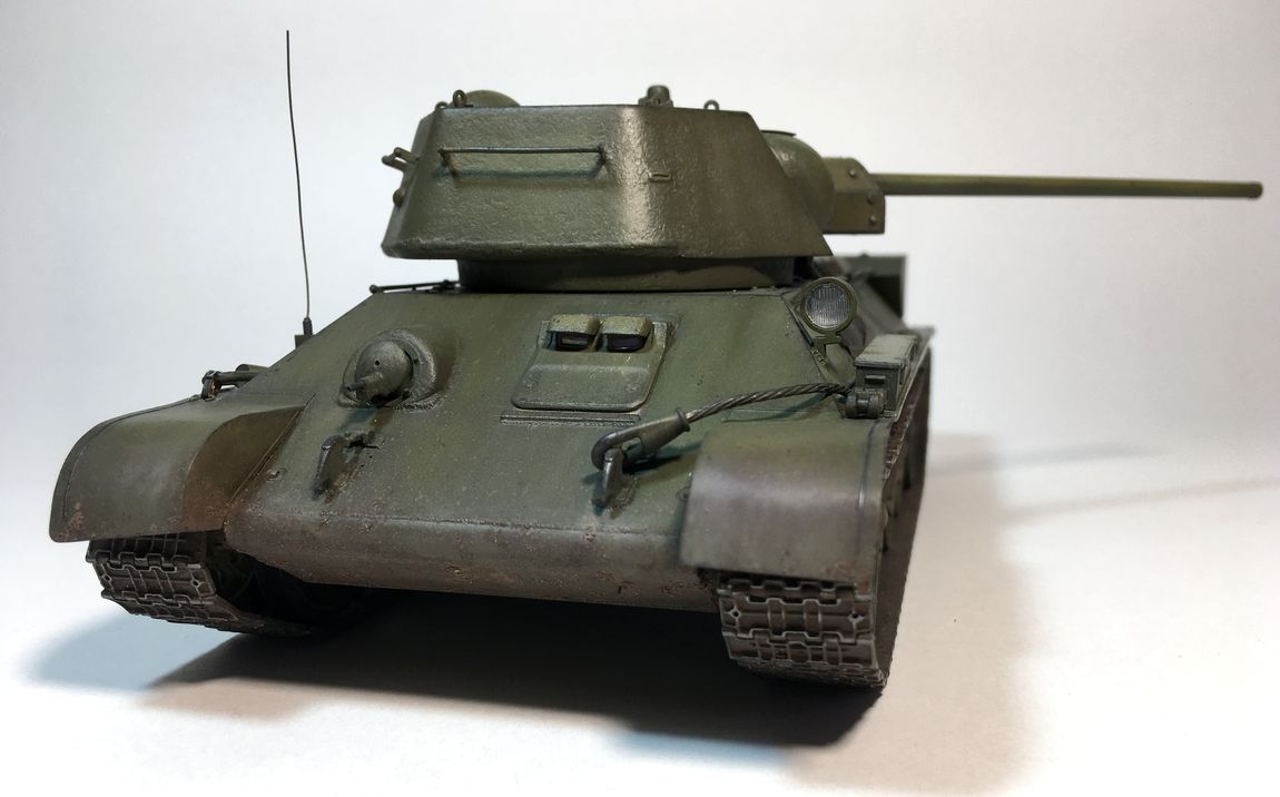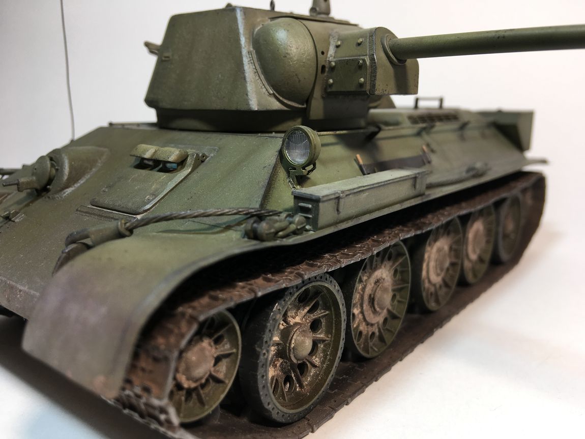 Доброго времени суток Уважаемые моделисты. Хочу представить вою модель танка Т-34 57. Модель от Звезды. Проблем при сборке не было. При постройке использовалось травление Микродизайн и Арма моделс- точеный ствол орудия ,передние и задние брызговики, сетки мто, жалюзи мто, трос,поручни, пила . Также скобы на корпусе заменил на проволоку, пулемет заменил на иглу,добавил проводку к фаре,добавил где необходимо свырные швы и следы газорезки.. При покраске использовал Тамию. Далее смывка , масляные точки и добавил следы износа и погодные эффекты пигментами и масляными красками.