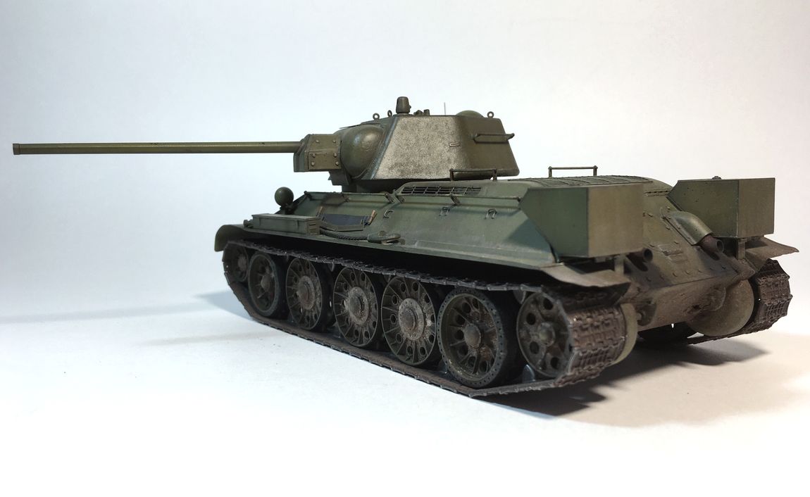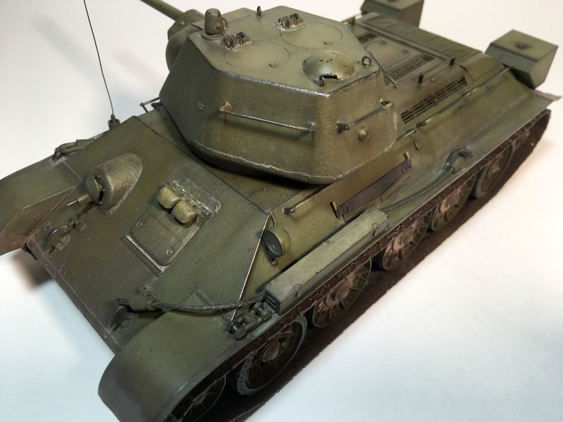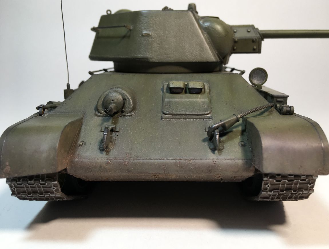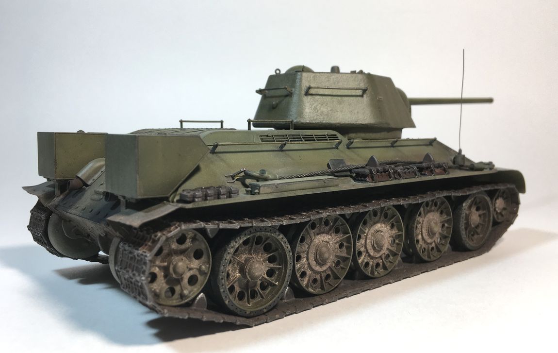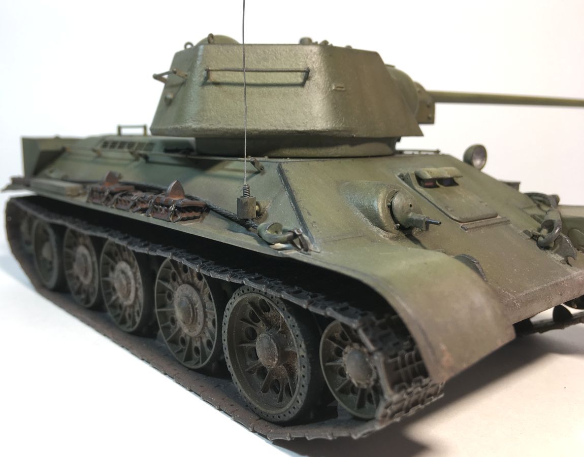 Доброго времени суток Уважаемые моделисты. Хочу представить вою модель танка Т-34 57. Модель от Звезды. Проблем при сборке не было. При постройке использовалось травление Микродизайн и Арма моделс- точеный ствол орудия ,передние и задние брызговики, сетки мто, жалюзи мто, трос,поручни, пила . Также скобы на корпусе заменил на проволоку, пулемет заменил на иглу,добавил проводку к фаре,добавил где необходимо свырные швы и следы газорезки.. При покраске использовал Тамию. Далее смывка , масляные точки и добавил следы износа и погодные эффекты пигментами и масляными красками.