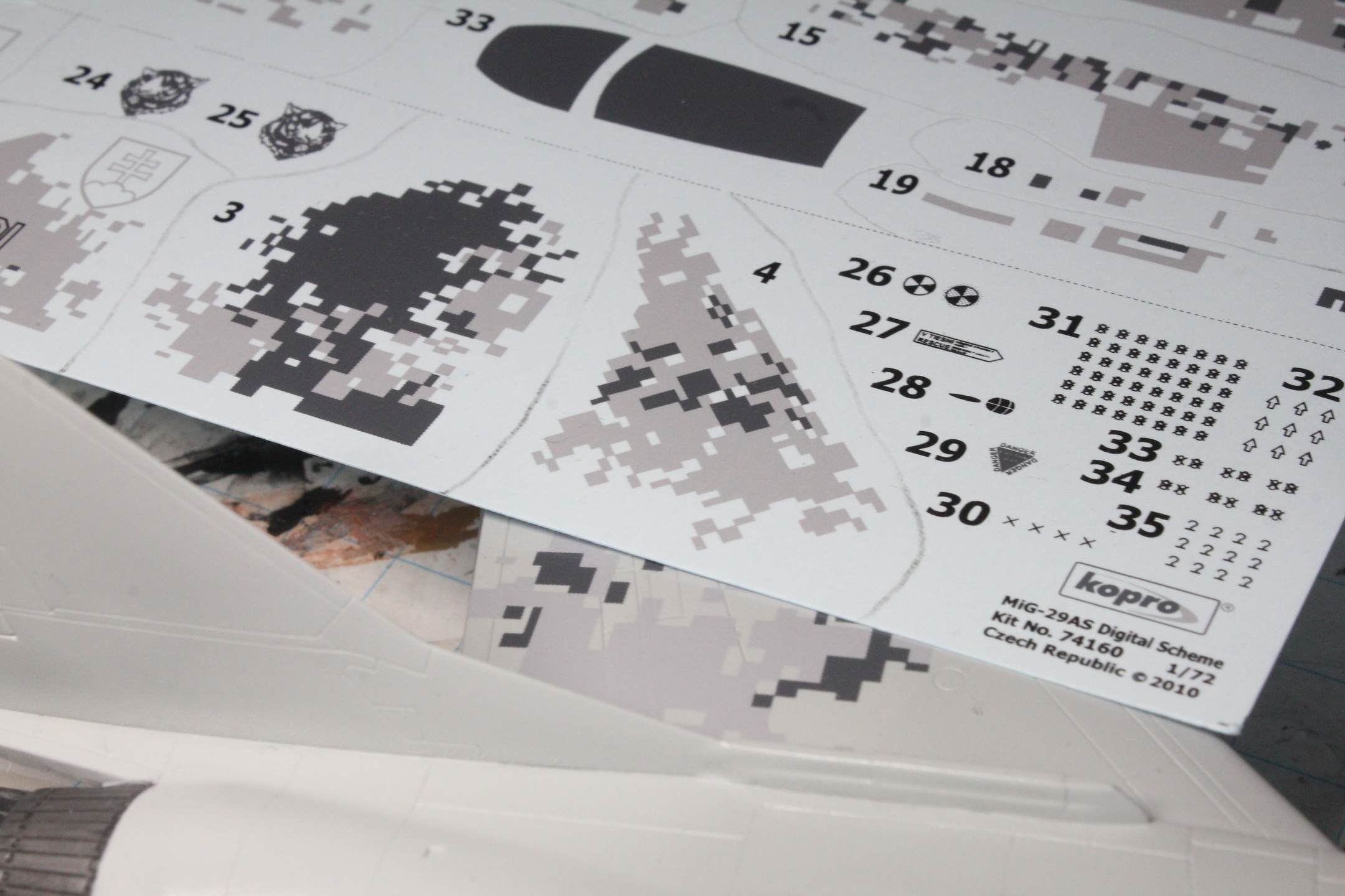 3) Ошибки. Опознавательные знаки словацких ВВС на всех найденных мной фотках этого борта имеют темно-серый цвет. Тут дан светло-серый. Значки излучения по бокам носового конуса были раза в 2-3 больше, чем надо. Пришлось печатать их отдельно. И то немного великоваты. Декаль радиопрозначной панели на гаргроте дана неверным цветом. В итоге она ушла на заплатки по другим местам.