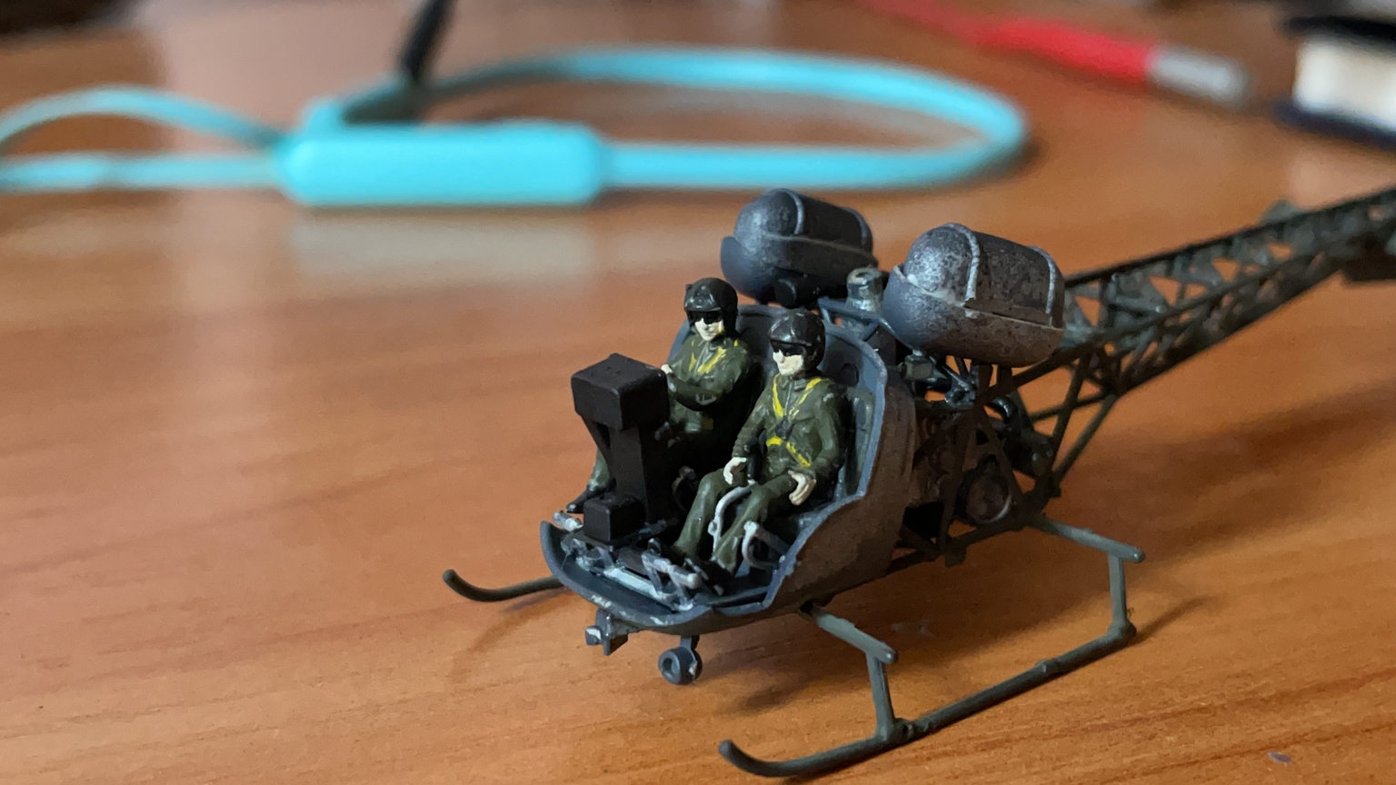 Модель идёт без фигурок пилотов, что смотрелось лично как по мне - довольно скучно. Но тут я вспомнил про то, что дома валяется загубленный в свое время набор МИ-24 от Звезды, при том там фигурки даже не отделялись от литников. В общем, посадил я советских военлётов в забугорную технику - так модель выглядит на мой взгляд более законченной, если можно так выразиться. Пришлось правда немного нагревать и гнуть ноги одной из фигурок. Иначе в прозрачную "скорлупку" он бы не поместился.