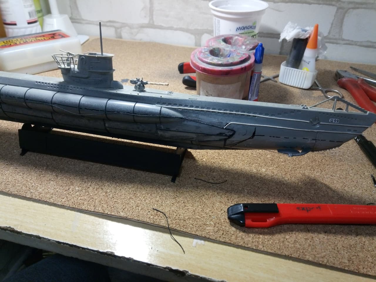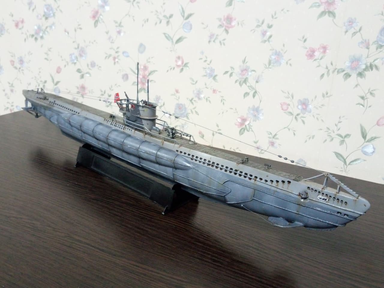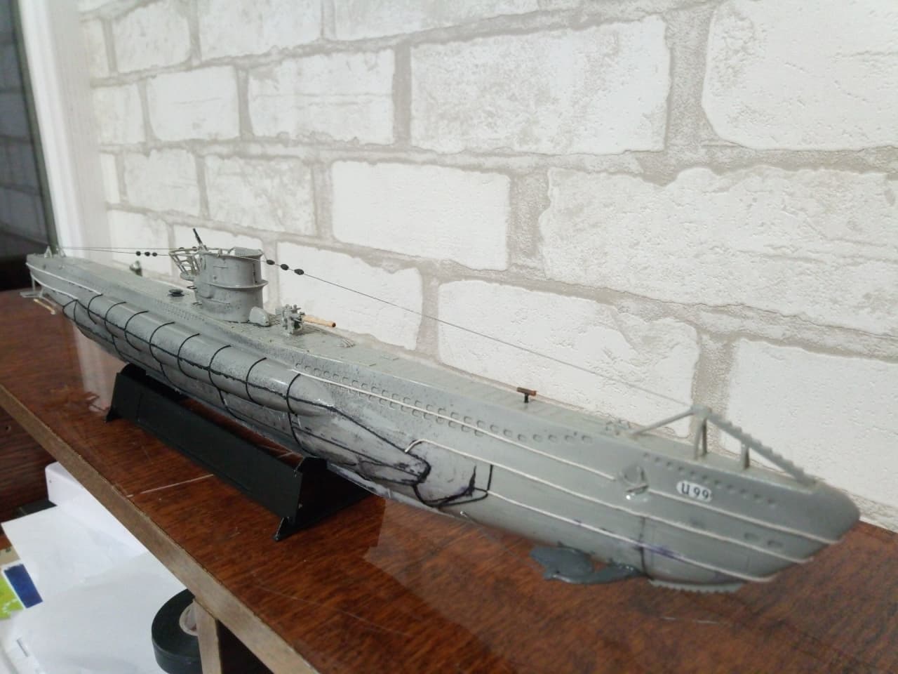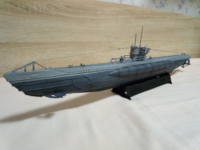Здравствуйте уважаемые господа, моделисты ! Представляю на Ваш суд мою первую модель, немецкой подводной лодки VII B серии - "U-99". Командиром которой был самый результативный подводный ас - Отто Кречмер. История лодки и биография её командира известна всем,кто хоть немного интересуется военной историей. Думаю ,что будет уместным её пропустить. Отмечу только,что в этом году 17 марта исполнилось ровно 80 лет, как она ушла на дно. И флаг, мы с сыном, подняли именно в этот день. Было волнующе. Степень износа модели ориентирована на второе боевое патрулирование в составе 7-ой боевой флотилии. Лодка вышла из Вильгельмхафенна 27 июня 1940г. и обогнув Британские острова, через Датский пролив, пришла во Французкий порт Лорьян 21 июля 1940, пробыв в море 25 дней. За время похода потопила 7 кораблей. Патруль был не легким. Лодка ударялась о дно, три раза была атакована кораблями эскорта. Теперь ,немного пред истории. Лодку подарили нам безвозмездно, уже собранную ,бог его знает когда. Видимо ,жалко было выбросить.Голый ,как зеркало, корпус с остатками валов. Рубка с корзиной и фрагментами ограждения . Нож для разрезания противолодочных сетей и погрызенное орудие без ствола .Она была похожа на детскую игрушку. Вид был настолько плачевным, что сразу родилась идея восстановить её как получится и потом как получится покрасить кисточкой. Грубо говоря, сын меня взял на слабо. К моделизму я никогда , никакого отношения не имел и вообще не знал, что есть такой огромный мир.Но решился . После поисков в инете,подозрение пало на набор от Pevell в масштабе 1/125. Уровень сложности видимо начальный. Уж не знаю в каком году выпущенный. Короче раритет чистой воды.Стройка шла очень медленно. С приобретением новых знаний,новой информации ,задача не прерывно усложнялась, а отсутствие какого - ни было опыта ,ставило первоначальный радужный план в архи-сложное положение. Горы информации и ролики из Youtube ,постоянно перемешивались с возгласами :ААА!!! Вот как надо было! Блин. Поэтому нам многое просто закрывались глаза,и махалось рукой. Желание двигаться дальше , конечно забегало вперед паровоза. Вкратце по стройке . Так,как производитель любезно изобразил на рубке еле видимые подковы ,было решено делать ,как предлагается - лодку Кречмера . Рули глубины и направления ,защиту винтов ,делал чисто на глазок ,из буквально того,что под руку попадалось . Поэтому на техническое соответствие прошу смотреть снисходительно.Винты,вообще ,с четвёртой попытки стали походить на оные.Так как модель была начисто лишена всяческой расшивки,решил делать имитацию сварных швов из простой нитки. О том ,что литник можно зажигалкой тянуть, не знал и даже в голову бы не пришло.Клеил так-же на глаз.Очень старался. Но после нанесения грунта ,стало понято ,что с толщиной огромный косяк. Переделать не было моральных сил.Ограждение рубки восстановил родное. Так как паять не умею вообще .Перископы из швейной иглы и зубочистки. Троса из проволоки от эл. кабеля.Орудие и зенитный пулемет,кнехты и люк из отходов Лего. Ствол тоже из зубочистки. О модельных красках ничего не знал и красил художественными акриловыми красками ,купленными в ближайшем магазине канц. товаров. Что-то кисточками ,что-то самодельным аэрографом а-ля паста от ручки. Следы масла и нагара -туш для ресниц. Смывки-масленые краски и уайт-спирит. Ржавчина и сколы-то