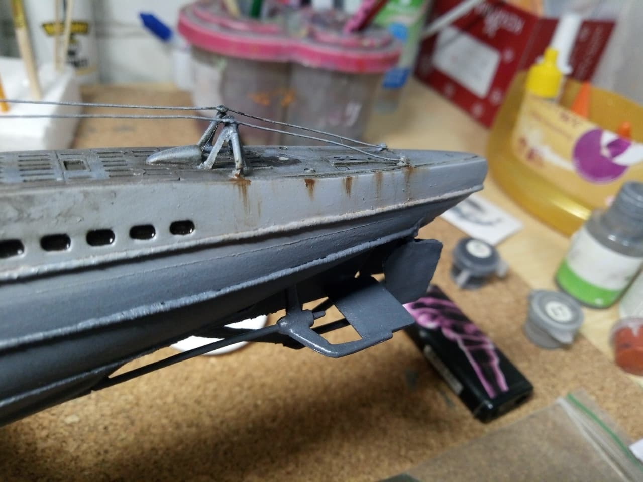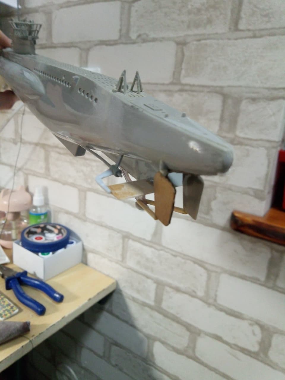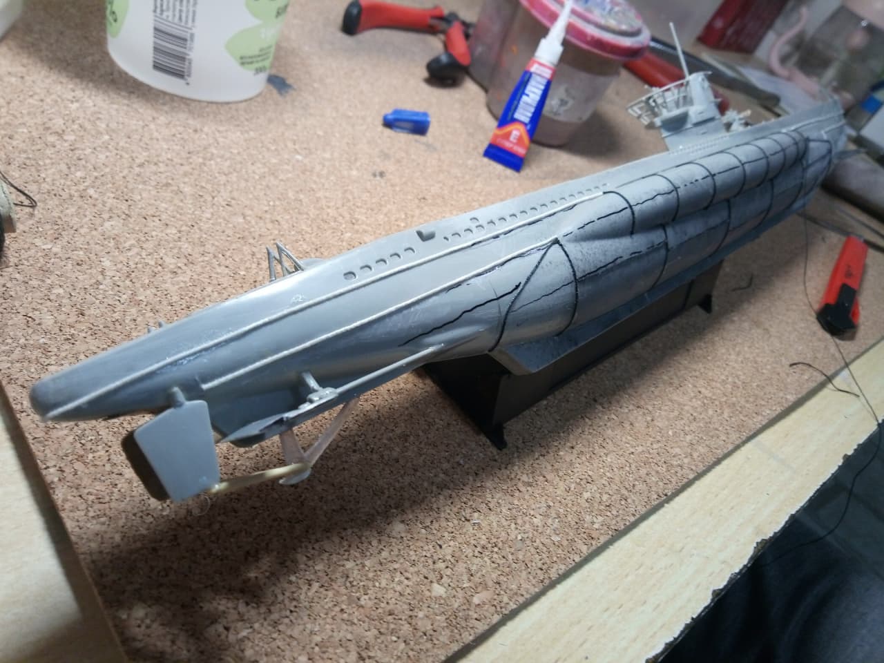 Здравствуйте уважаемые господа, моделисты ! Представляю на Ваш суд мою первую модель, немецкой подводной лодки VII B серии - "U-99". Командиром которой был самый результативный подводный ас - Отто Кречмер. История лодки и биография её командира известна всем,кто хоть немного интересуется военной историей. Думаю ,что будет уместным её пропустить. Отмечу только,что в этом году 17 марта исполнилось ровно 80 лет, как она ушла на дно. И флаг, мы с сыном, подняли именно в этот день. Было волнующе. Степень износа модели ориентирована на второе боевое патрулирование в составе 7-ой боевой флотилии. Лодка вышла из Вильгельмхафенна 27 июня 1940г. и обогнув Британские острова, через Датский пролив, пришла во Французкий порт Лорьян 21 июля 1940, пробыв в море 25 дней. За время похода потопила 7 кораблей. Патруль был не легким. Лодка ударялась о дно, три раза была атакована кораблями эскорта. Теперь ,немного пред истории. Лодку подарили нам безвозмездно, уже собранную ,бог его знает когда. Видимо ,жалко было выбросить.Голый ,как зеркало, корпус с остатками валов. Рубка с корзиной и фрагментами ограждения . Нож для разрезания противолодочных сетей и погрызенное орудие без ствола .Она была похожа на детскую игрушку. Вид был настолько плачевным, что сразу родилась идея восстановить её как получится и потом как получится покрасить кисточкой. Грубо говоря, сын меня взял на слабо. К моделизму я никогда , никакого отношения не имел и вообще не знал, что есть такой огромный мир.Но решился . После поисков в инете,подозрение пало на набор от Pevell в масштабе 1/125. Уровень сложности видимо начальный. Уж не знаю в каком году выпущенный. Короче раритет чистой воды.Стройка шла очень медленно. С приобретением новых знаний,новой информации ,задача не прерывно усложнялась, а отсутствие какого - ни было опыта ,ставило первоначальный радужный план в архи-сложное положение. Горы информации и ролики из Youtube ,постоянно перемешивались с возгласами :ААА!!! Вот как надо было! Блин. Поэтому нам многое просто закрывались глаза,и махалось рукой. Желание двигаться дальше , конечно забегало вперед паровоза. Вкратце по стройке . Так,как производитель любезно изобразил на рубке еле видимые подковы ,было решено делать ,как предлагается - лодку Кречмера . Рули глубины и направления ,защиту винтов ,делал чисто на глазок ,из буквально того,что под руку попадалось . Поэтому на техническое соответствие прошу смотреть снисходительно.Винты,вообще ,с четвёртой попытки стали походить на оные.Так как модель была начисто лишена всяческой расшивки,решил делать имитацию сварных швов из простой нитки. О том ,что литник можно зажигалкой тянуть, не знал и даже в голову бы не пришло.Клеил так-же на глаз.Очень старался. Но после нанесения грунта ,стало понято ,что с толщиной огромный косяк. Переделать не было моральных сил.Ограждение рубки восстановил родное. Так как паять не умею вообще .Перископы из швейной иглы и зубочистки. Троса из проволоки от эл. кабеля.Орудие и зенитный пулемет,кнехты и люк из отходов Лего. Ствол тоже из зубочистки. О модельных красках ничего не знал и красил художественными акриловыми красками ,купленными в ближайшем магазине канц. товаров. Что-то кисточками ,что-то самодельным аэрографом а-ля паста от ручки. Следы масла и нагара -туш для ресниц. Смывки-масленые краски и уайт-спирит. Ржавчина и сколы-то