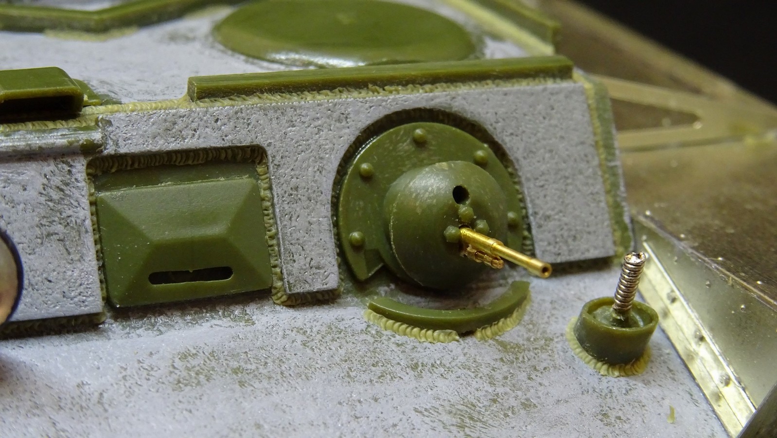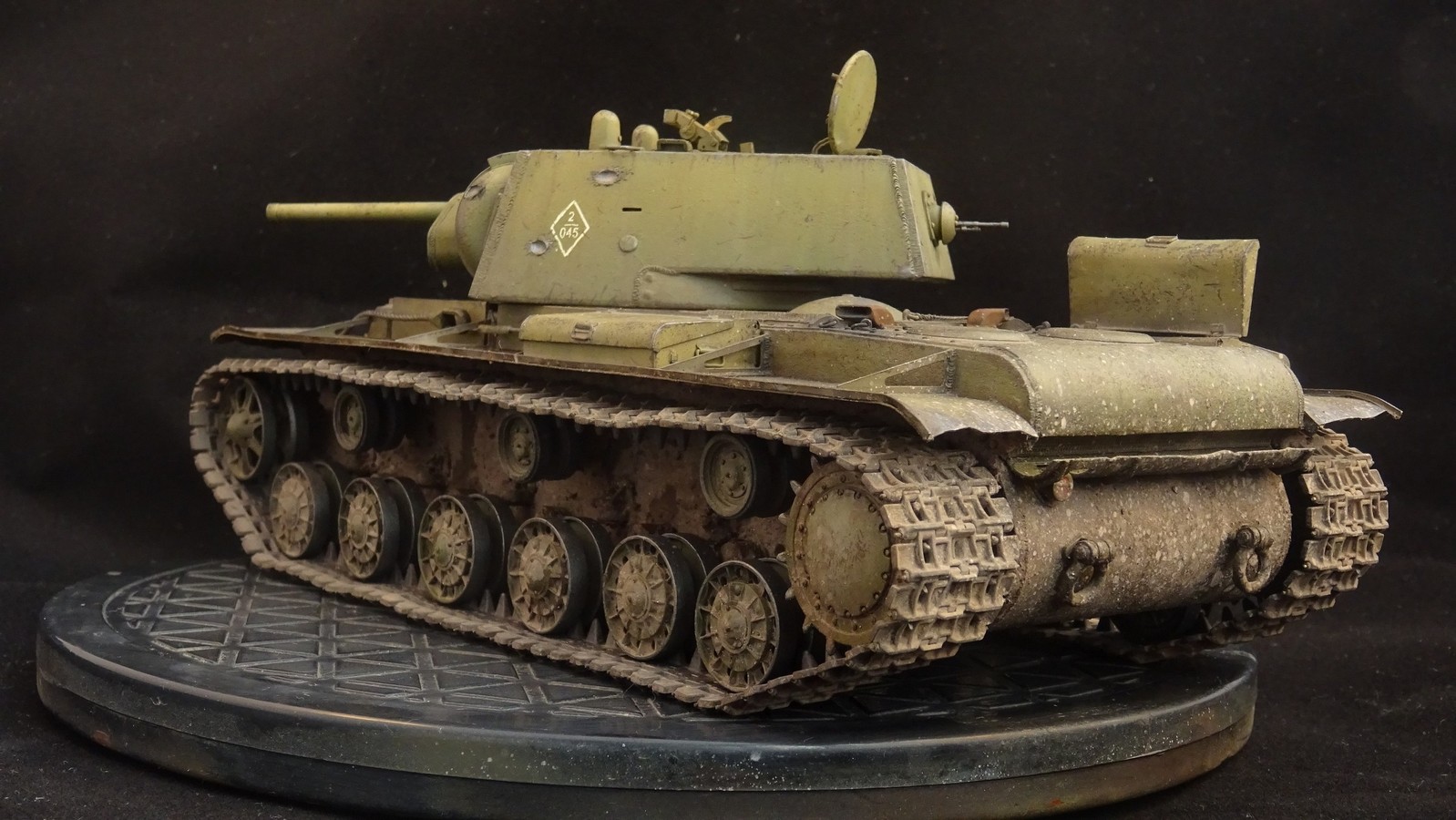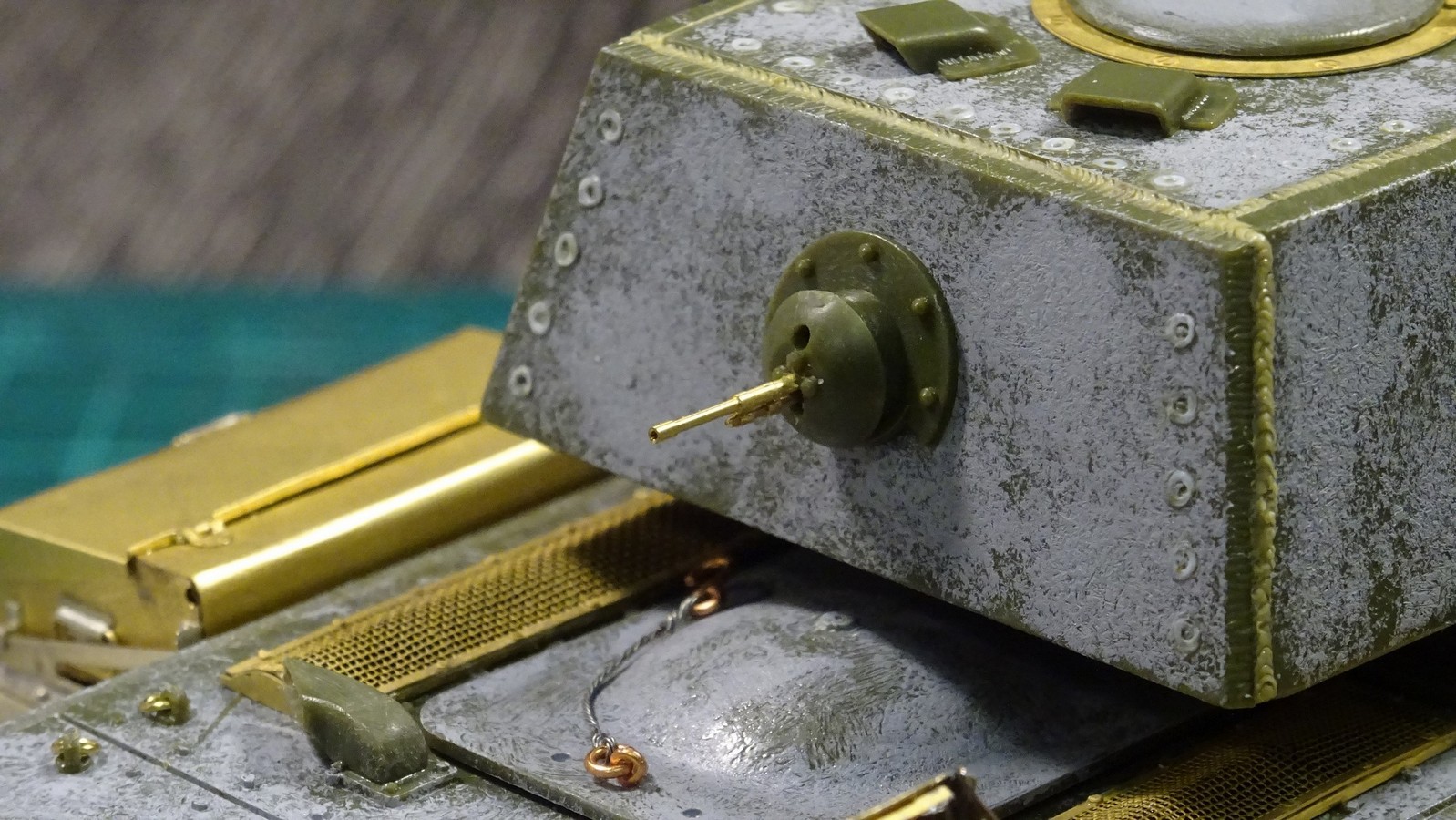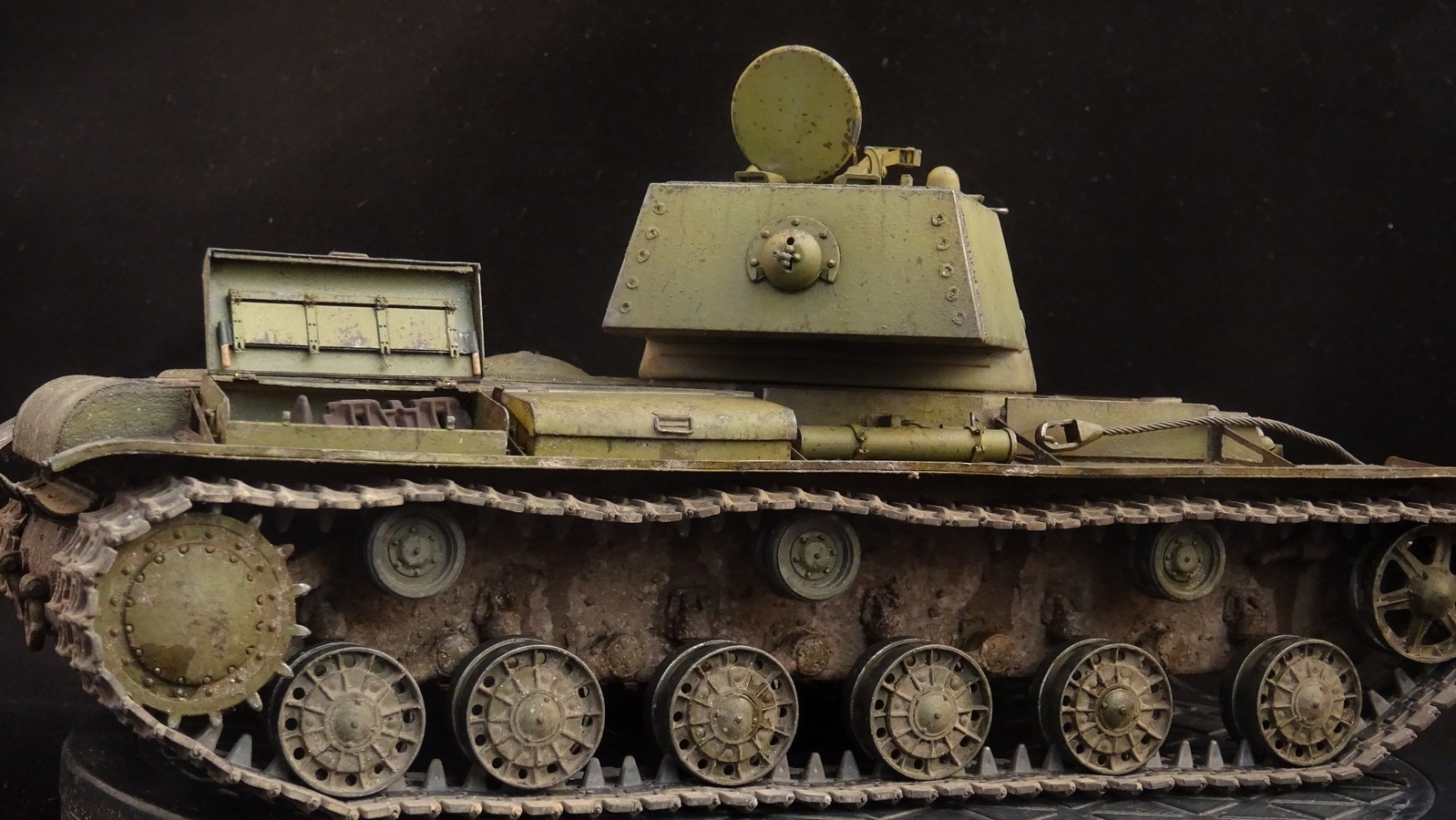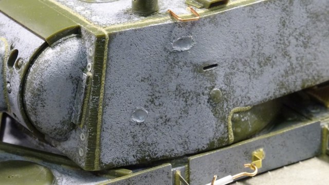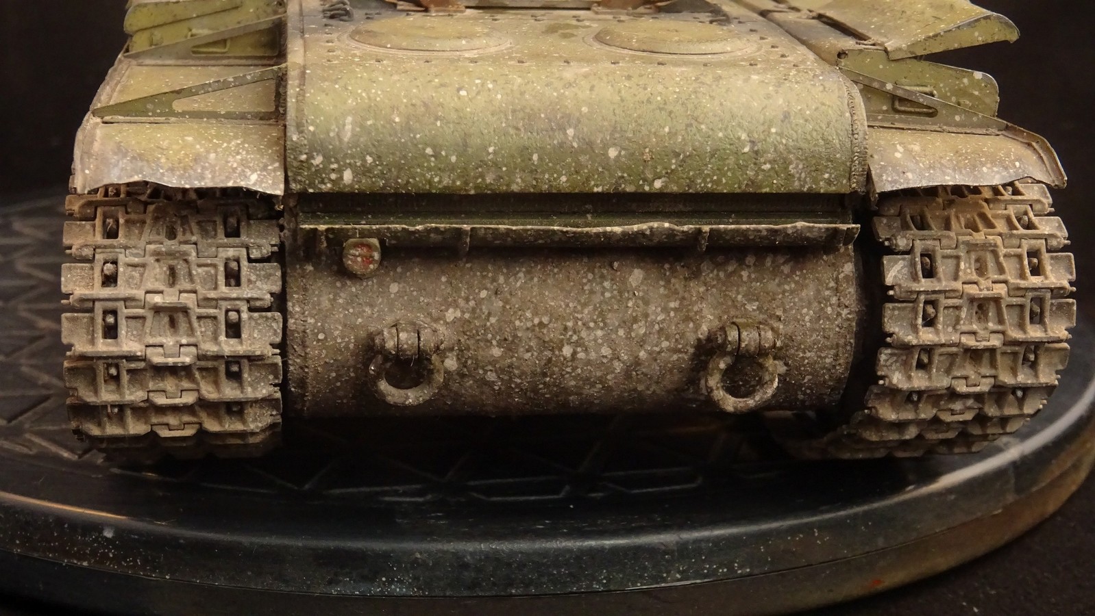 По самому корпусу с помощью шпатлевки была сымитирована структура катаной брони (на сколько успешно судить Вам), а также сварные швы. Швы я обычно делал из тянутого литника, но тут решил попробовать двухкомпонентную шпатлевку, и вы знаете, этот вариант мне понравился больше. Хочу сразу пояснить за матчасть, наверняка знатоки этой темы найдут массу замечаний (и мне кстати было бы интересно узнать каких), но целью стройки было придать танку реалистичной внешний вид не гоняясь за миллиметрами. Подробнее о сборке... столкнулся с некоторыми неприятными особенностями, например надгусеничные полки оказались длиннее необходимых, но я узнал об этом поздно и не стал переделывать. Ящики ЗИП от Эдуард не входили по ширине на полки же от Эдуард, пришлось искать альтернативу от Микродизайн, но у последнего металл жестче поэтому работать было не так комфортно. Гусеницы решено было закупить отдельно, и заморочиться сделать их рабочим, если честно, то еще удовольствие. По покраске... Грунт от АК причем делал двух цветов с одновременным прешейдингом, базовый цвет Ammo MIG 923 (если не ошибаюсь), ну и далее стандартный пакет, декали, смывка, сколы, точки, пыль, грязь. Модель собиралась для диорамы "Они сражались за Родину" выставленной в Норильском музее боевой славы. Стройка этой и других моделей, а также изготовление самой диорамы можно посмотреть здесь.