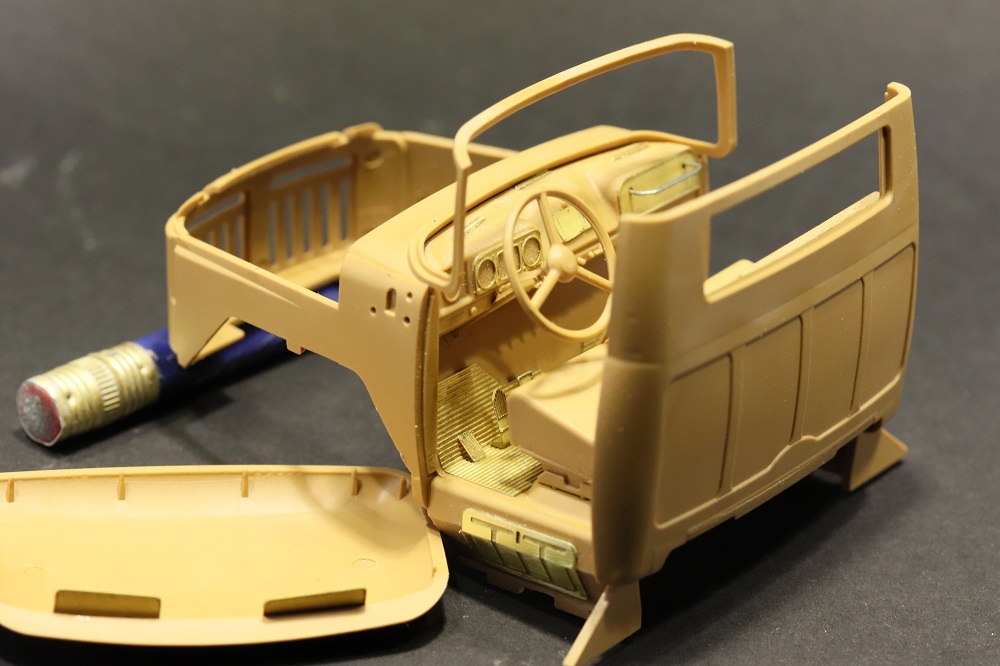 Чтоб веселее было прикупил великолепное травление от Микродизайна. Расчитано оно правда на обыкновенный грузовик. Но посколько решил грузовик от трумпетера делать, то к этому кунгу оно подошло отлично. От себя добавил еще огнетушитель с держателем. Резина родная.