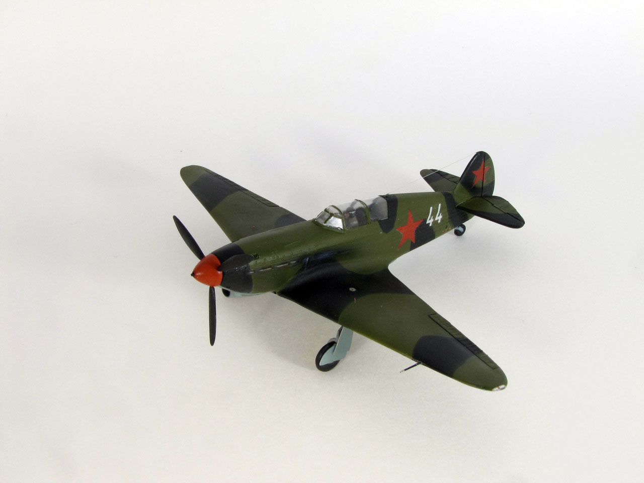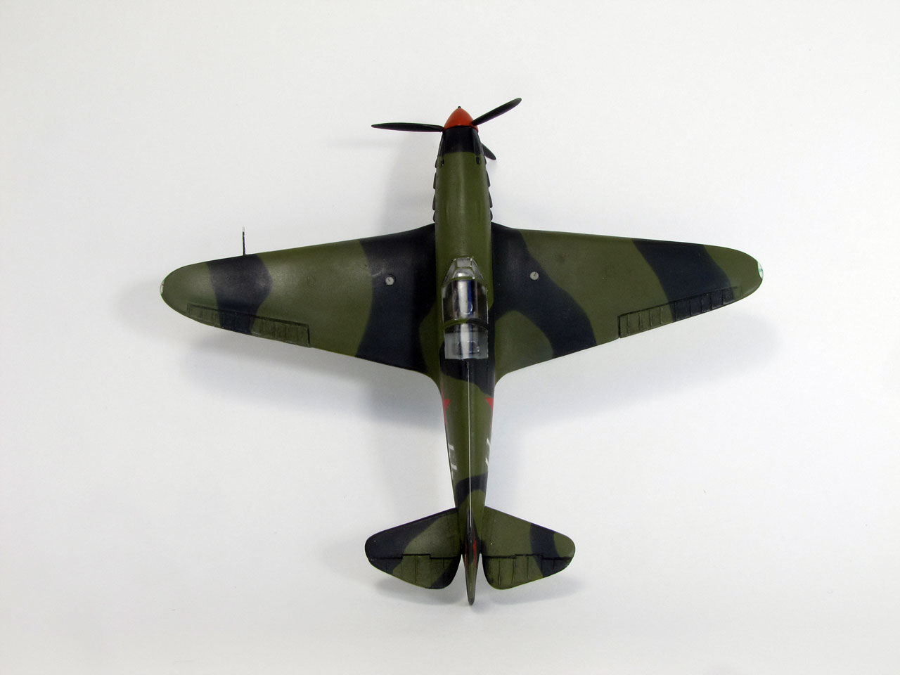 Доработки по минимуму: заменил фонарь кабины из комплекта на фонарь от falcon, немного проработал ниши шасси, попытался поправить кок винта, пулеметы, ПВД - иглы от шприцев, солдатики - леска, антенна - мононить. Конструктивную критику и замечания приветствую.