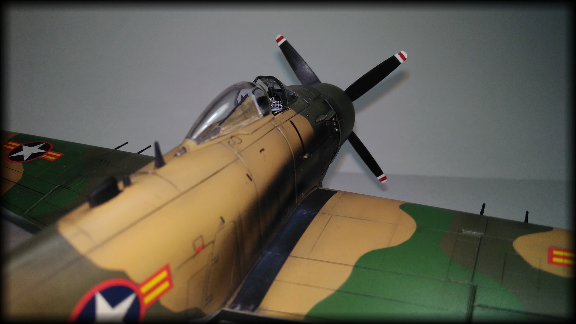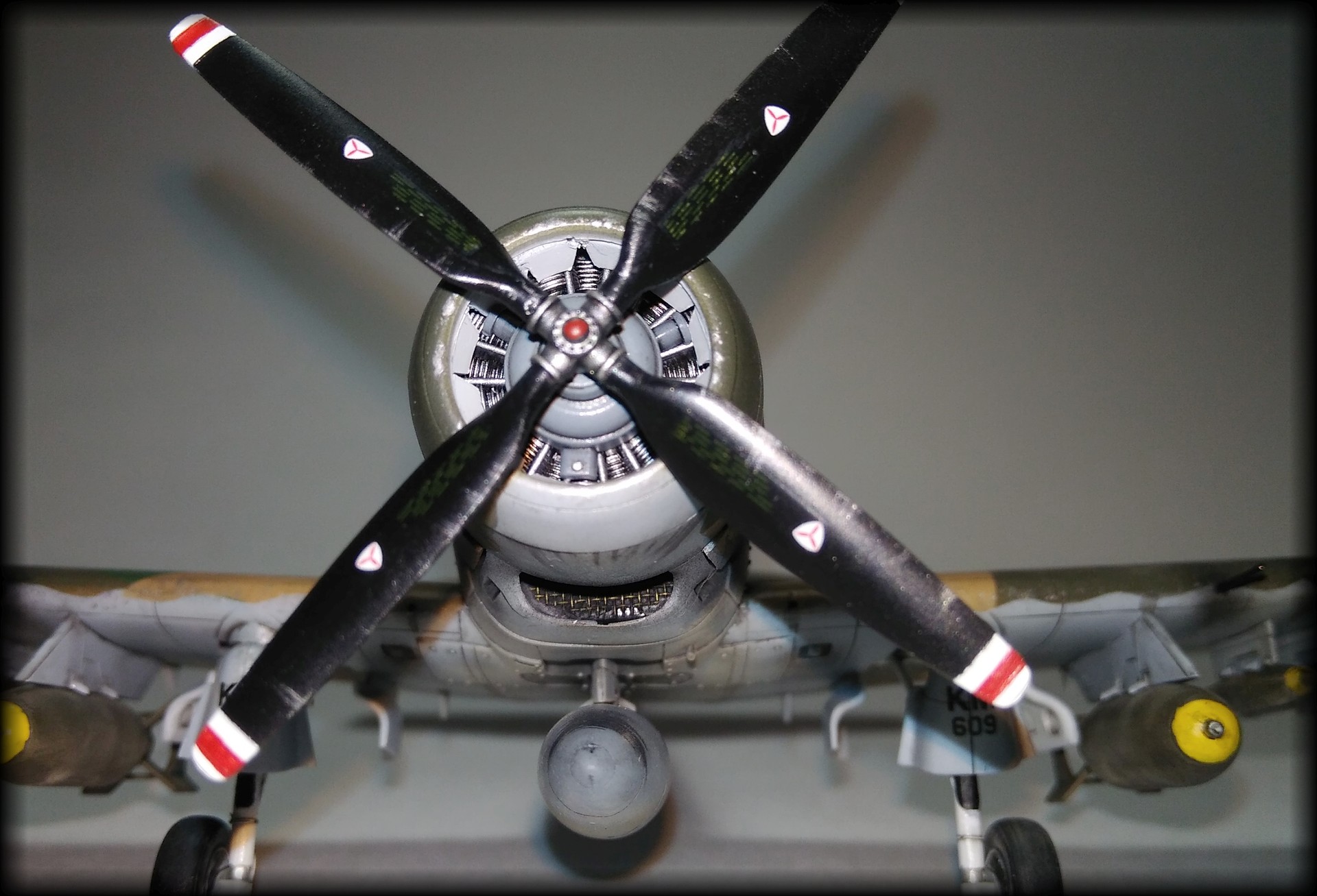 Насколько я понял, выбранный мной вариант довольно ранний. Могу ошибаться, просто отсутствие/наличие разных антенн намекает... Сперва хотел оставить как есть, но все же здравый смысл пересилил и, с уже окрашенной модели, были срезаны лишняя наклонная антенна и фонарь на киле. Пришлось делать другую антенну, Hasegawa её не предусмотрела. Так же немного добавлены шланги и трубы в ниши и на стойки шасси. Набор латунных пушек и ПВД от Master так же немного облагородил модель.В воздухозаборник маслорадиатора добавил сетку. Створки воздухозаборника двигателя были сплошные и закрывали полностью сам двигатель. Поэтому разрезал их и загнул внутрь. Так двигатель стало хоть немного видно. Выхлопные патрубки рассверлил. Больше ничего не пилил)