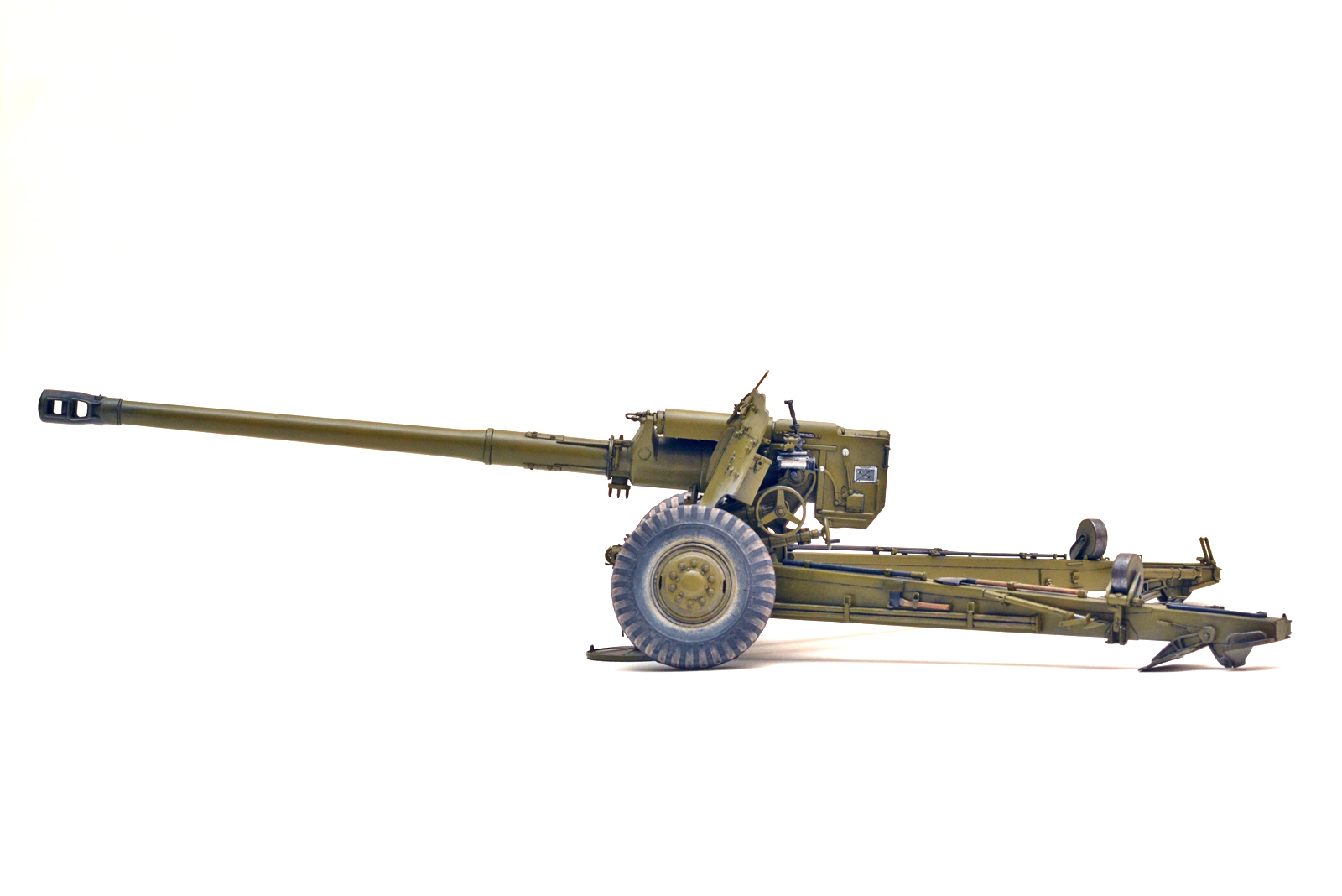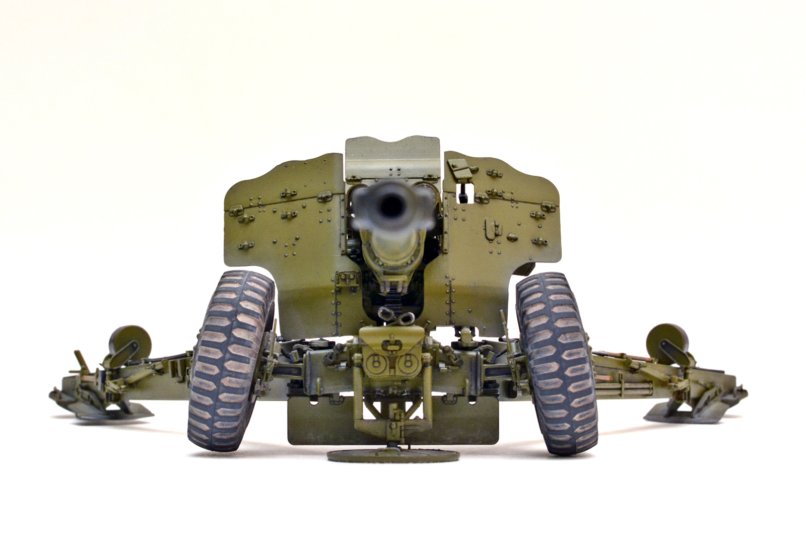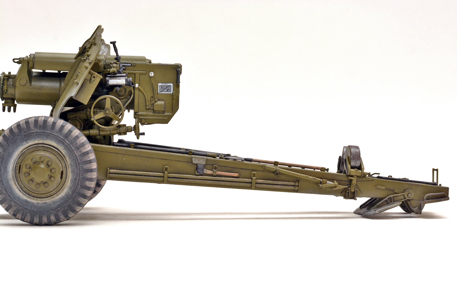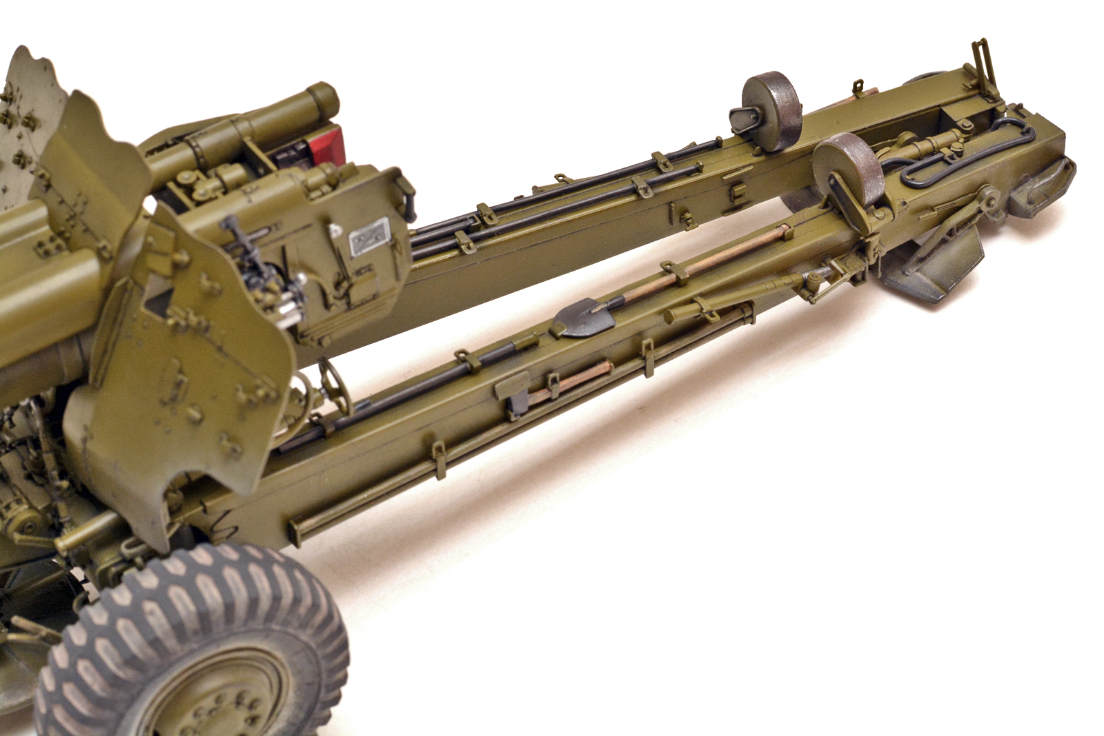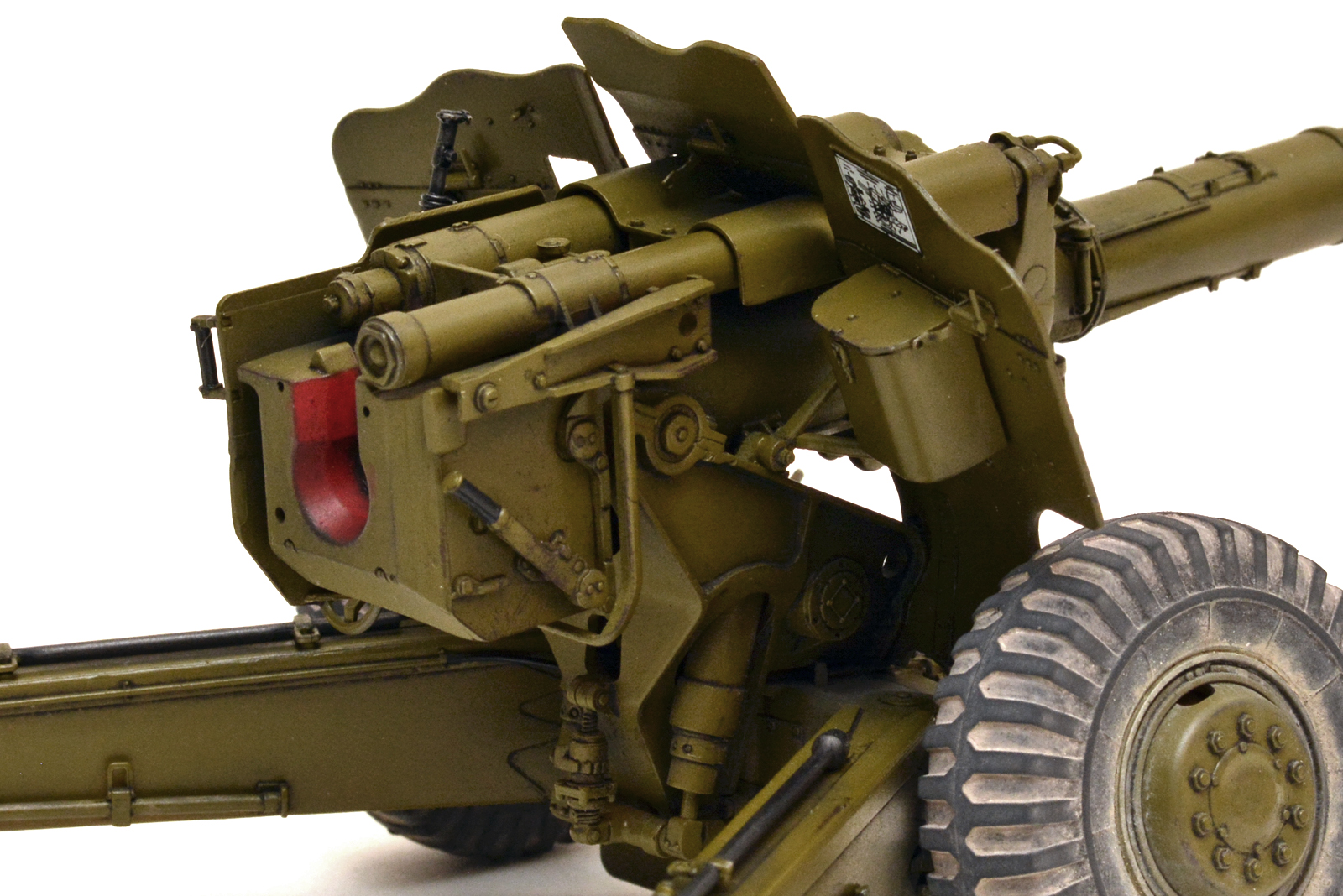 Представляю Вашему вниманию модель советской 122-мм корпусной пушки Д-74. Хоть послевоенная тема и не моя, но пройти мимо здесь я не смог. Есть что-то притягательное в этом орудии и заполучить его в коллекцию я хотел давно. Сборка велась из набора от Trumpeter №02334. Качество его мне очень понравилось. Литье четкое, без дефектов, с отличной деталировкой. Стыкуемость деталей замечательная. Также порадовала и достаточно высокая копийность данного набора. Единственный минус - это, пожалуй, только невозможность нормального перевода опоры нижнего станка с домкратом в походное положение. В самом наборе это не предусмотрено. У меня также доработать этот момент так и не получилось. Как ни прикидывал, детали домкрата в верхнем положении упираются в элементы станка и тем самым не позволяют завести опору на замковый элемент на стволе орудия. В общем, в итоге оставил опору в покое. Пусть остается в боевом положении ))) Общего впечатления от набора данный момент не испортил. Он действительно очень хорош. Эмоции от его сборки остались только положительные.