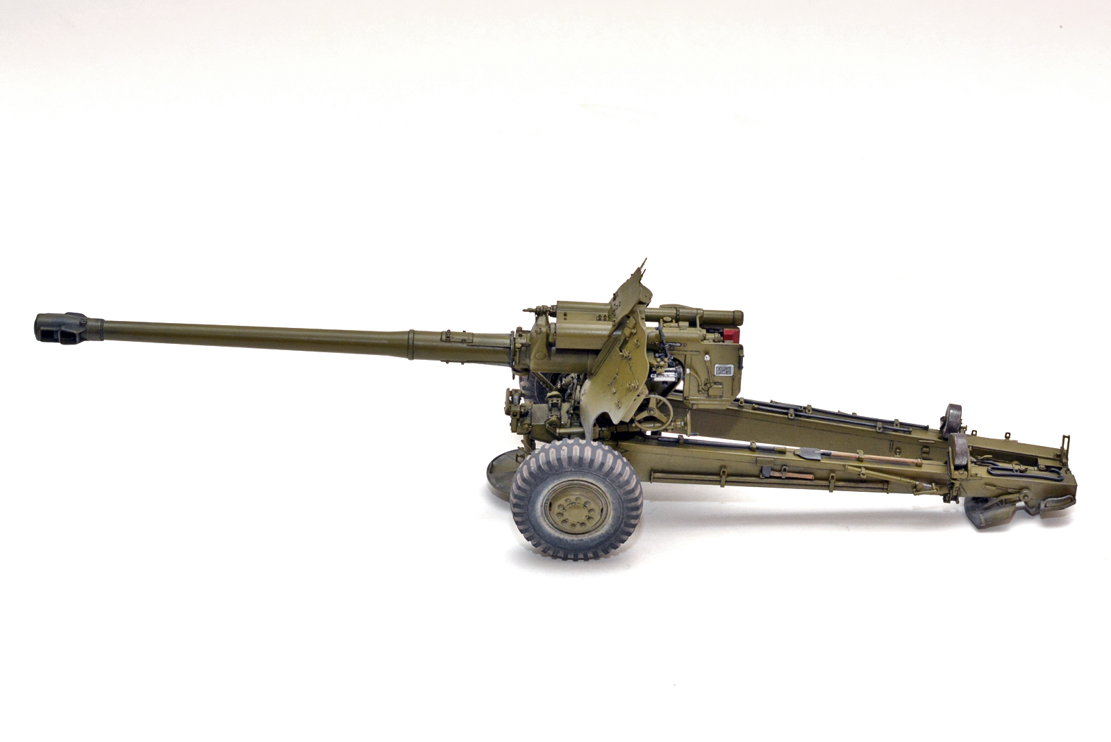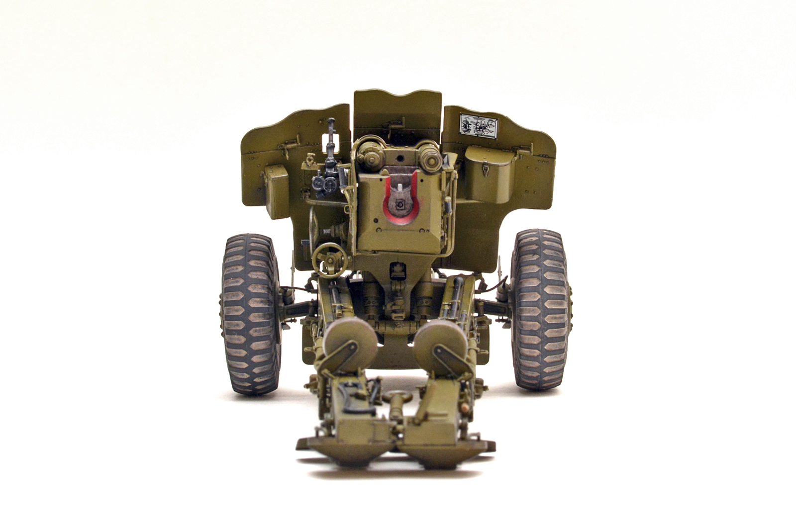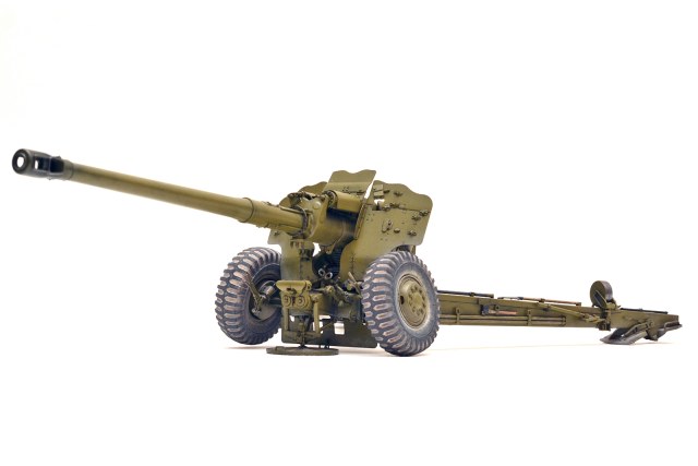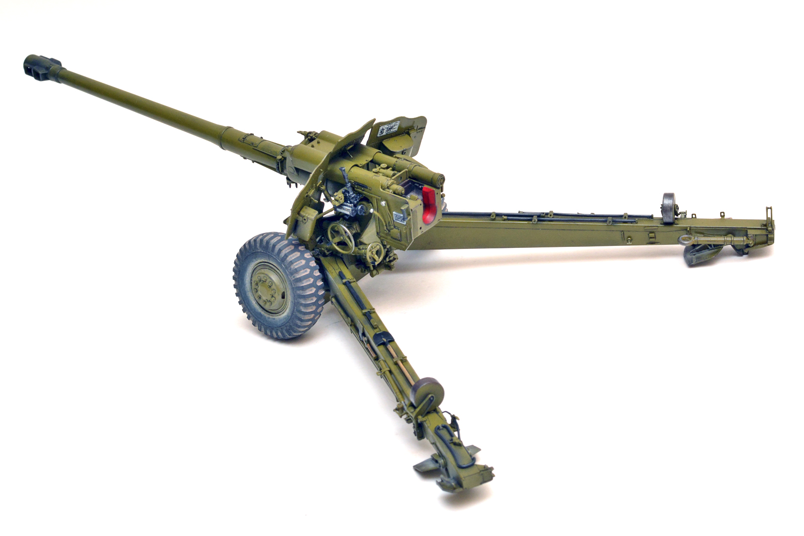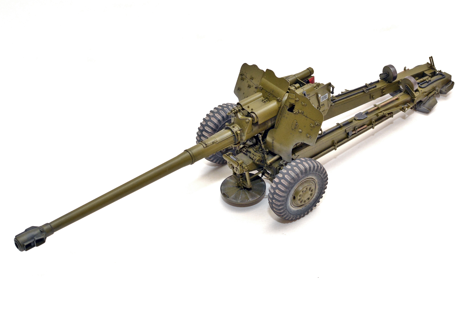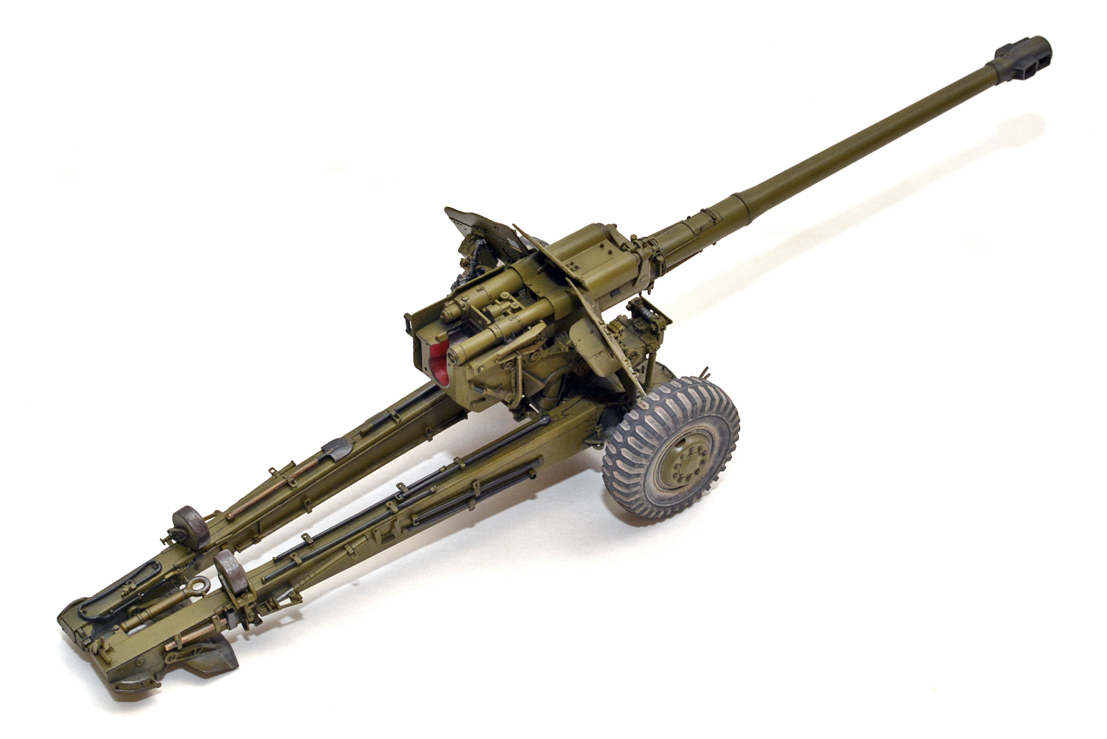 Представляю Вашему вниманию модель советской 122-мм корпусной пушки Д-74. Хоть послевоенная тема и не моя, но пройти мимо здесь я не смог. Есть что-то притягательное в этом орудии и заполучить его в коллекцию я хотел давно. Сборка велась из набора от Trumpeter №02334. Качество его мне очень понравилось. Литье четкое, без дефектов, с отличной деталировкой. Стыкуемость деталей замечательная. Также порадовала и достаточно высокая копийность данного набора. Единственный минус - это, пожалуй, только невозможность нормального перевода опоры нижнего станка с домкратом в походное положение. В самом наборе это не предусмотрено. У меня также доработать этот момент так и не получилось. Как ни прикидывал, детали домкрата в верхнем положении упираются в элементы станка и тем самым не позволяют завести опору на замковый элемент на стволе орудия. В общем, в итоге оставил опору в покое. Пусть остается в боевом положении ))) Общего впечатления от набора данный момент не испортил. Он действительно очень хорош. Эмоции от его сборки остались только положительные.