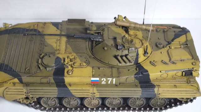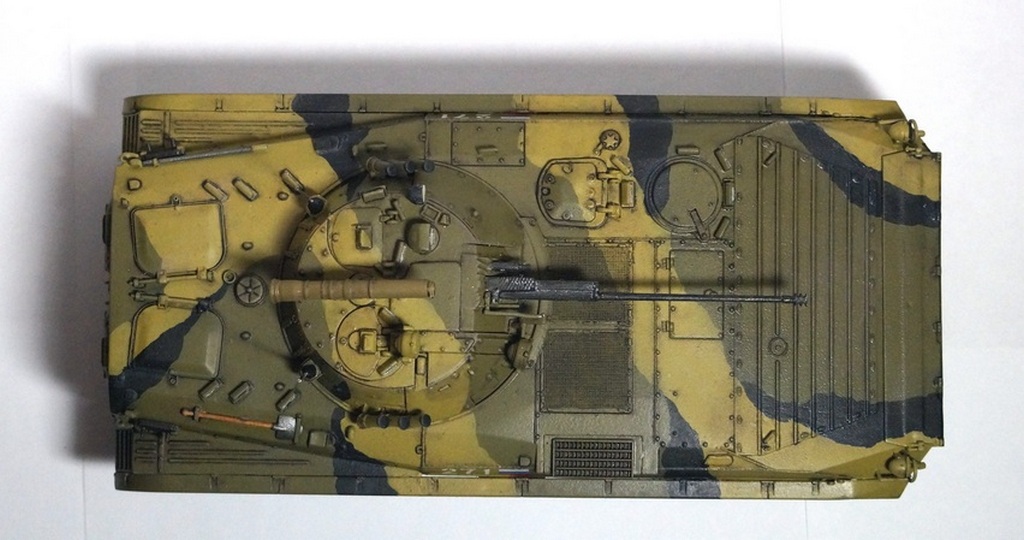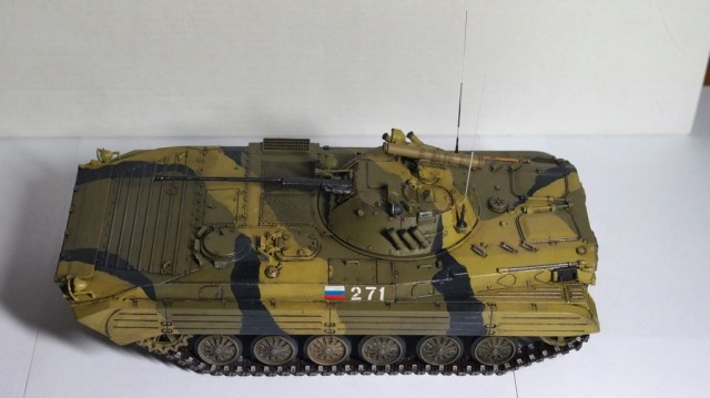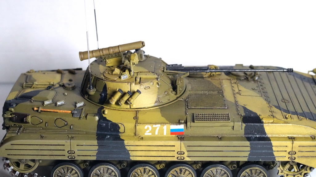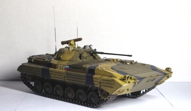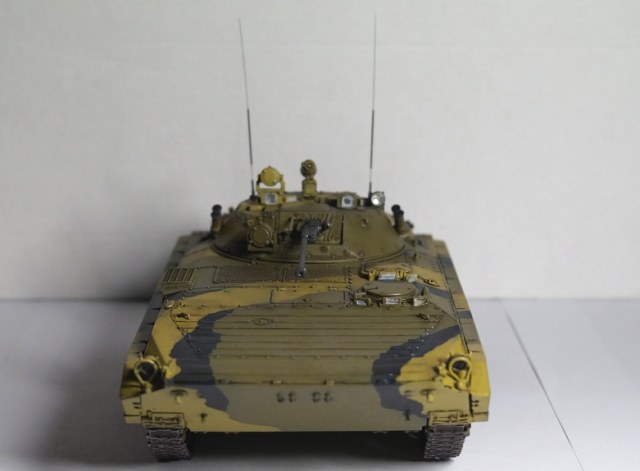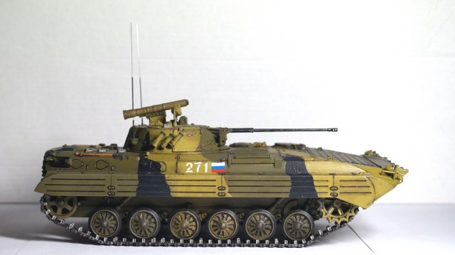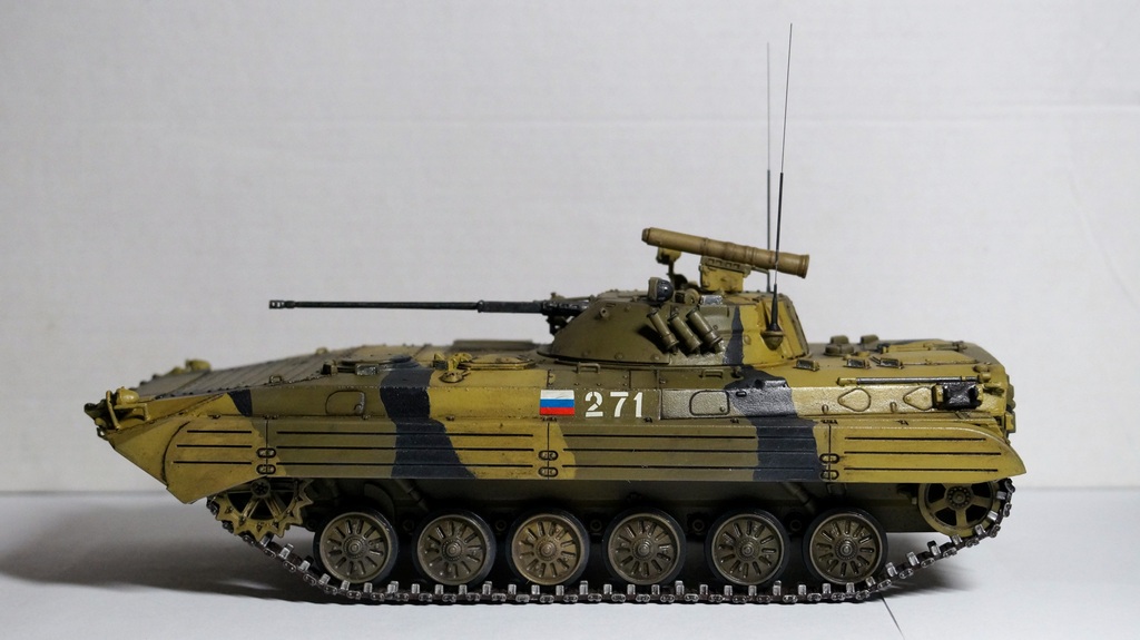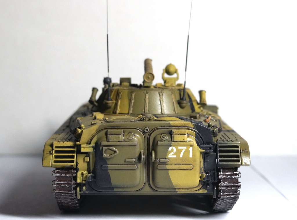 Собрал БМП-2 в трехцветном камуфляже. Это была тестовая сборка, потому модель собрал практически целиком из коробки, не заморачиваясь на матчасти. Не из коробки металлические ствол и установка ПТУР от "Зедваля" или "Микродизайна" (не помню), башенная фара от "Эльфа" и антенные вводы с двумя антеннами от "Зедваля". Также распилил приборы наблюдения в башне и вставил в них, а также приборы наблюдения корпуса прозрачный пластик. При нанесении камуфляжа использовал эмаль от "Mr. Hobby" 4БО, от "Акана" желто-зеленую, и от "AK-Interaktive" черную. Наносил смывку и пылил модель пигментом "Европейская земля" от "AK-Interaktive".