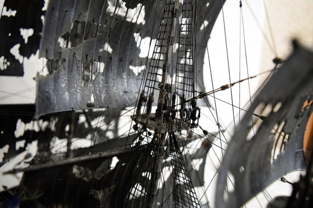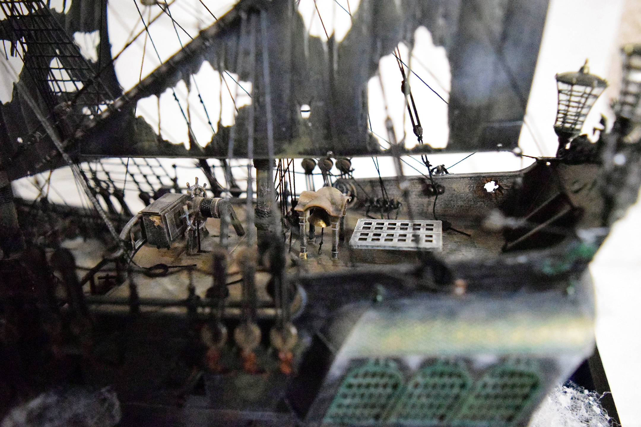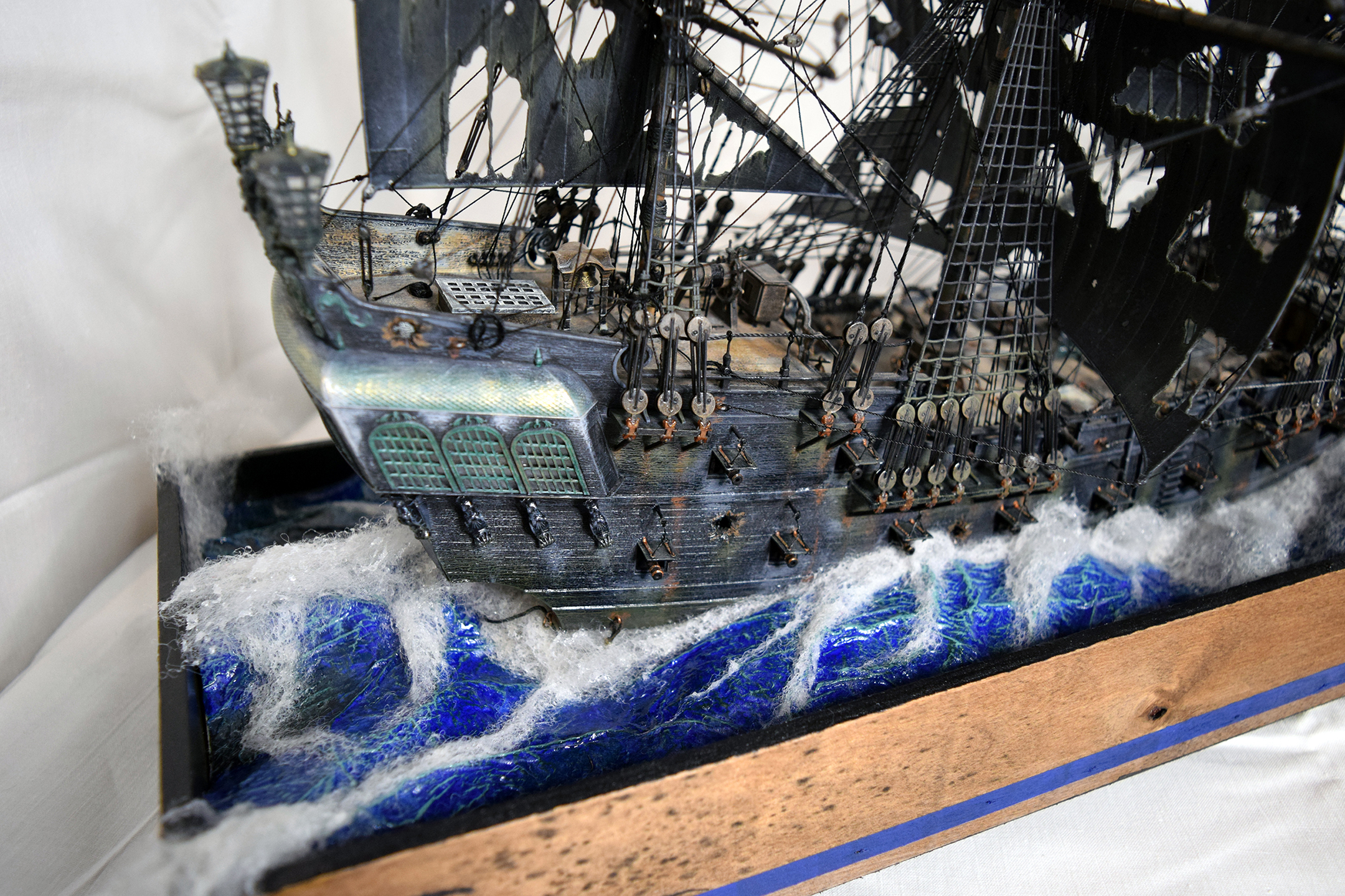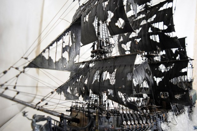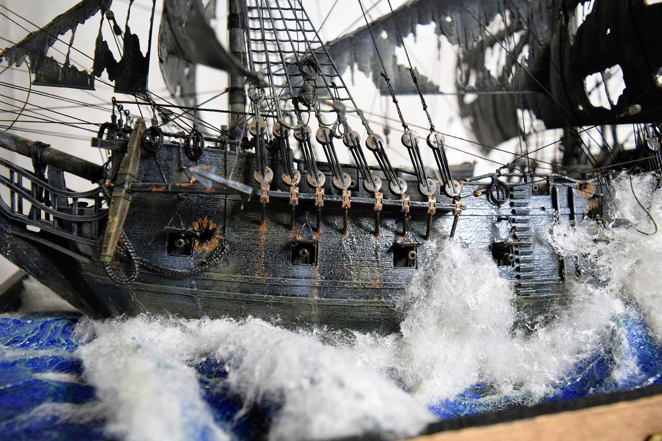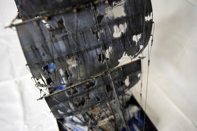 Интересно выполнено! Но, внимание вопрос: как при таких фатальных повреждениях парусов не наблюдается ни одного повреждения такелажа, снастей, обшивки, палубы и т.д.? С разрывами перебор и паруса почему-то наполнены, хоть и изорваны в клочья...