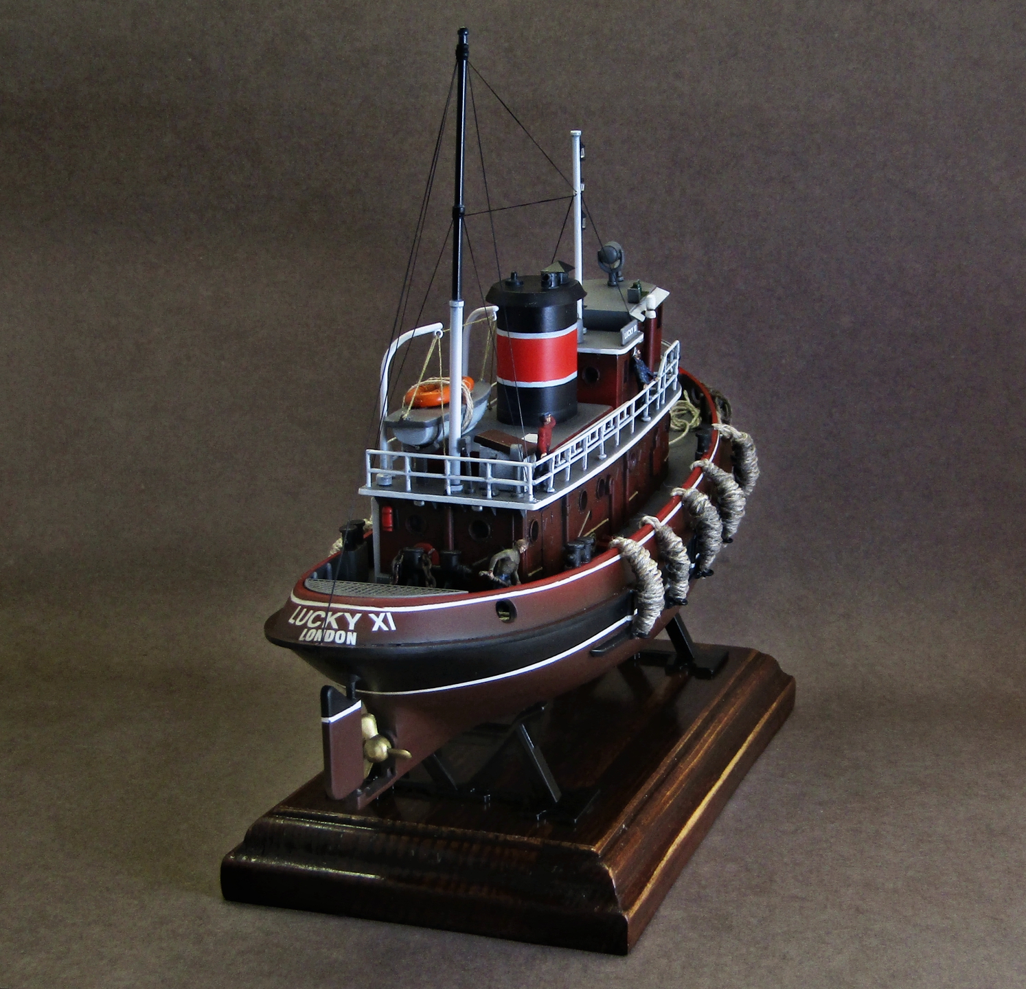понравился внешний вид самого образа. Окраска вытянула работу. Сам буксир собран грубовато /мнение не навязываю/, но решение цветом меня зацепило, взял на заметку. Кранцы портят все! Хотя Володя и много разъяснил /чего честно не знал, отдельное спасибо за информацию/, но само исполнение очень неряшливо. Вспомнилось, что мальчишкой сплетали столбики из телефонного кабеля вместо брелока на ключи, так вот берем проволоку диаметром 1.5 мм изгибаем и тонкой шелковой нитью /не витой/ оплетаем заготовку. считаю, что так получится намного аккуратней и реалистичней. Набор знаком и действительно это скорее неплохая заготовка для воссоздания образа. Но работа зацепила, вот только ватерлинию на перо руля наносить бы не стал.......
