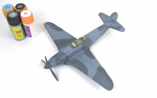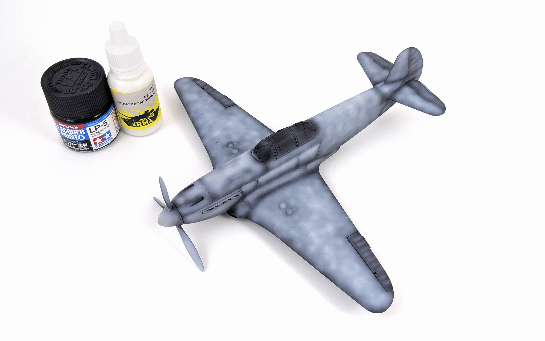 Окраска производилась следующим образом: сначала надул черно-белую подложку, используя тамиевский черный LP-5 и белый от Arma Colors. На этом этапе тамия легла местами с шагренью, думаю это просто из-за отсутствия опыта обращения с такой краской (уже потом эта шагрень помешает нормально лечь некоторым мелким декалям).