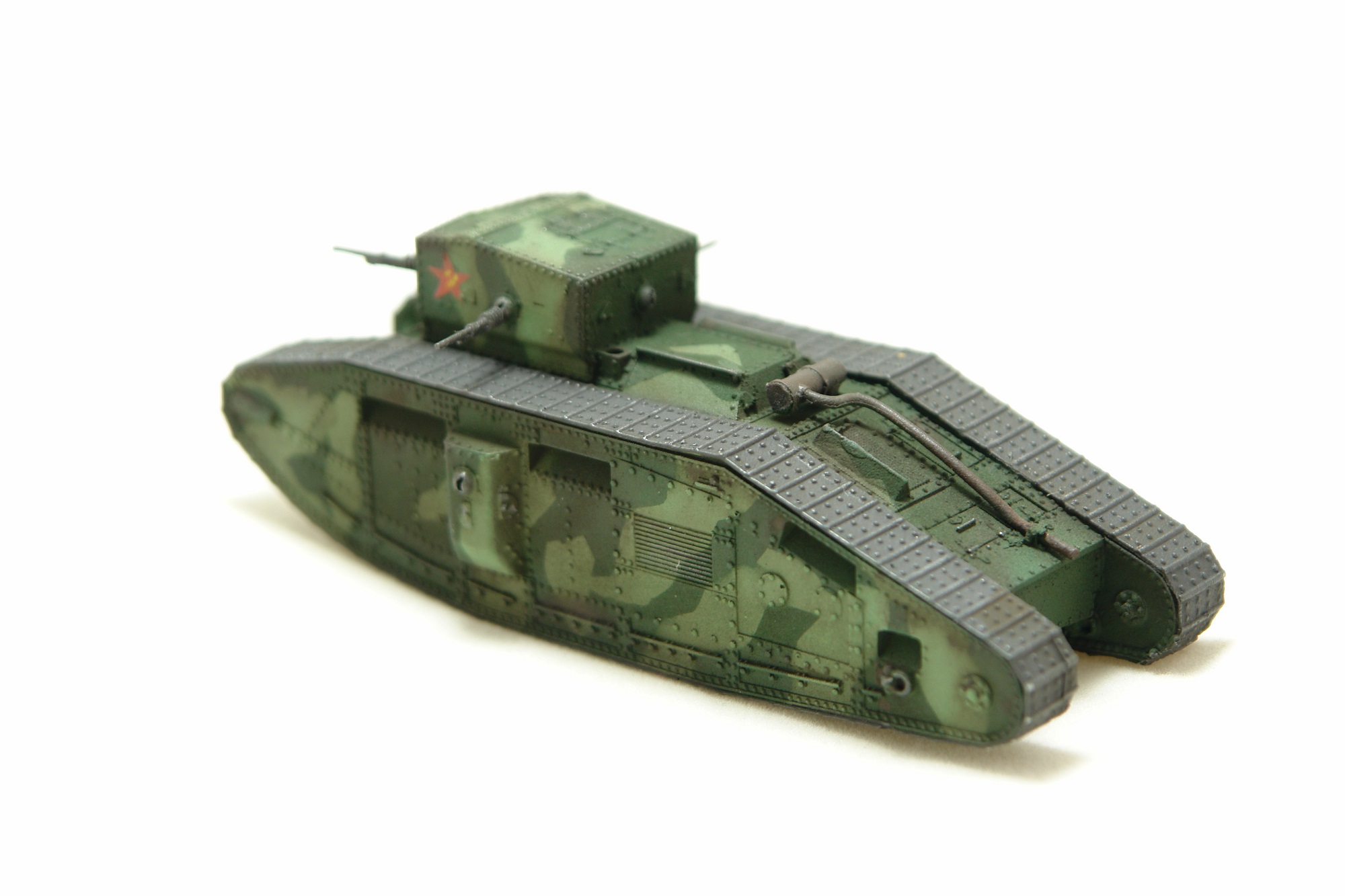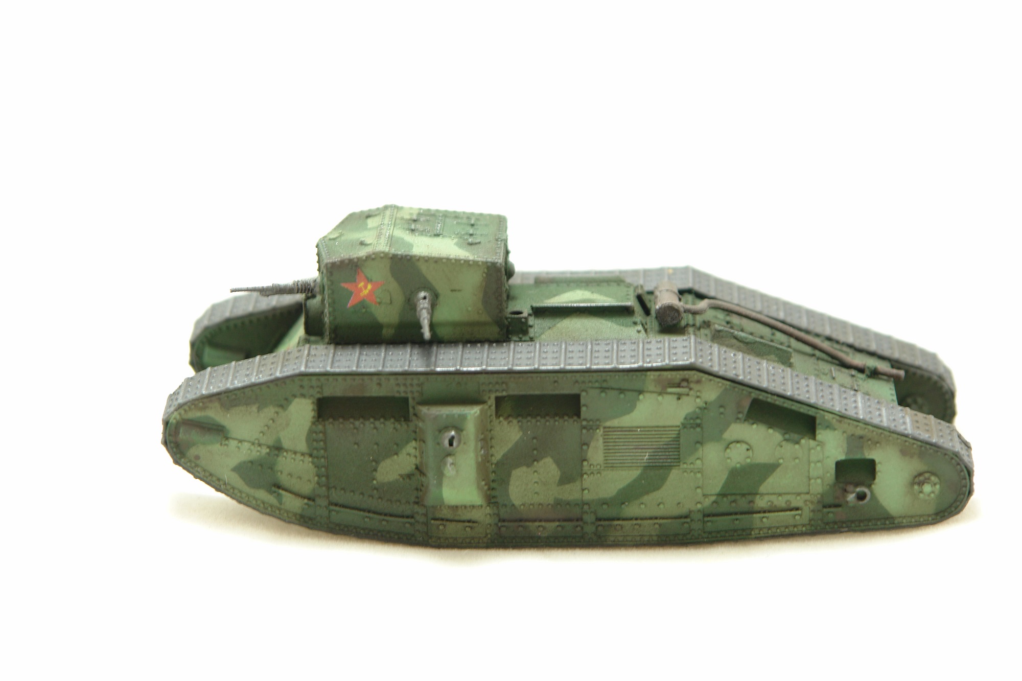 Очередная модель из недавно приобретенных от смоляного производителя Ден Белс. Прототип построен в Англии в 1918 году, был доставлен на Русский север, воевал на стороне Белых, потом Красных. Ремонт на заводе в Филях в 1920 году, потом западный фронт и закончил свою боевую деятельность мишенью на полигоне для Красных артиллеристов. Двигатель 4 цилиндра, 100 сил укороченный от ромба Рикардо МК V. Был довольно тесным как и остальные средние танки того времени. В одной Английской книге о технике ПМВ приводится легенда, что механик при проведении регулировочных работ застрял в двигательном отсеке и что бы его освободить пришлось танком с кран балкой снимать двигатель Представить такое в МК 1-5 себе просто невозможно. А в МК В вполне. Назывался Уиппет, как и средний МК А. Вооружение пулеметы Гочкис. Построено 45 экземпляров.