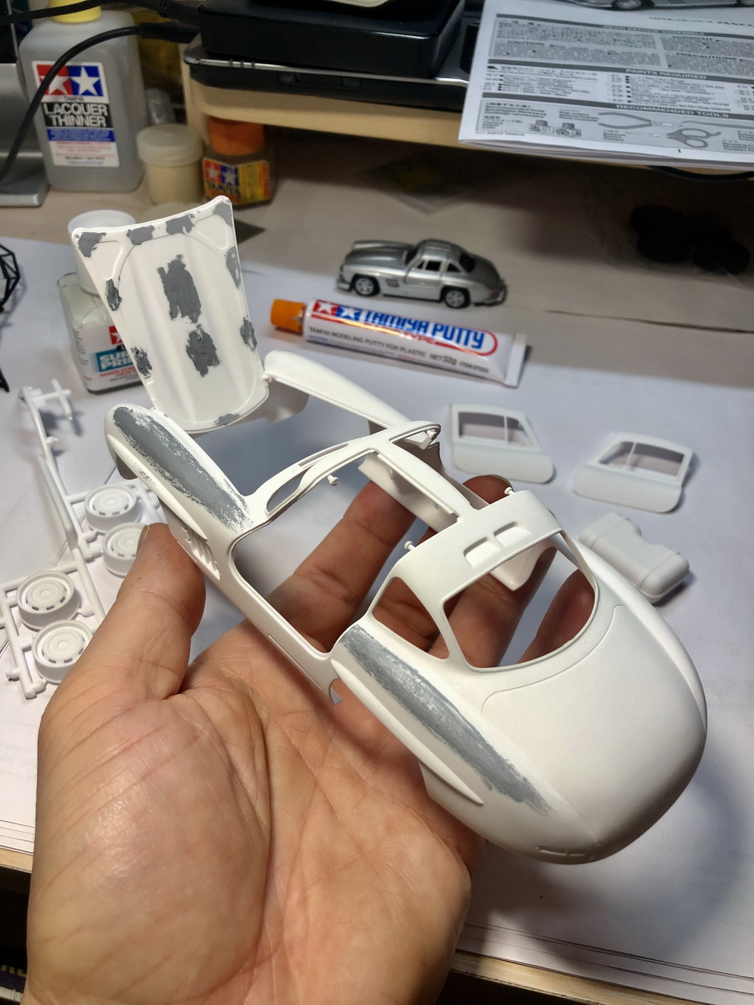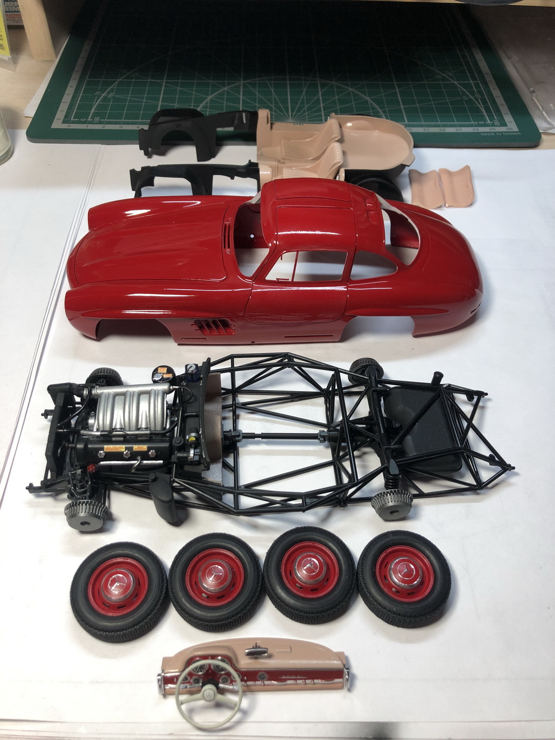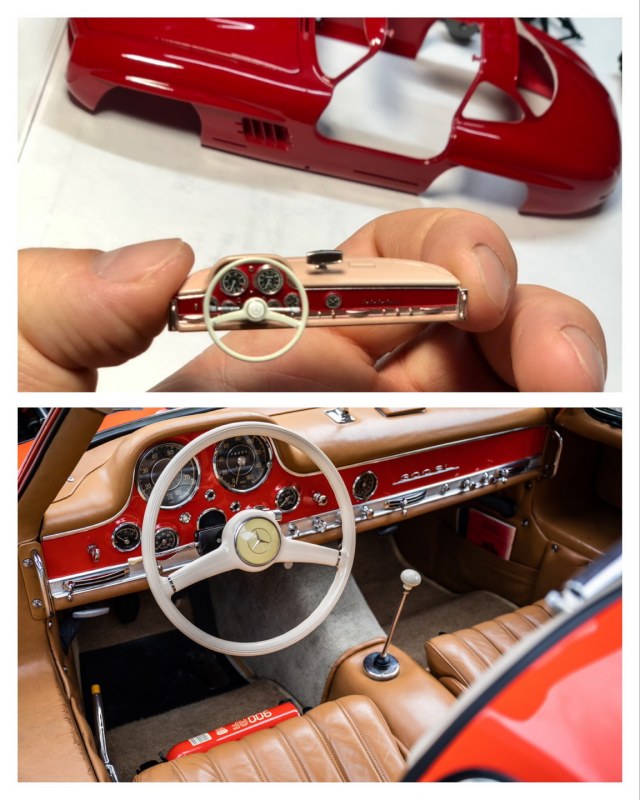 Что касается покраски интерьера 300SL - красил акрилами от Tamiya. Щиток приборной панели красился аэрографом с помощью сложных масок, сделанных из малярного скотча. Хром поверхности (некомплектные) красил в основном маркером chromium metal (покупал на Али).