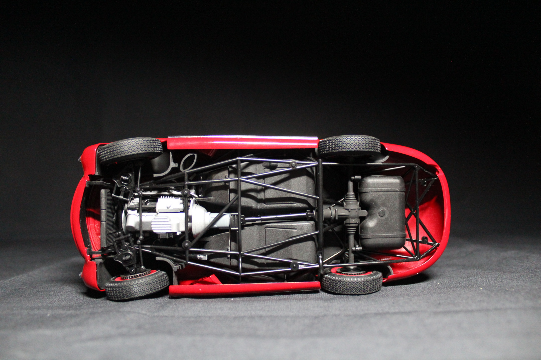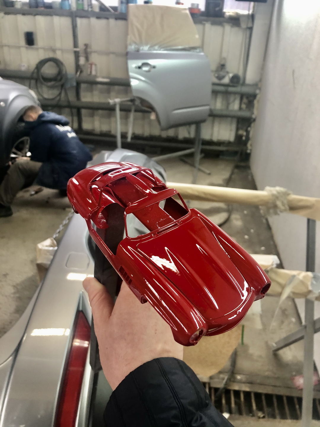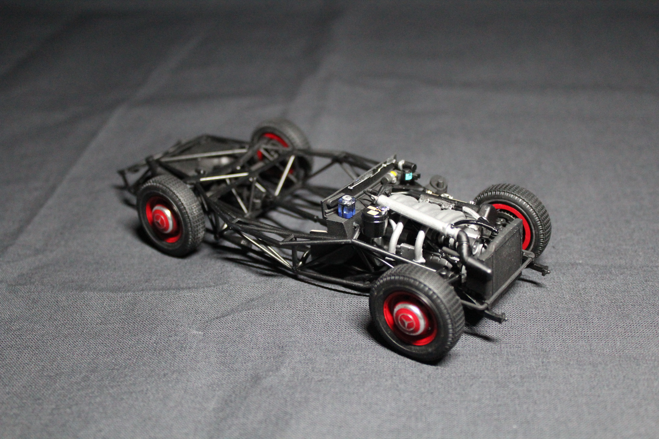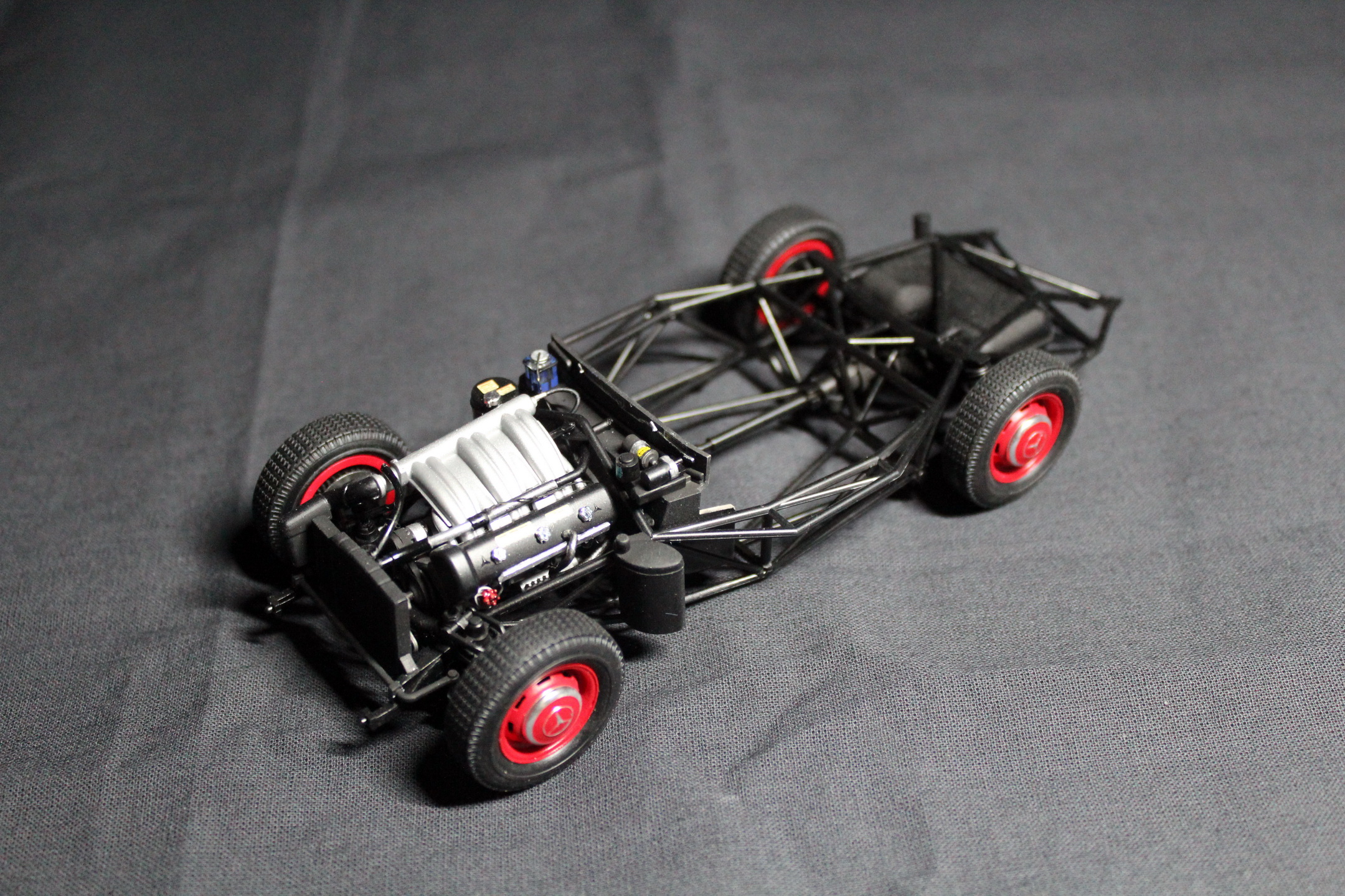 Покраска кузова. Выбор пал на оригинальный красный цвет. Скажу без преувеличения - это железобетонные нервы, ввиду того, что она должна быть БЕЗУПРЕЧНОЙ. Грунт наносил от Tamiya. Красил из краскопульта профессиональной оригинальной автоэмалью по коду Mercedes у друзей в специализированном автосервисе по кузовным работам, лак также наносился автомобильный (производство США). Качественно покрасить удалось со 2го раза. Колпаки красил вручную, ввиду того, что декаль от тамии крайне корявая...