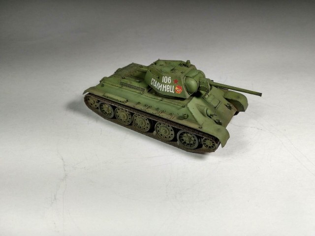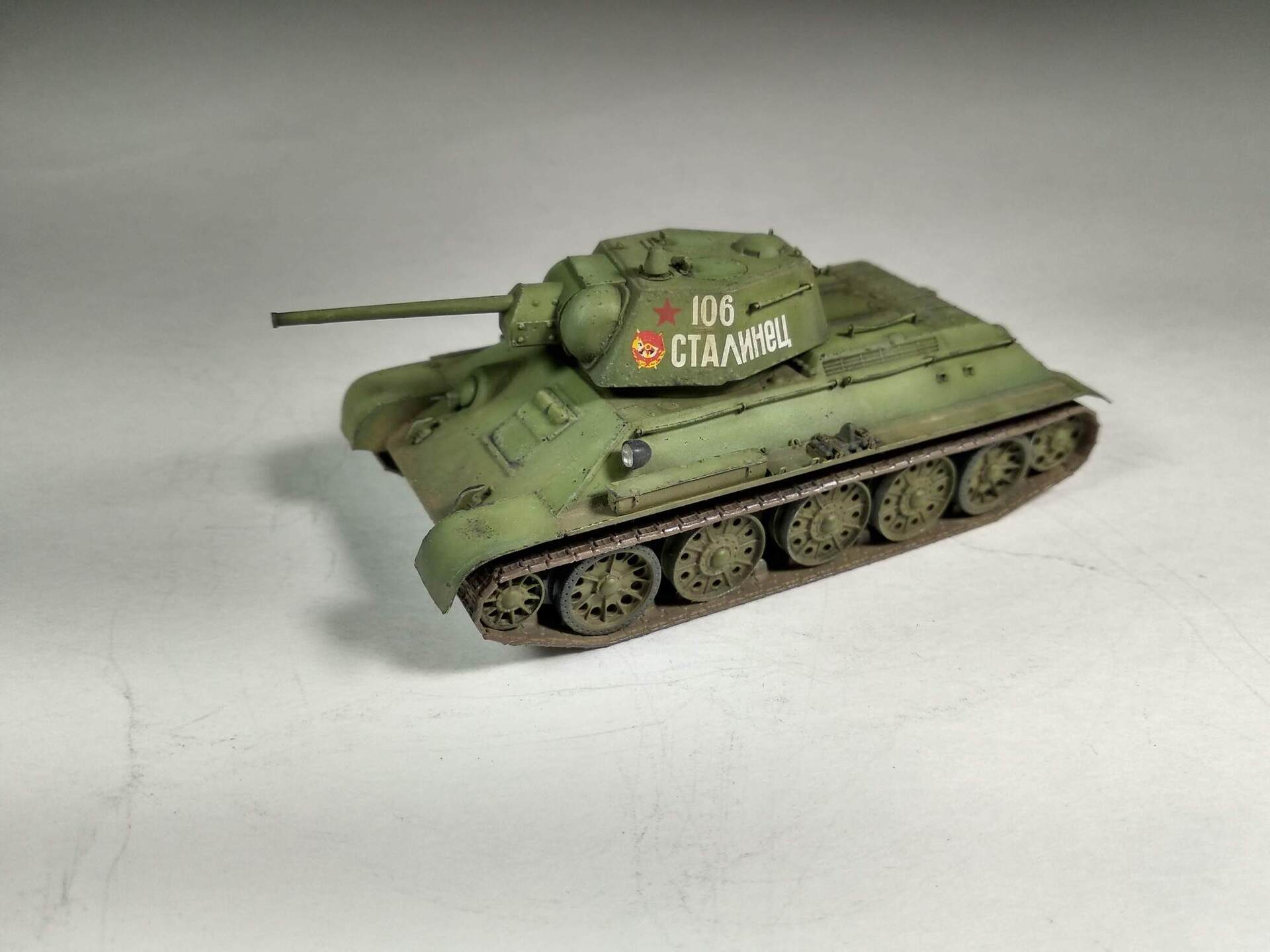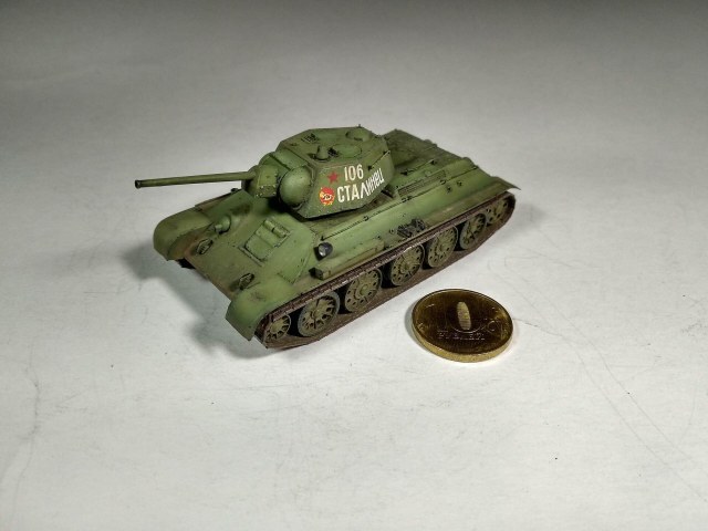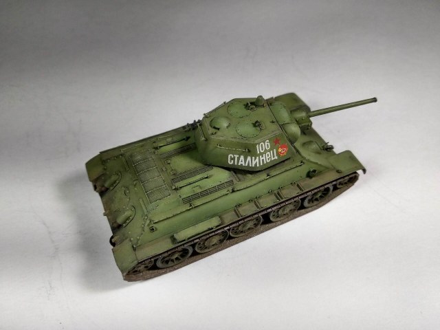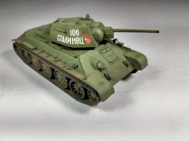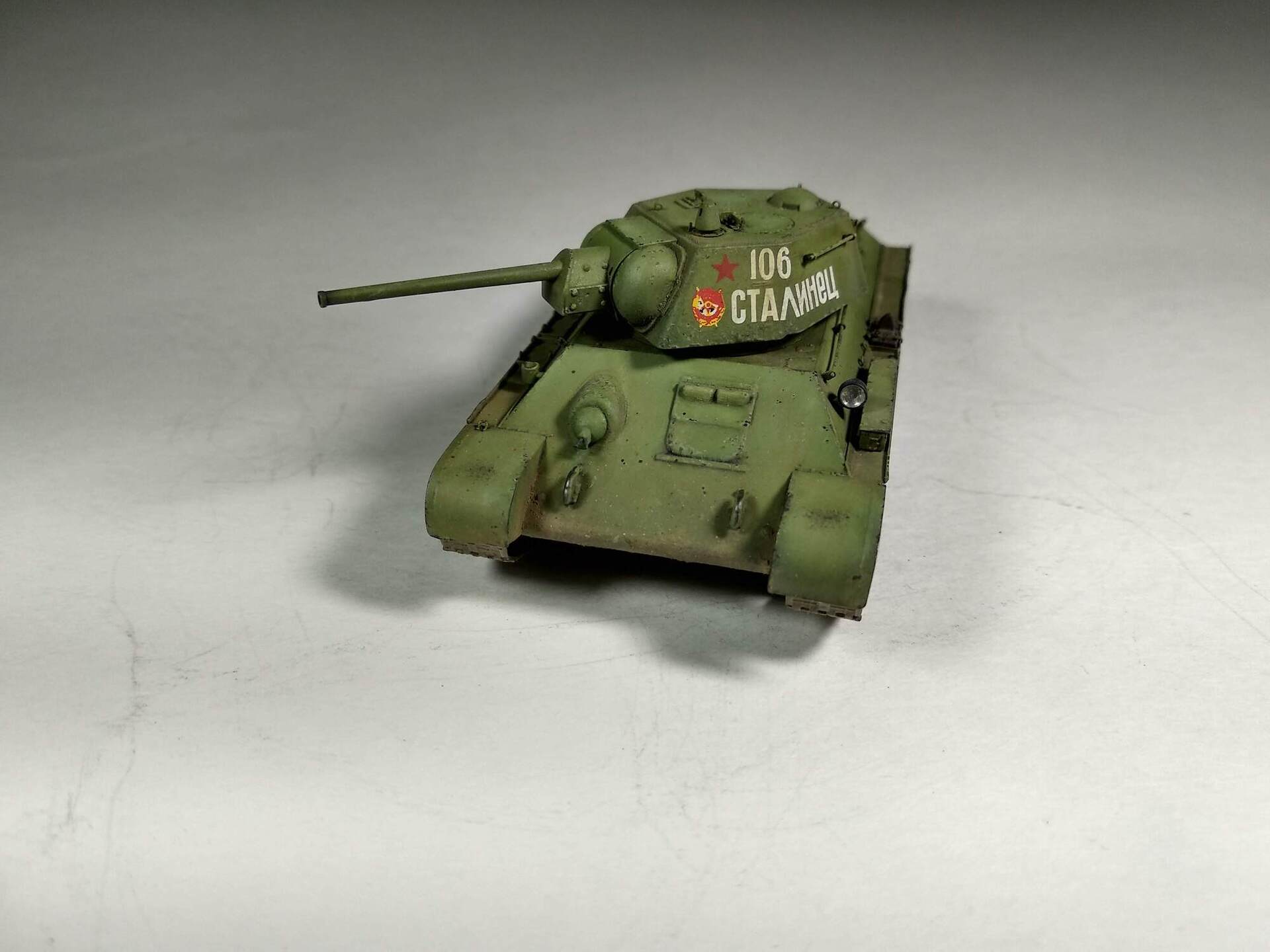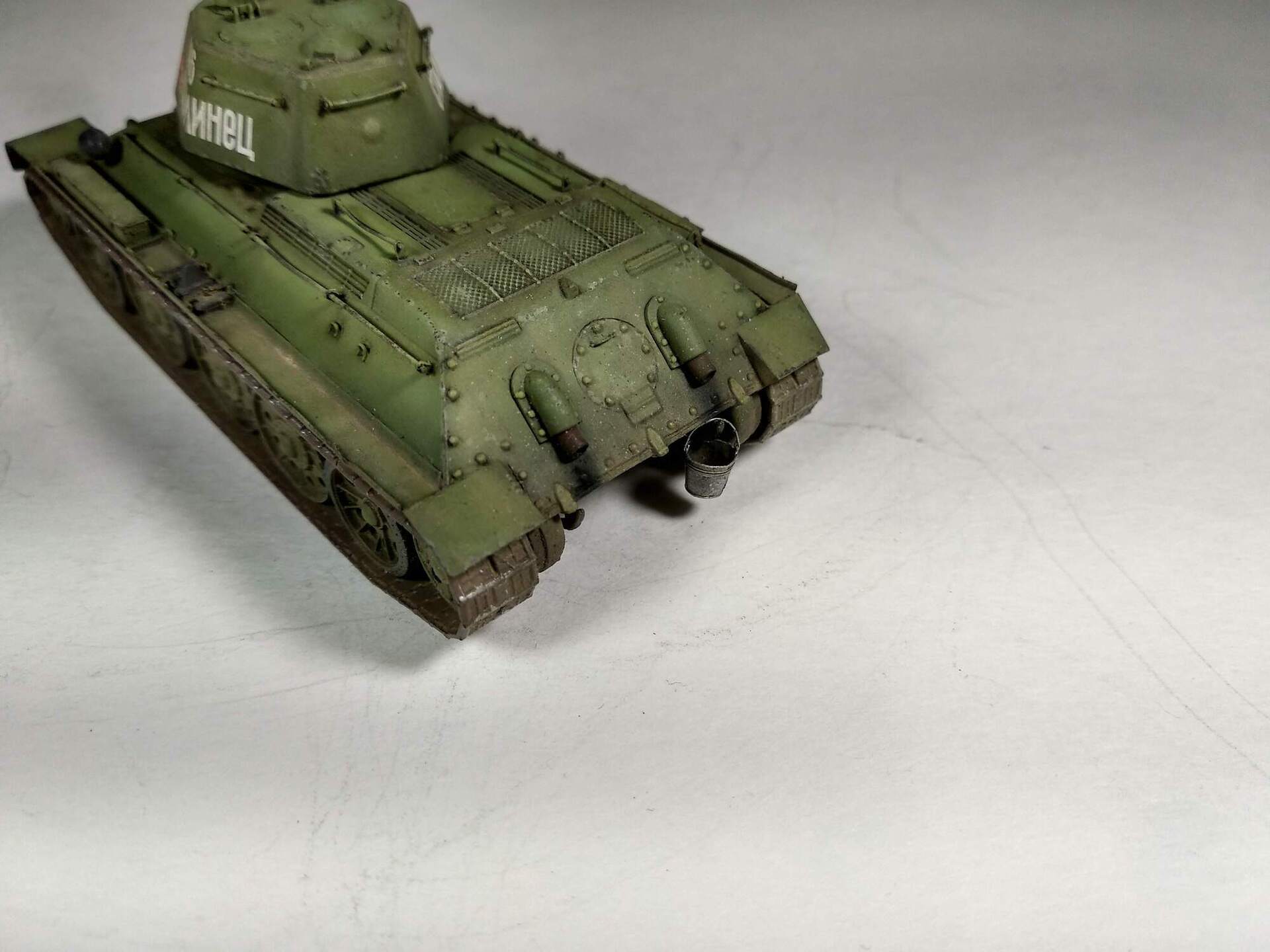 Т-34-76 с набором травления от SG Modelling и небольшими доработками: изготовил скобы и поручни из проволоки, заменил курсовой пулемёт на тонкую латунную трубку, а также поставил фару ELF.