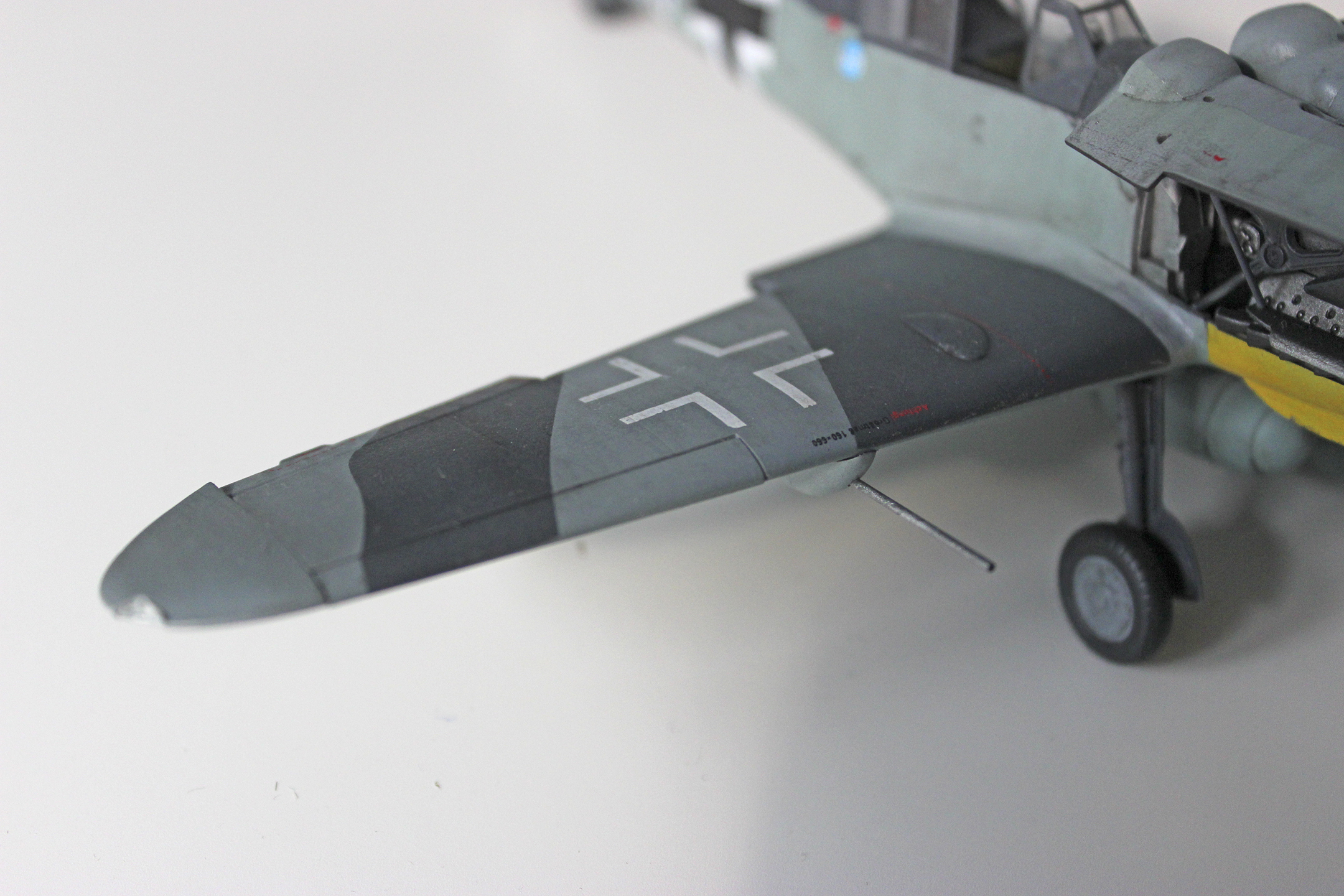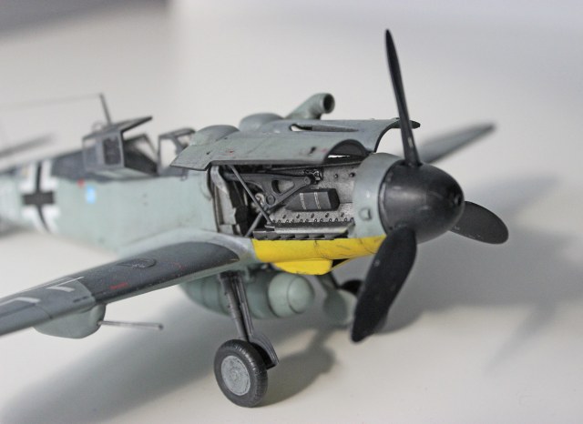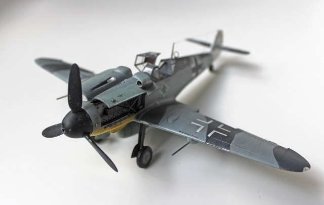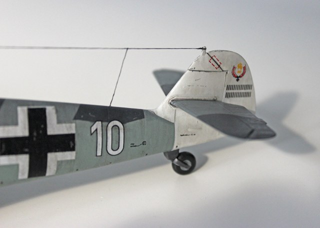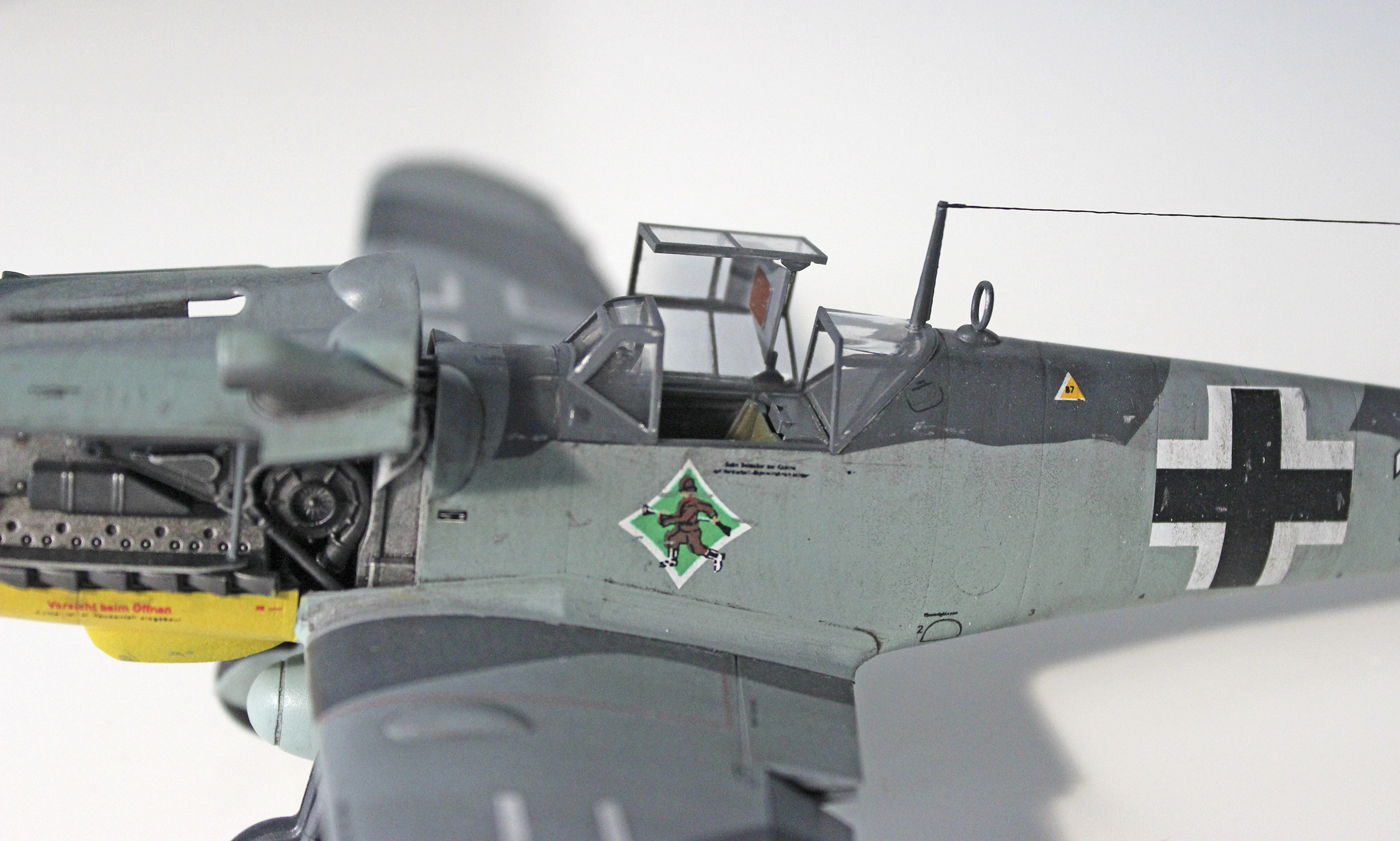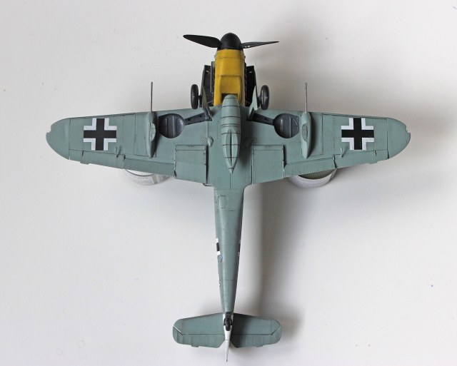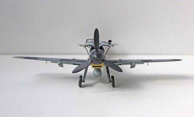 Аккуратно выполнена модель, но моотлинга (пятен) на Фюзеляже не хватает, хотя для новичка это сложный процесс, требующий опыта. Лопасти винта и кок, как правило, в RLM70 (черно-зеленый), причём, лучше выполнять на них не сколы, а потертости (сухой кистью наносить). С уважением - Сергей