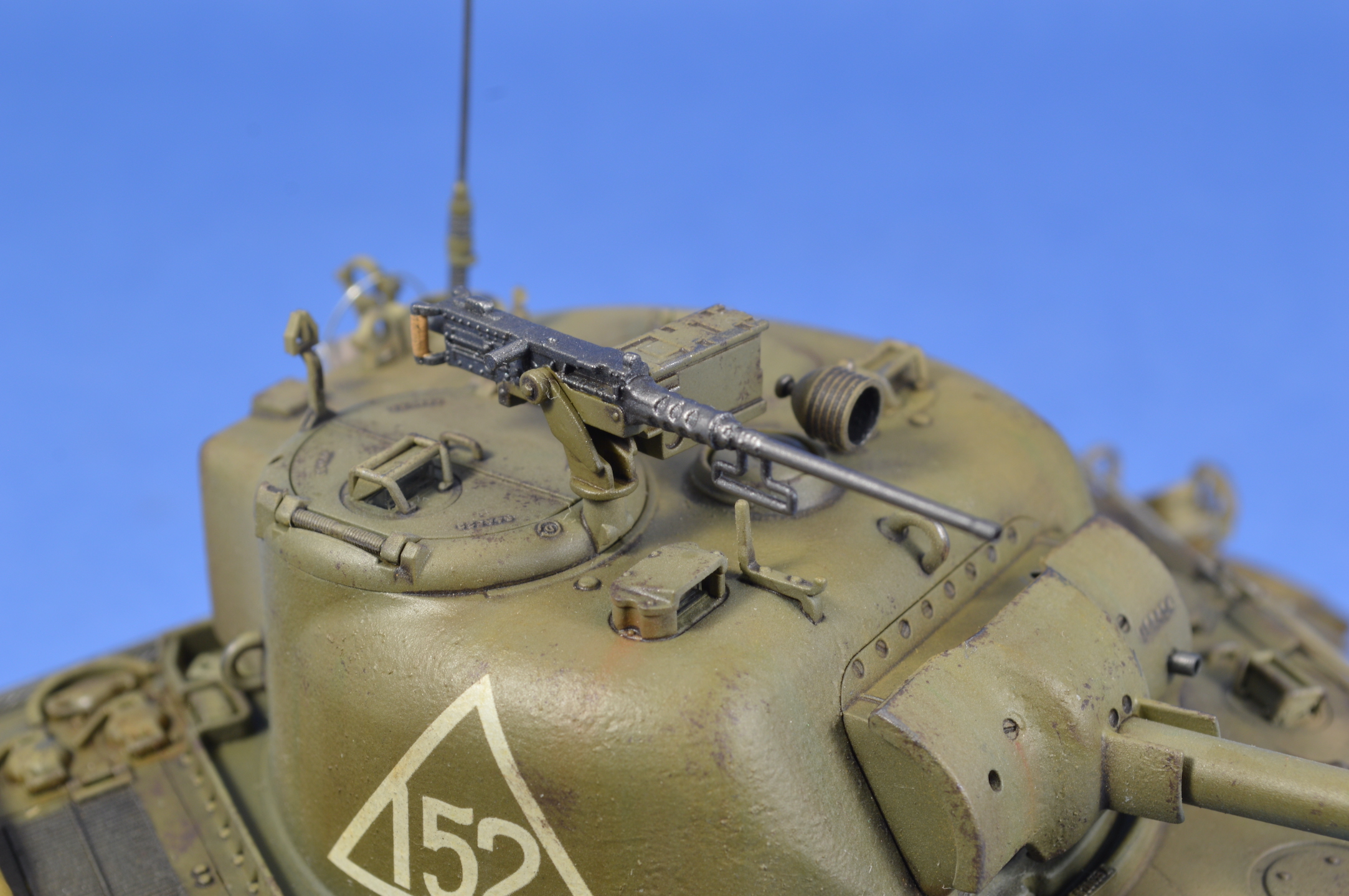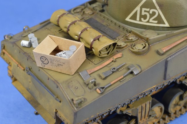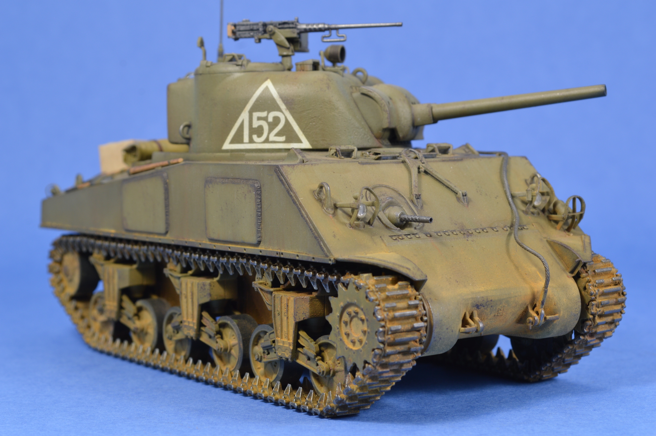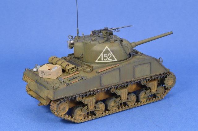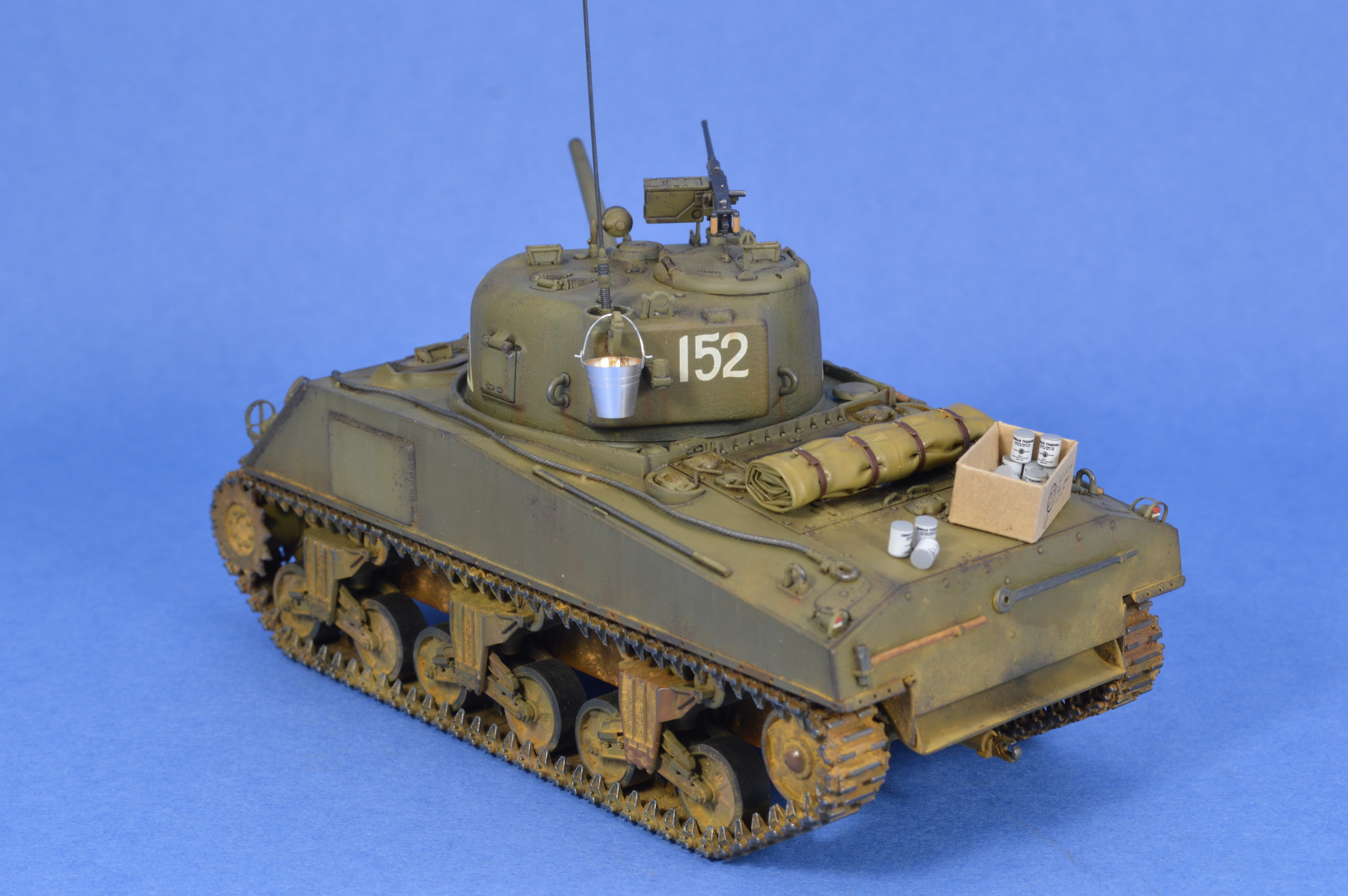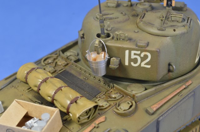 Роман, хороший Шерман вышел! Окрас, везеринг хорошие, но кажется легкий перебор с желтым пигментом?. Трос смотрится супернатурально. Понравился окрас деревянных частей шанца. Худчасть мне очень понравилась. Но! Позволю себе все-таки кое какие соображения по матчасти, если вы не против. Будете детать другой Шерман - используйте травленые детали. Микродизайновские очень хорошо подойдут под любой Шерман. Делайте дренажные отверстия на корпусе за башней и сквозь ограждения заливочных горловин, а на башне - через защиту вентилятора и через стакан антенны. "Обваривайте" клеем или шпаклевкой все буксировочные петли и петли для подъема башни и корпуса танка. Не верно окрашены задние фары, особенно задняя правая. Шанцевый инструмент крепился ремнями, легко сделать из фольги или все тот же Микродизайн. Барахло все-таки редко закрывало створки на надмоторной плите. В передних торцах тележек надо просверлить по 4 отверстия. Впечатление, что скатка или тушонка сейчас слетят с танка. Ведро новое, но что-то уже побывало, судя по внутренней окраске, в этом ведре? Еще раз повторюсь, для изкоробочного - это, наверное, один из лучших Шерманов Звезды на этом ресурсе. Можете глянуть хоть это https://karopka.ru/community/user/16385/?MODEL=583172