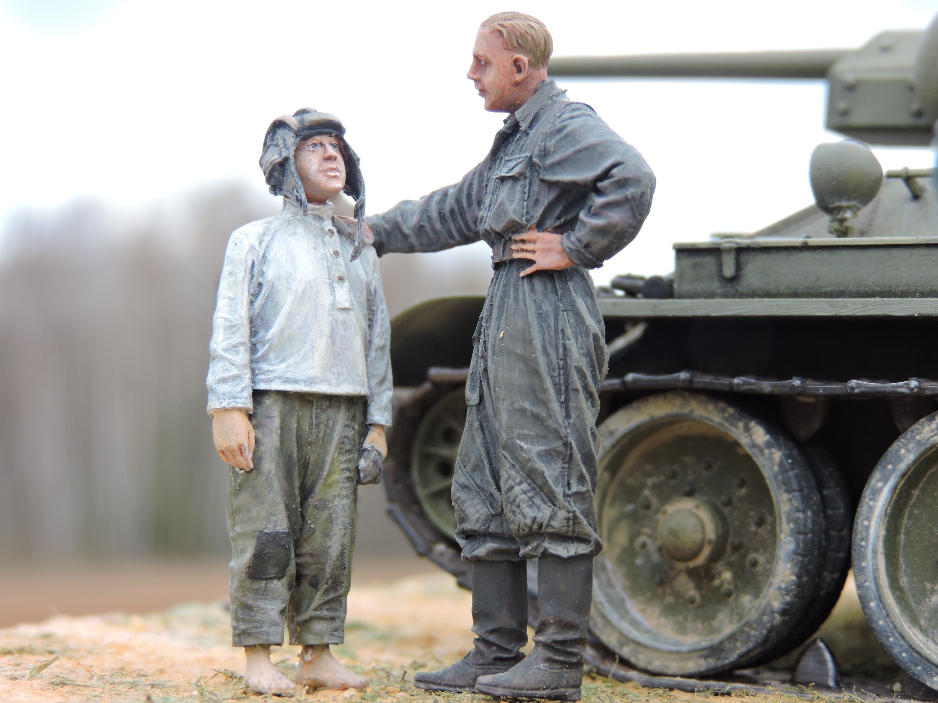 в русском языке нет слова "шедеврично", если это не гибрид-новояз, что тоже безграмотно. А в чем шедевр? Композиционно - провал (женщина никак не связна с общей композицией, она по идее должна указывать куда-то, отвечая на вопрос танкистов, но - нет). Сюжетно - ни о чем. Экипаж тоже выбивается из композиции: командир танка сам по себе тусуется, танкист с мальчиком - о чем это? Просто беседа? Мальчик даже не смотрит на танкиста, смотрит вверх куда-то), сам танк у плетня впритык. Потенциал сделать лаконично и хорошо превратился в обычный принцип "мне нравятся фигурки этого производителя,впихну все купленные в одну диораму".