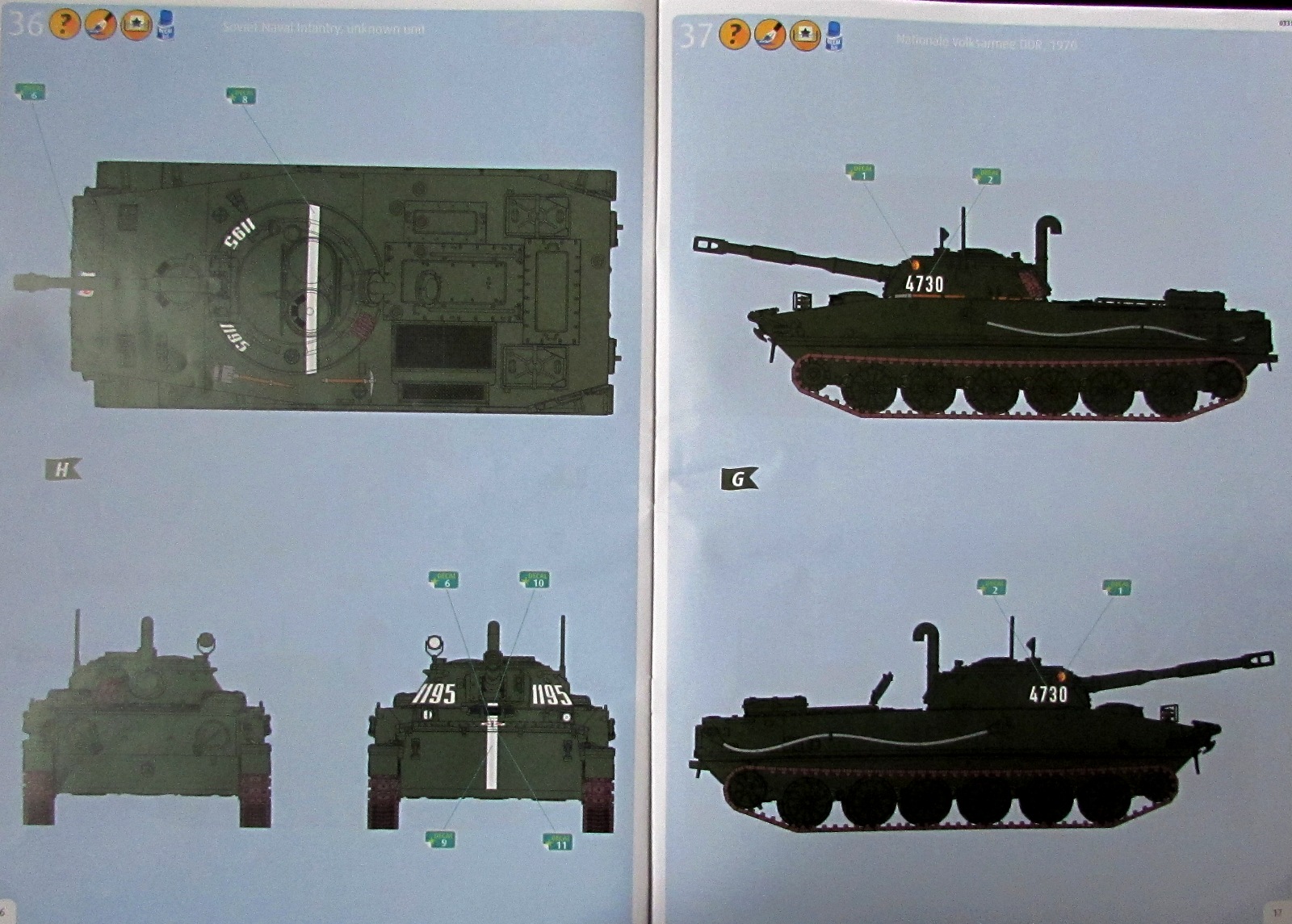 Декаль простая, на три варианта, морская пехота СССР, на операцию "Дунай", и на армию ГДР. Что странно - ни Вьетнама, ни Египта/Израиля, где эти машины оставили самый значимый след, просто нет.