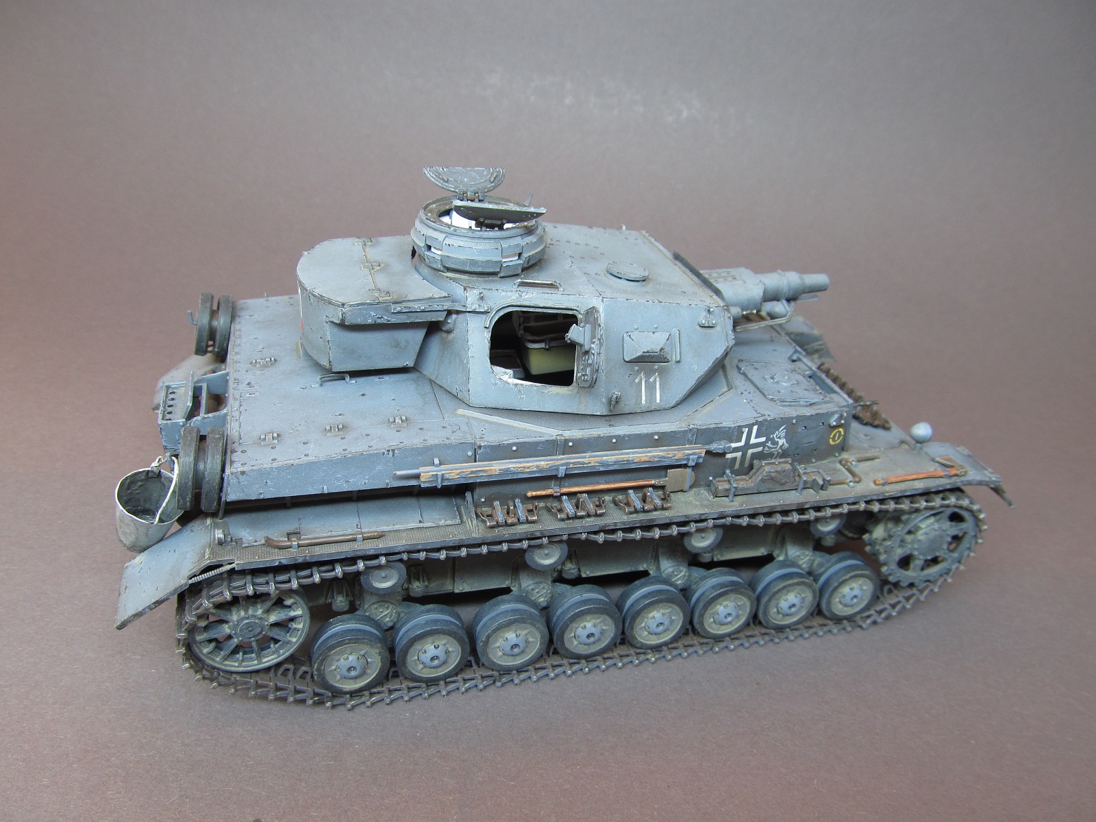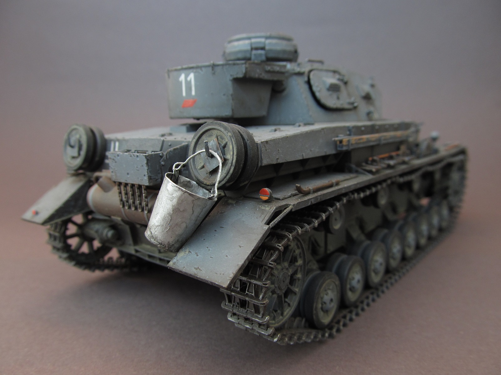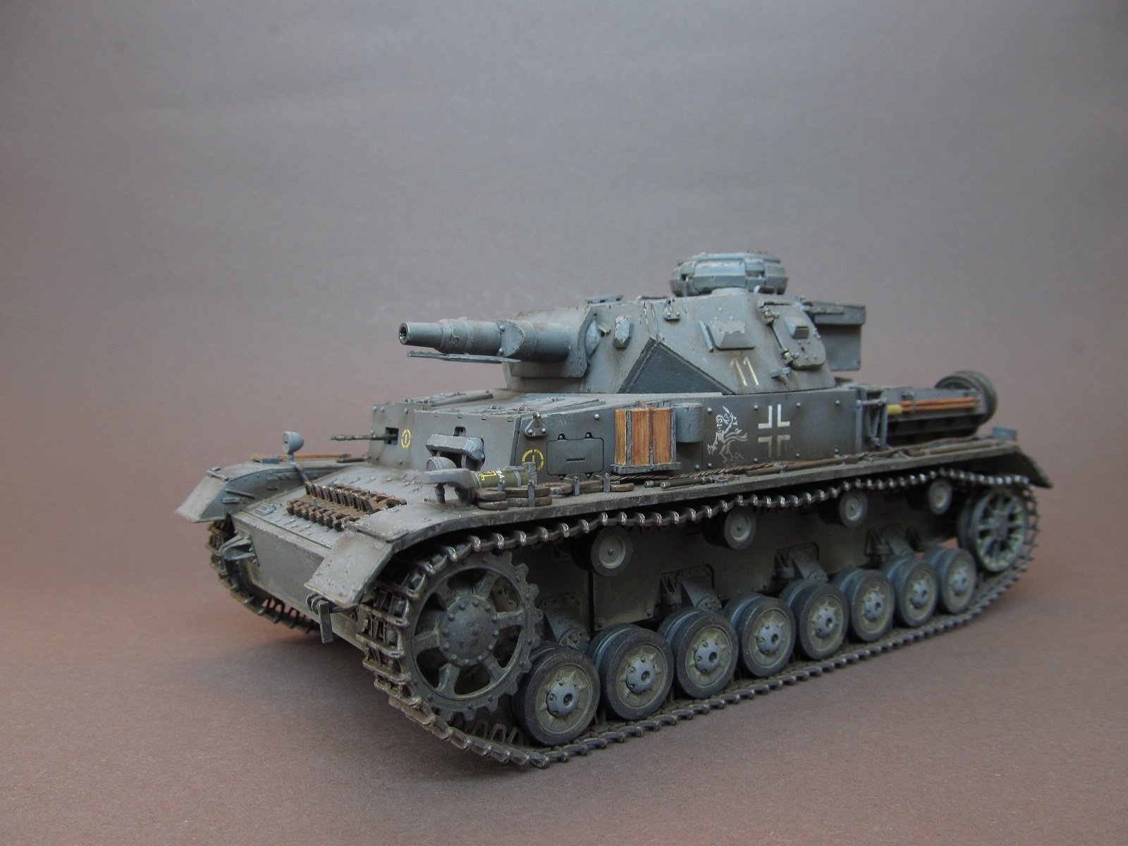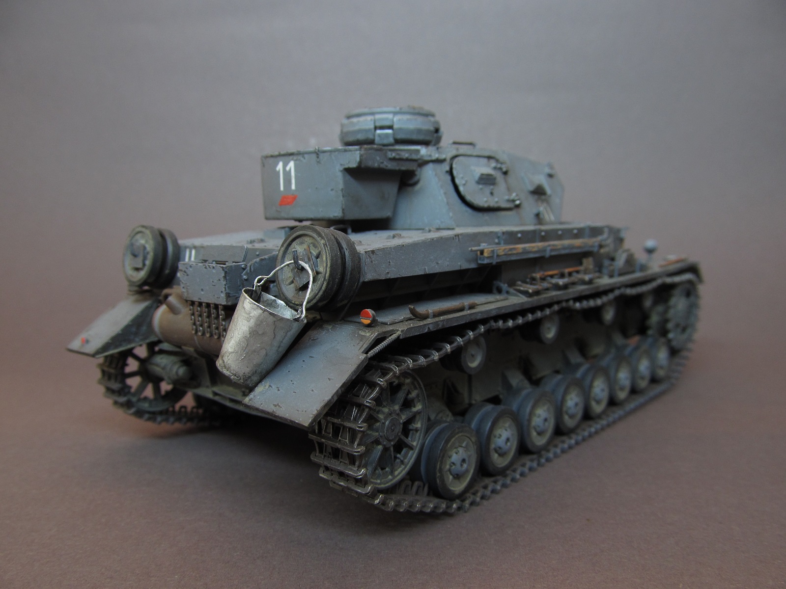 Окрашивал модель акриловыми красками от Rewel и Звезды. Т. к. решено было изобразить реально существовавшую машину из состава 11 ТД, в соответствии прототипу нарисовал тактические знаки, номера и эмблемы кистью. Машину изобразил бывалую, на момент лета 1941 года в боях на Украине, ранее прошедшую боевые операции на Балканах. Грязь и пыль имитировал смесью художественных соусов.